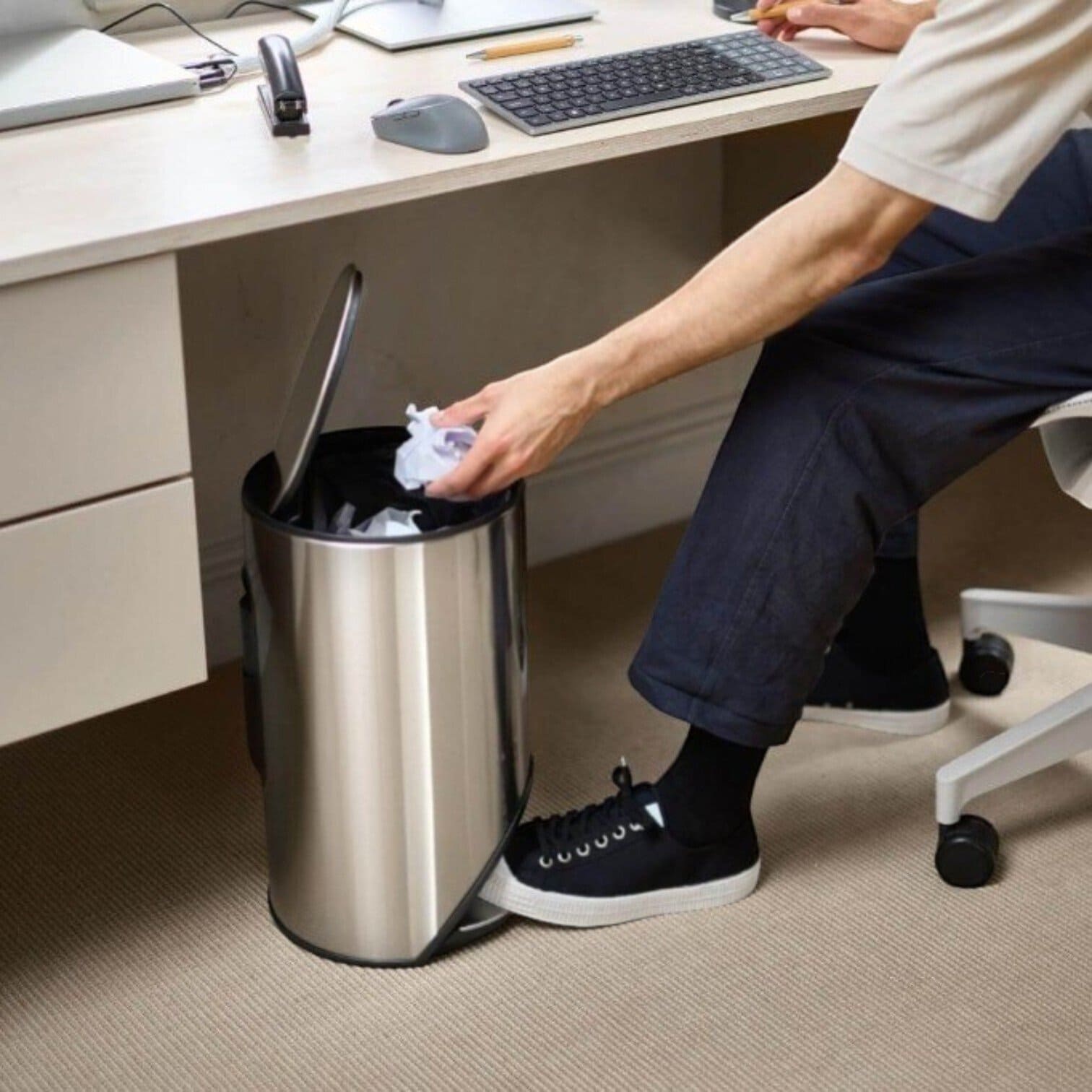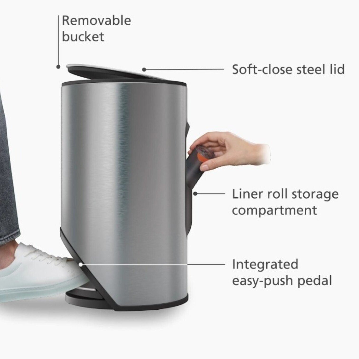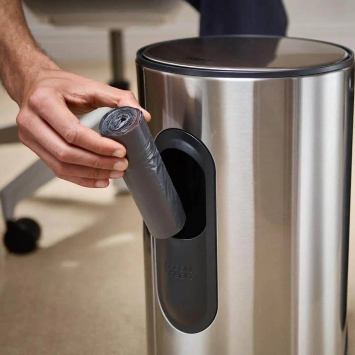 Šai stilīgajai, apaļajai atkritumu tvertnei ir liels pedālis, kas lieliski iekļaujas konstrukcijas izmēros, ietaupot vērtīgu grīdas platību. Turklāt tai aizmugurē ir integrēts uzglabāšanas nodalījums maisiem, kas atvieglo to izmantošanu nepieciešamības gadījumā.