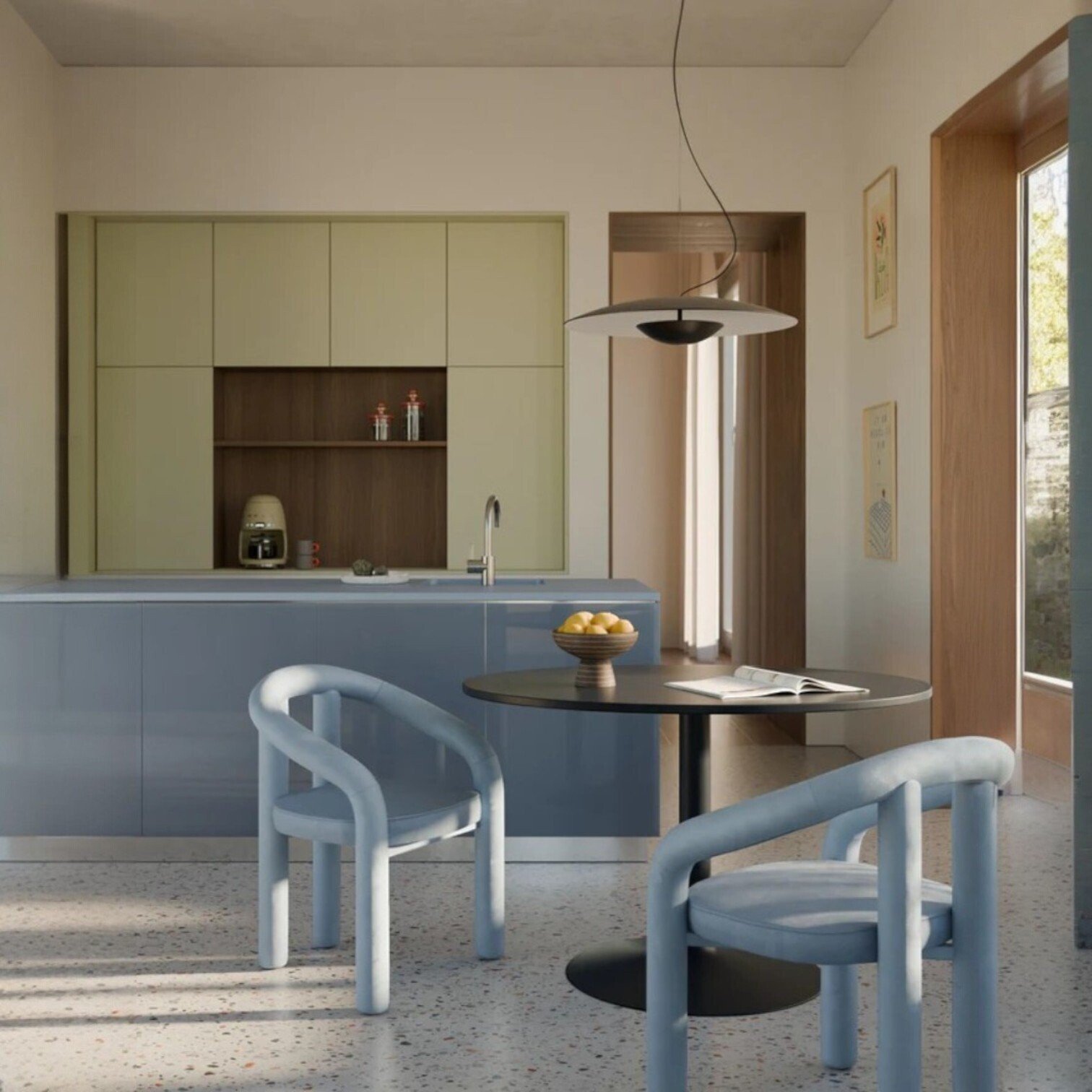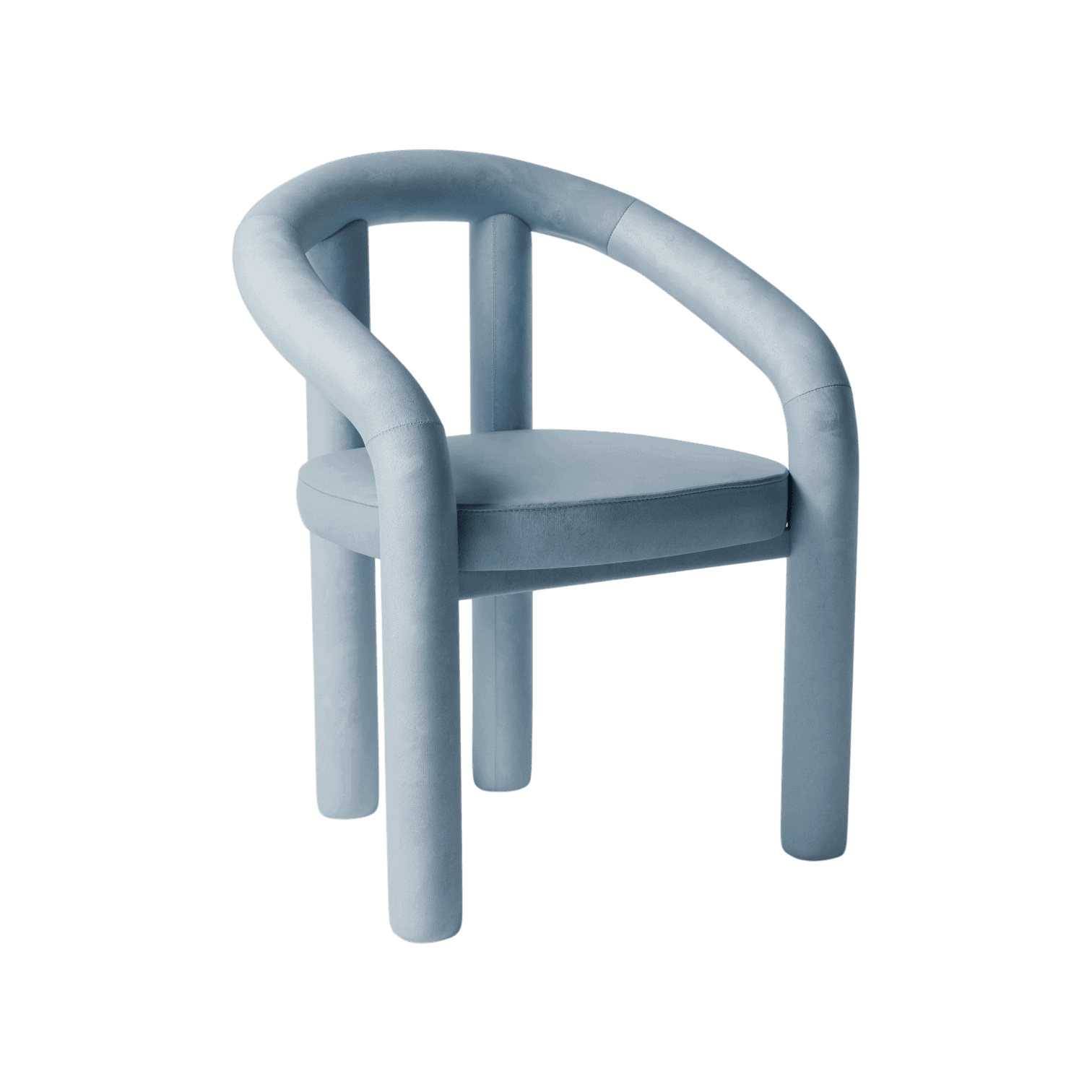 Maigi zilais tonis piešķir mēbelei svaigumu un vizuālu vieglumu, ļaujot tai harmoniski iekļauties gan drosmīgos modernos interjeros, gan minimālisma stilā ieturētās telpās kā spilgtam akcentam.