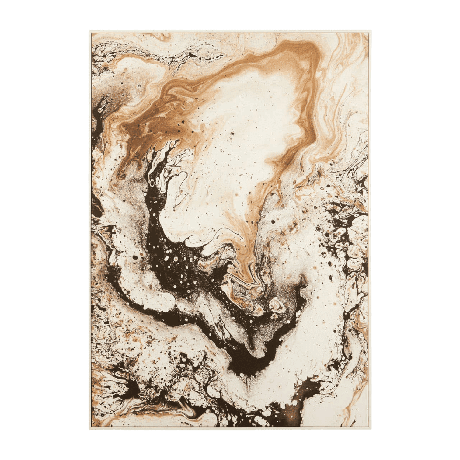 Šis printētais mākslas darbs Astratto Natural iemieso dabas plūstošo spēku un harmoniju abstraktā formā. Silto zemes toņu — smilškrāsas, karameles, brūnā un melnā — nianses savijas organiski, radot sajūtu, kas atgādina marmora dzīslas, minerālu struktūras vai dabisku ainavu no putna lidojuma.