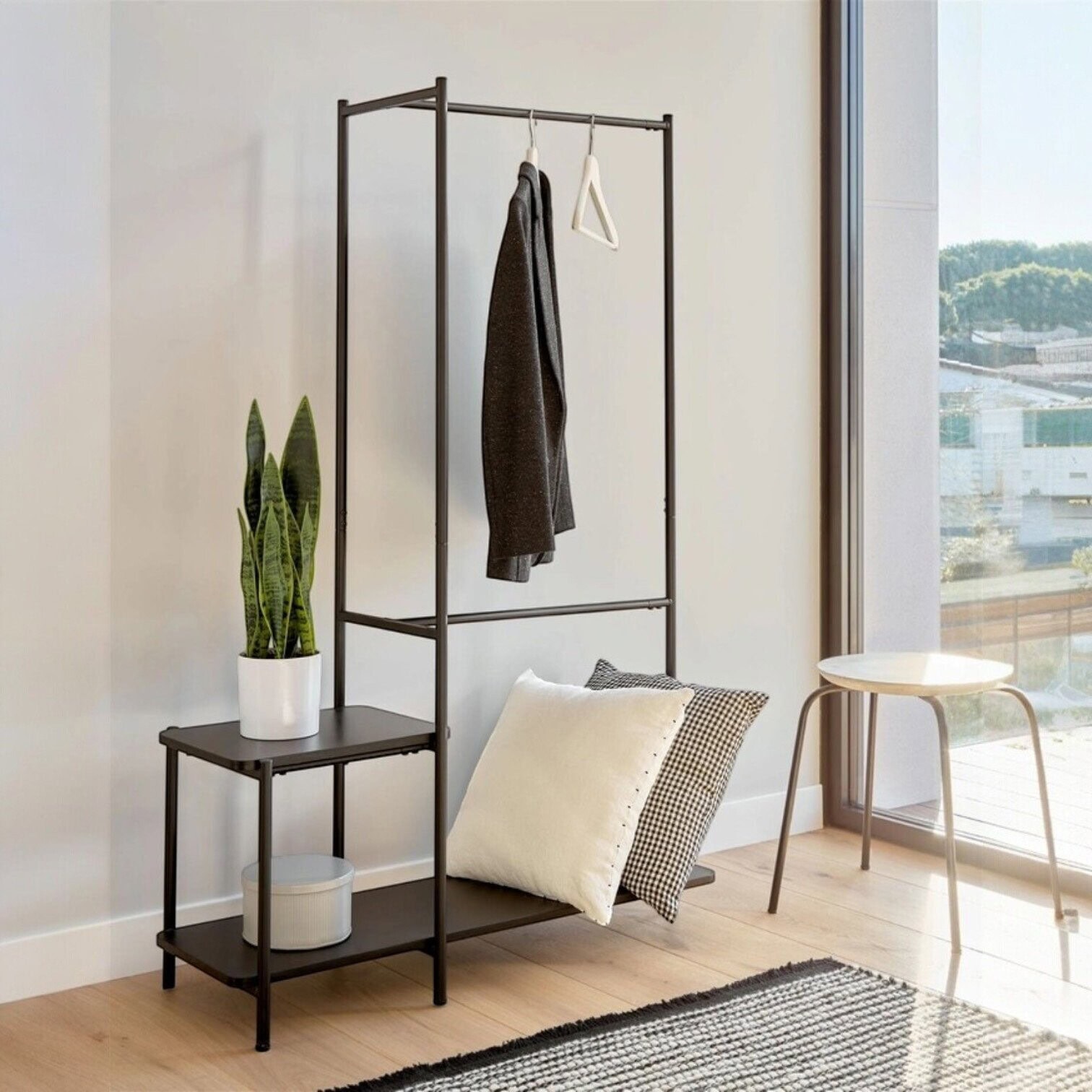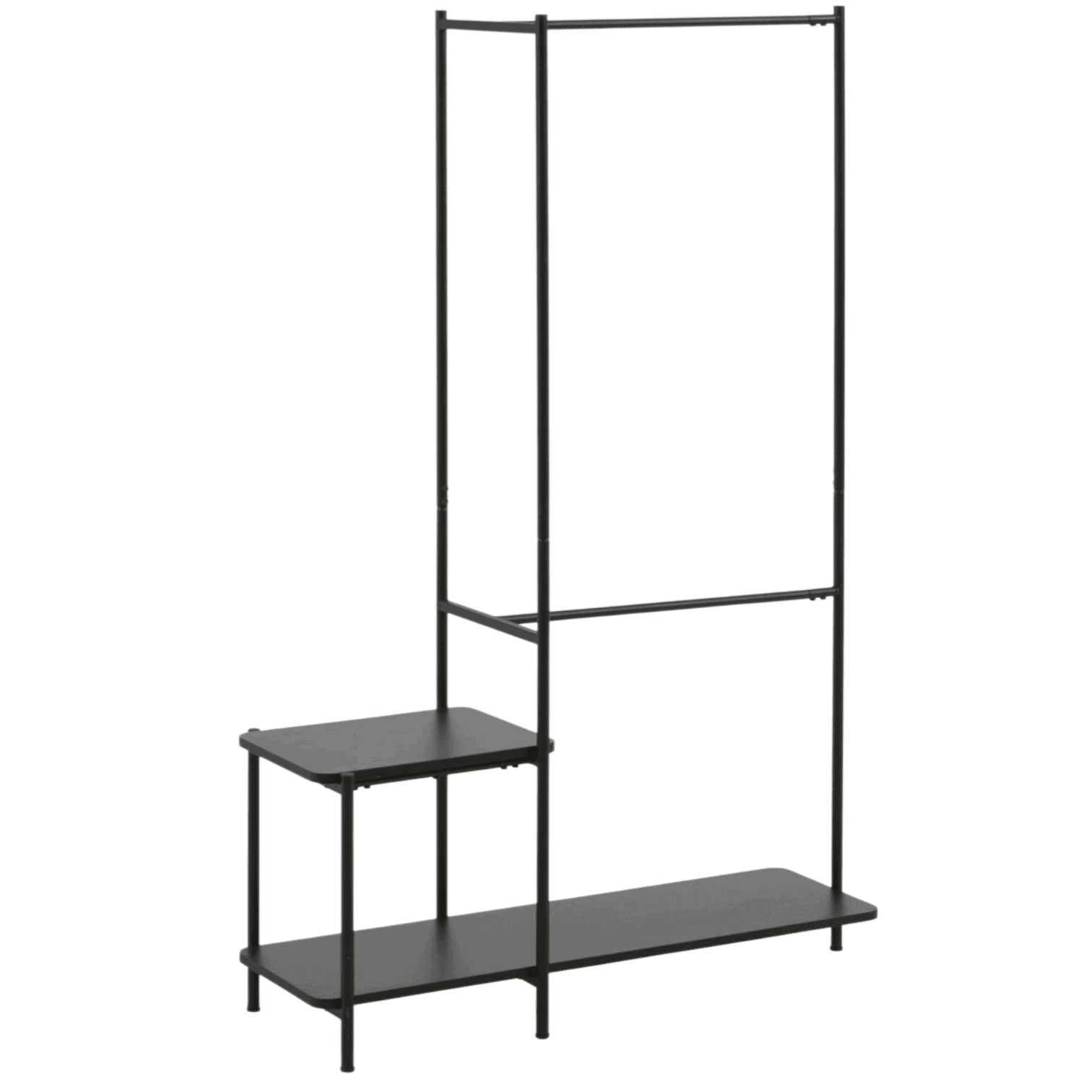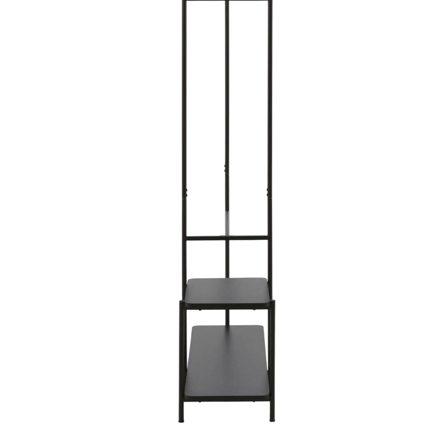 Statīvs aprīkots ar pakaramo stieni virsdrēbēm un vairākiem plauktiem, kas ideāli piemēroti apaviem, somām vai kastēm. Kompaktais, bet ietilpīgais dizains palīdz uzturēt kārtību, vienlaikus piešķirot telpai stilīgu akcentu.