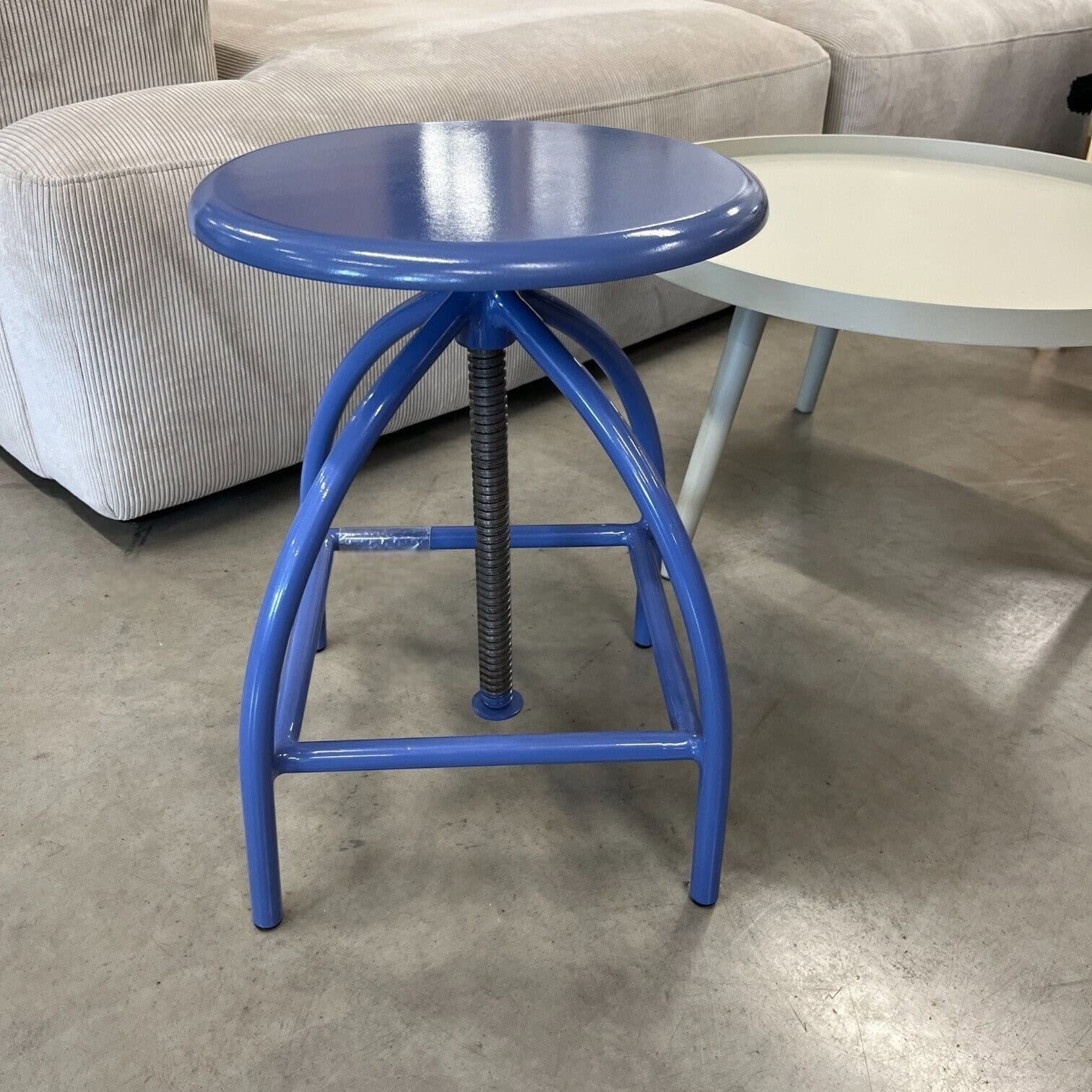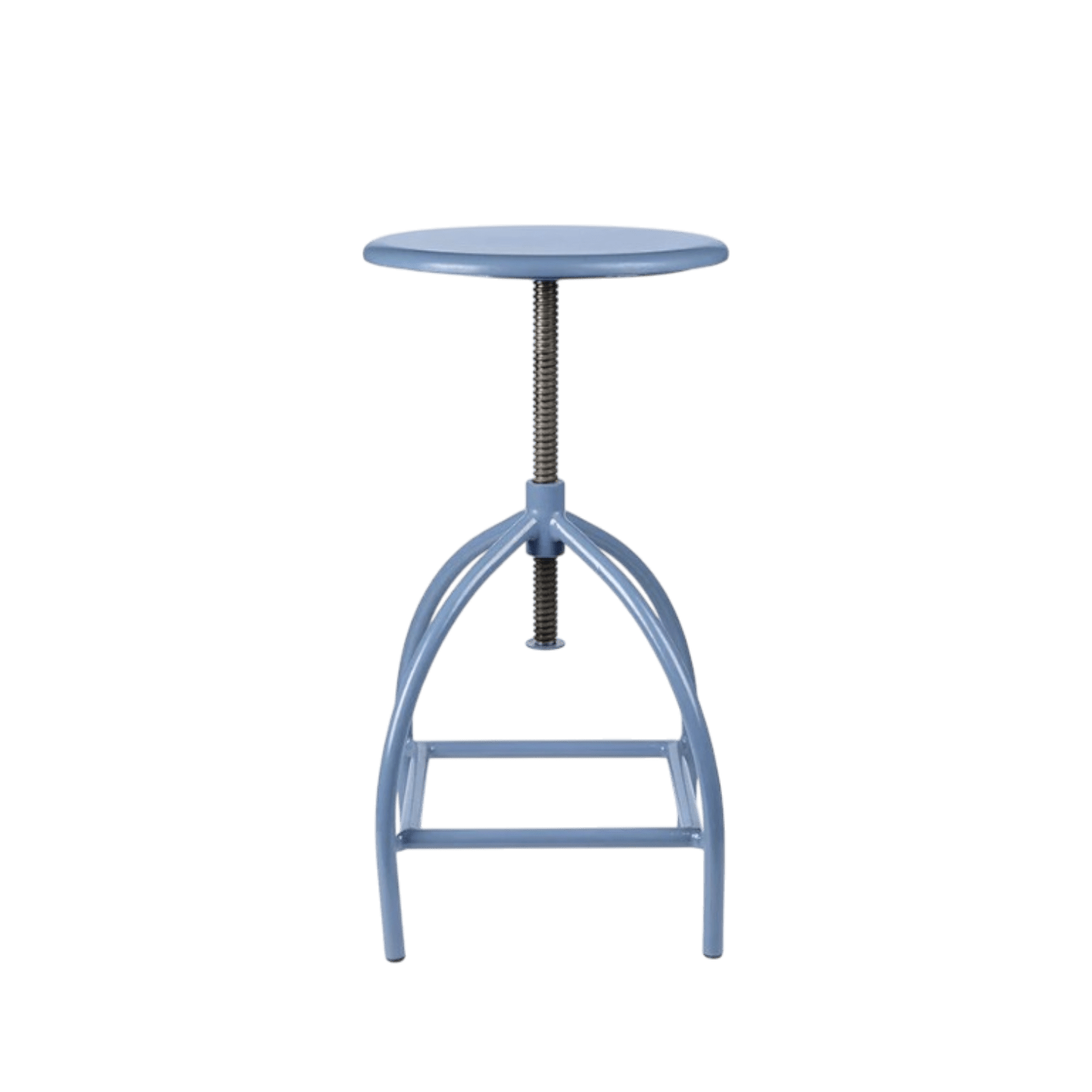 Krēslam ir robusta konstrukcija ar spilgti zilu pulverkrāsotu metāla rāmi un apaļu sēdekli. Vidū esošais vītņu mehānisms ļauj vienkārši pielāgot sēdēšanas augstumu, padarot to ideāli piemērotu dažādām vajadzībām – no virtuves bāra līdz darba galdam.