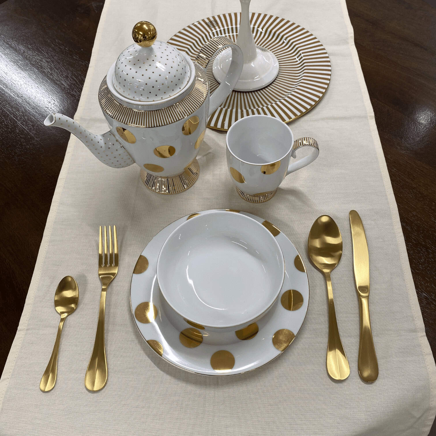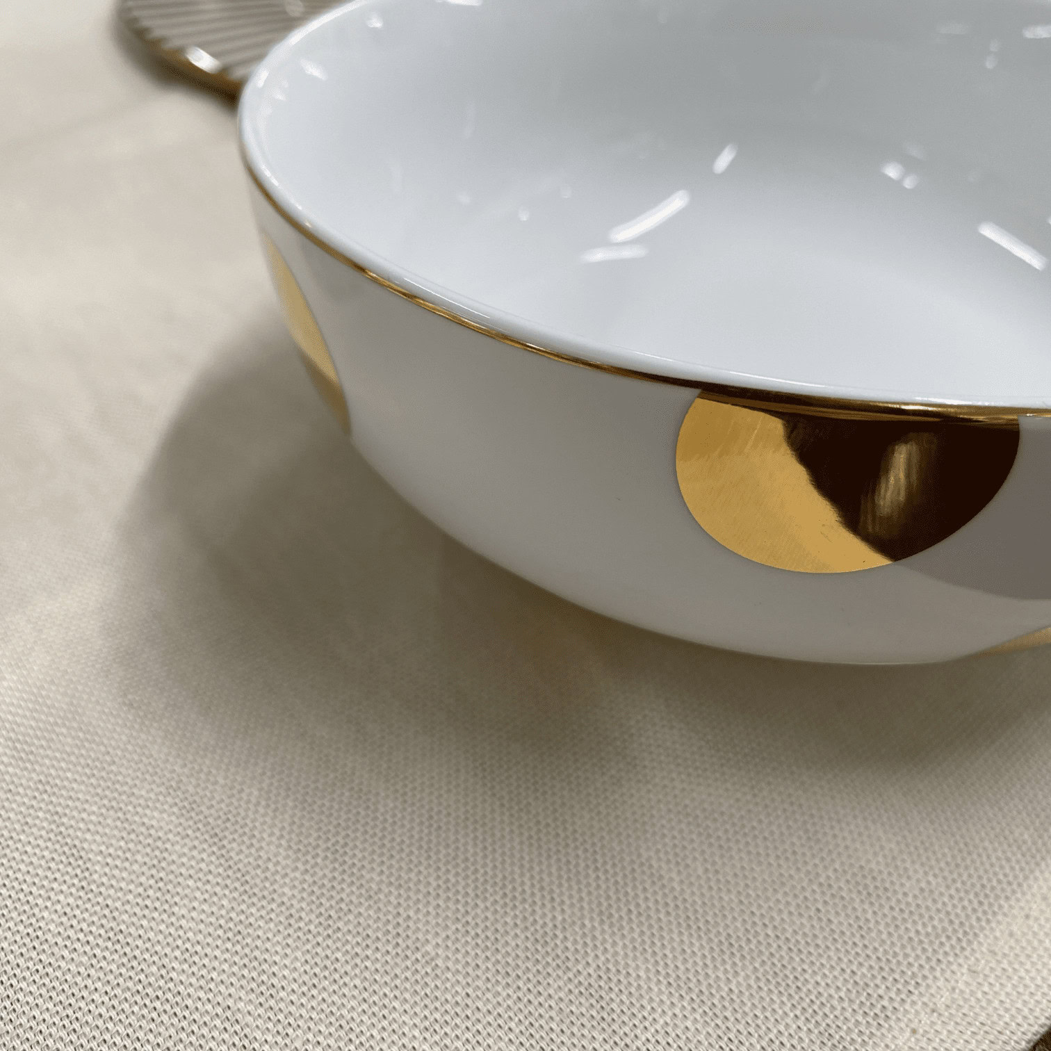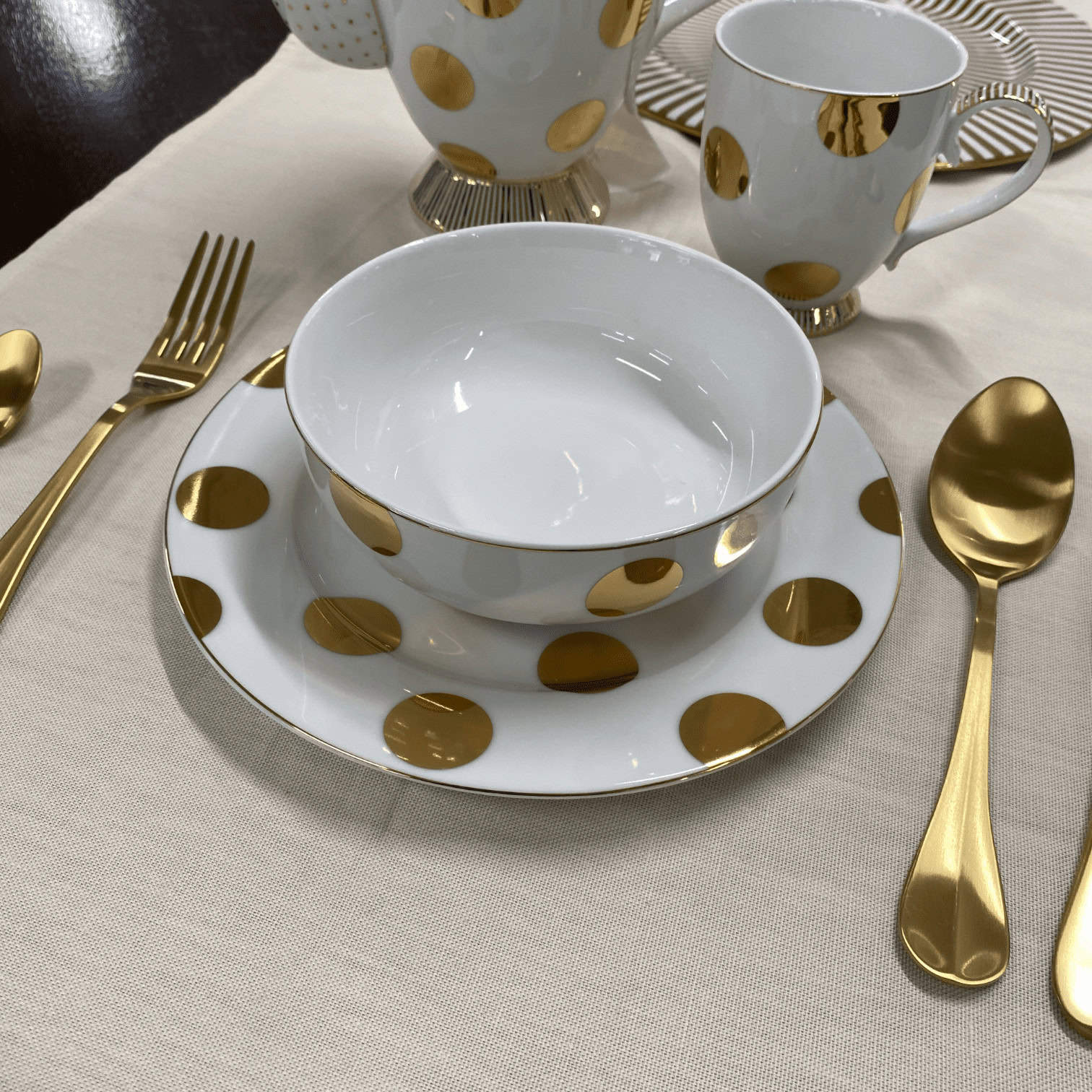 Bļoda ir izstrādāta ar zelta maliņu. Dot Delight galda priekšmeti piešķir elegances un svētku pieskārienu jebkurai maltītei, padarot to par perfektu izvēli īpašiem notikumiem.