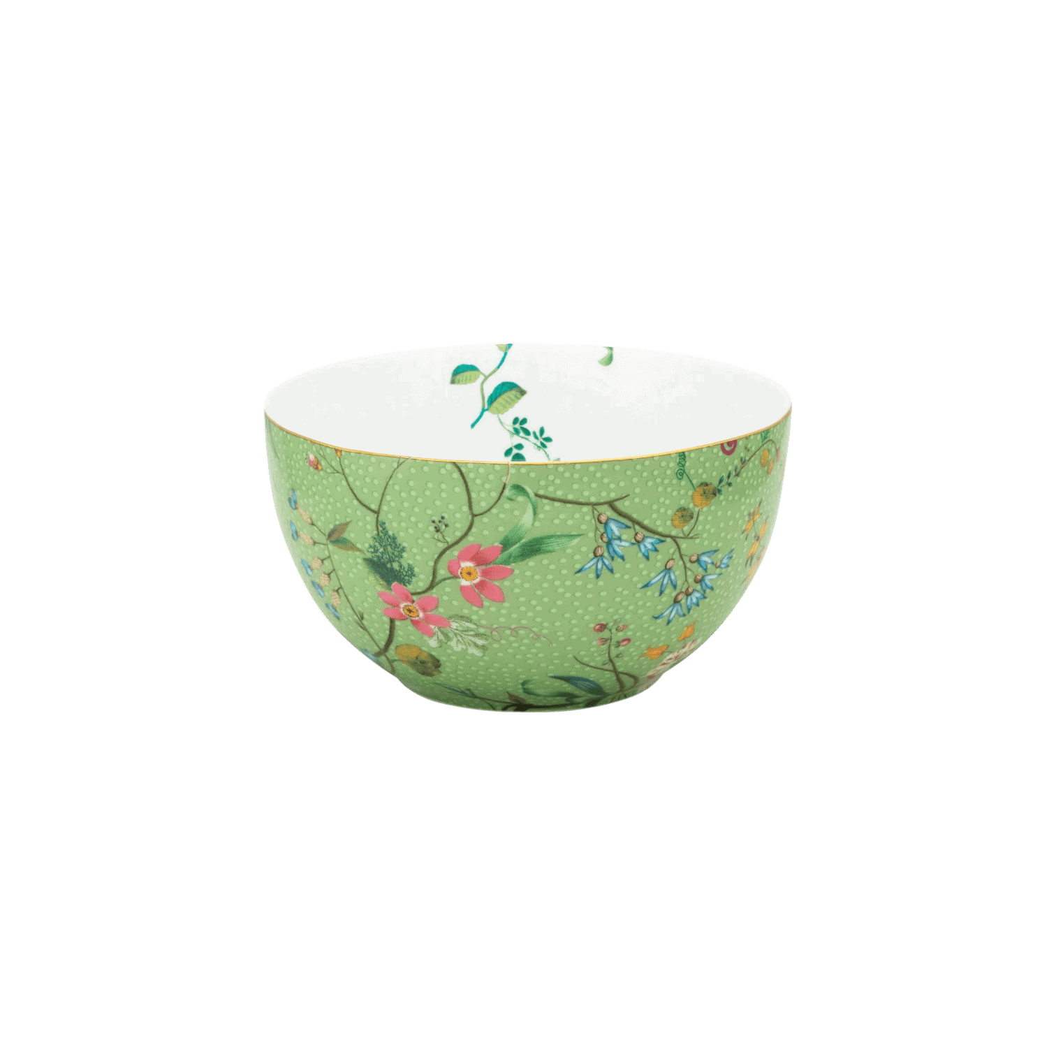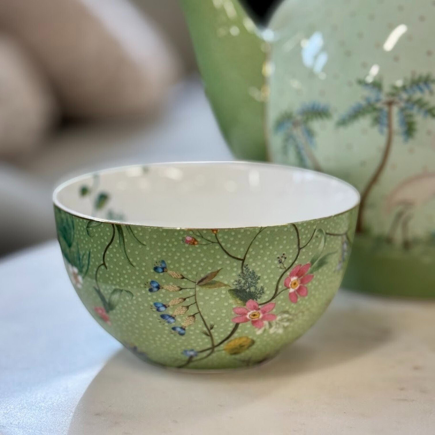 Pievienojiet savam galdam svaigu un vasarīgu noskaņu ar Jolie Flowers Green bļodu 12 cm diametrā. Šī elegantā bļoda, izgatavota no augstas kvalitātes porcelāna, izceļas ar zaļu pamatkrāsu, ko rotā smalks ziedu raksts ar košām, tropiski iedvesmotām krāsām. Dekors apvieno augus, krāšņus ziedus un smalkus zelta akcentus, piešķirot bļodai izsmalcinātu un mūsdienīgu izskatu.