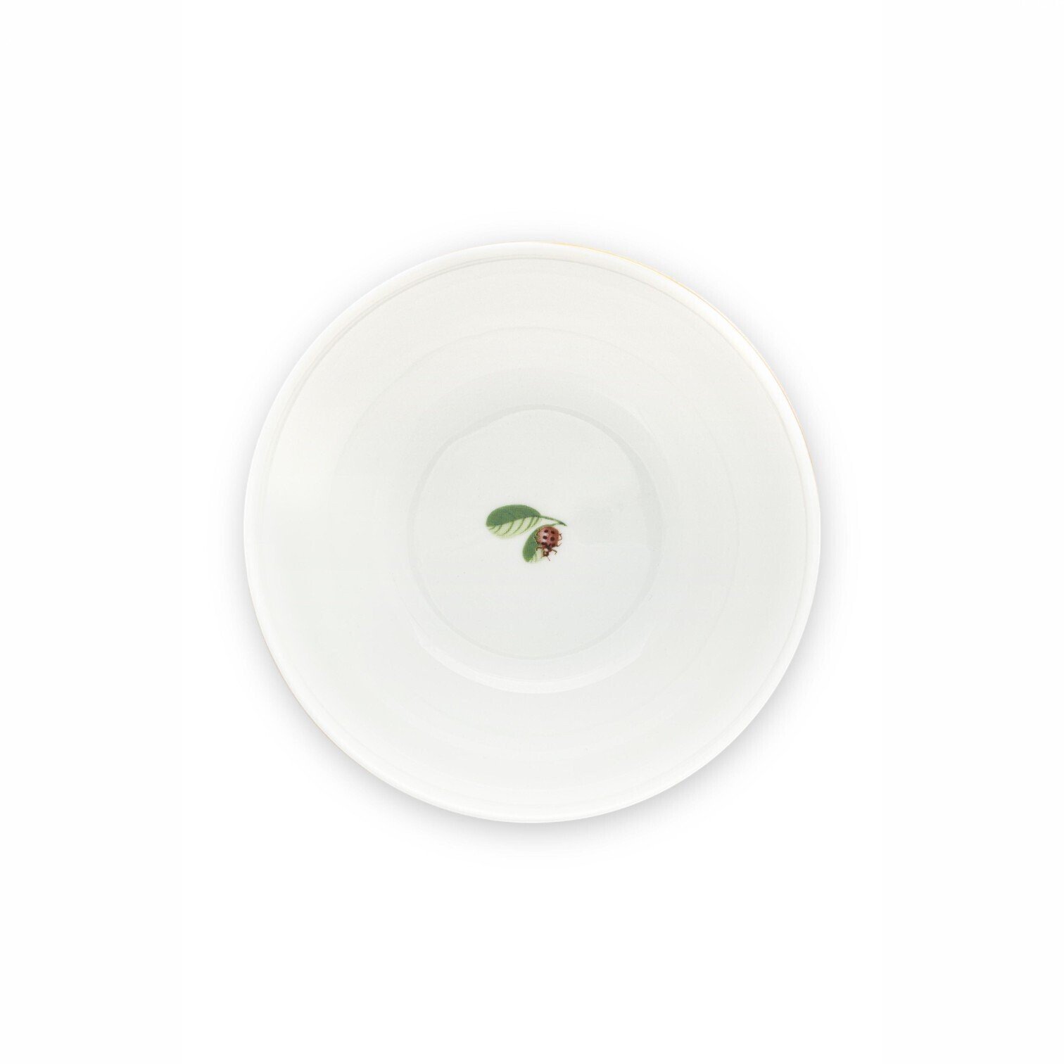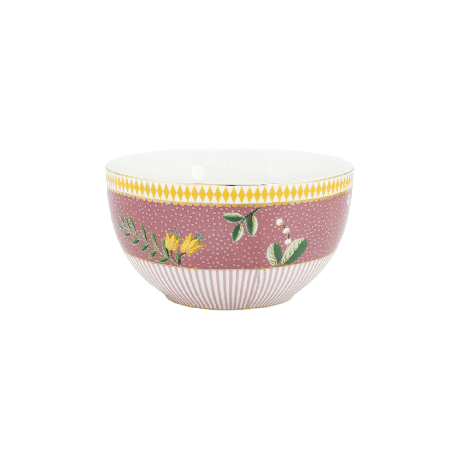 Šī rozā porcelāna bļoda visapkārt ir dekorēta ar eksotiskiem ziediem un zelta detaļām uz rozā fona.