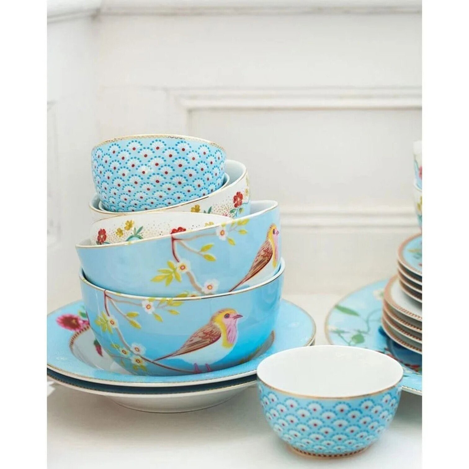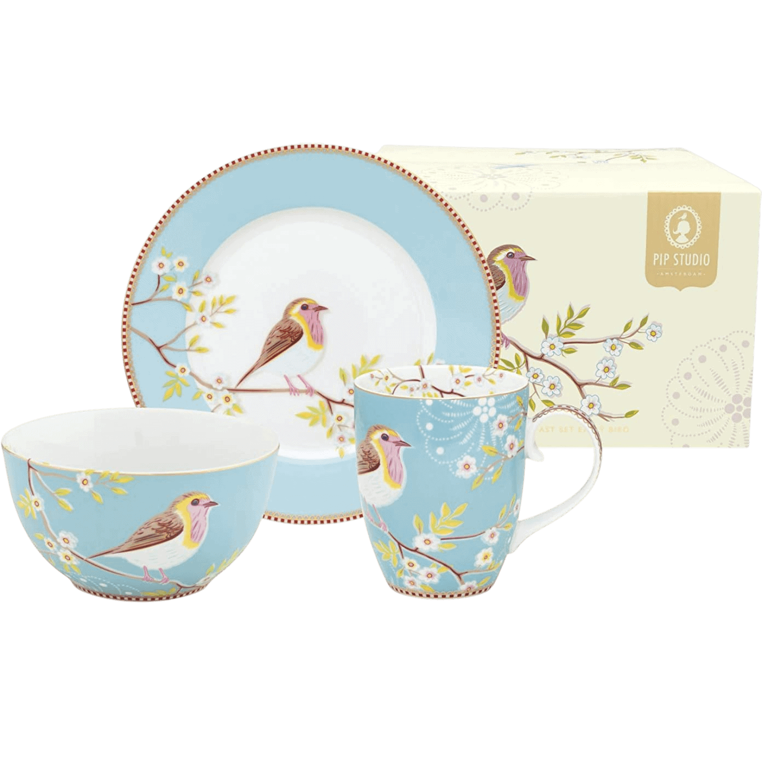 Šis burvīgais PIP Studio brokastu komplekts “Early Bird” piešķirs Jūsu rītam īpašu noskaņu. Komplekts sastāv no šķīvja, bļodiņas un krūzes, un katrs no priekšmetiem ir rotāts ar ikonisko Early Bird dizainu — košu, rotaļīgu putniņu, kas sēž uz ziedoša zara. Maigi zilais tonis apvienojumā ar smalkiem ziedu rakstiem un zelta akcentiem piešķir komplektam greznu un sievišķīgu izskatu.