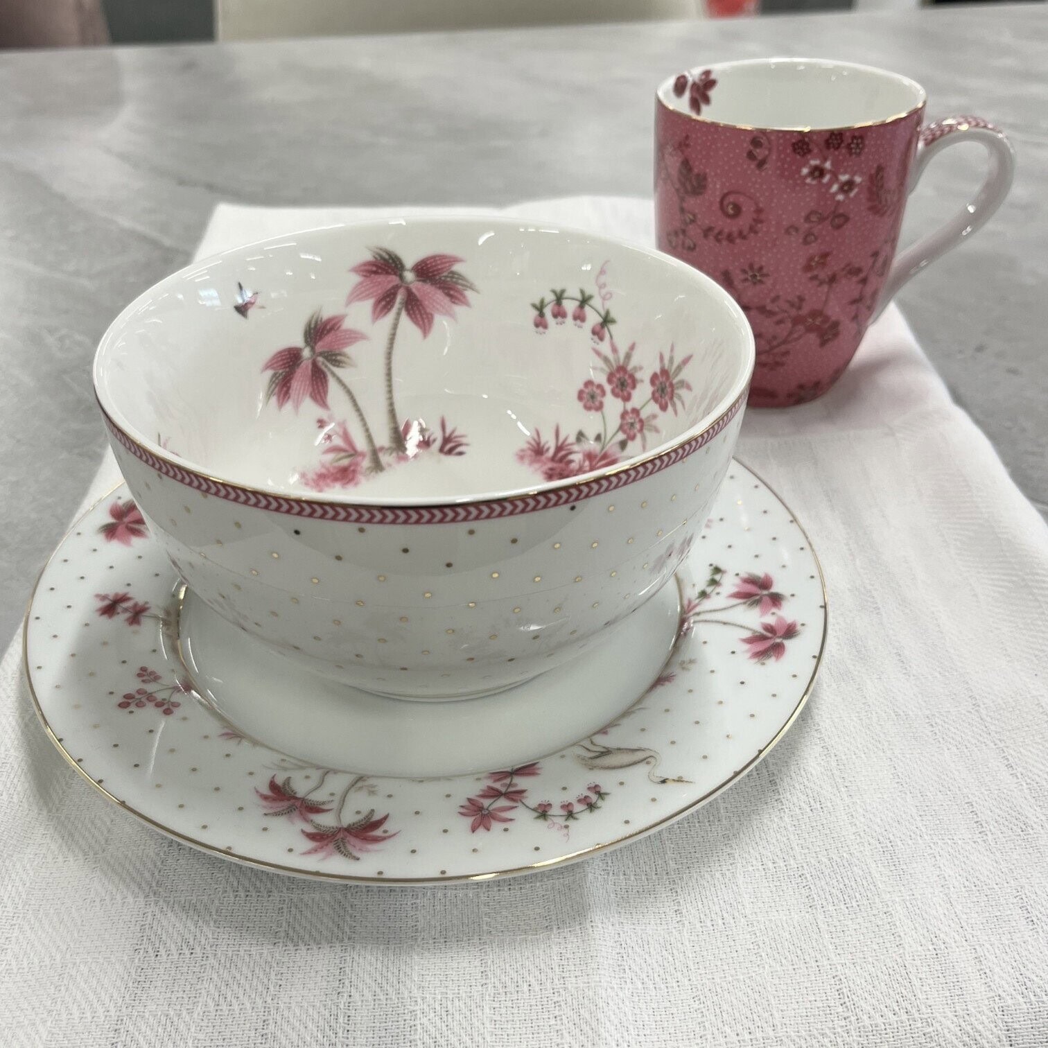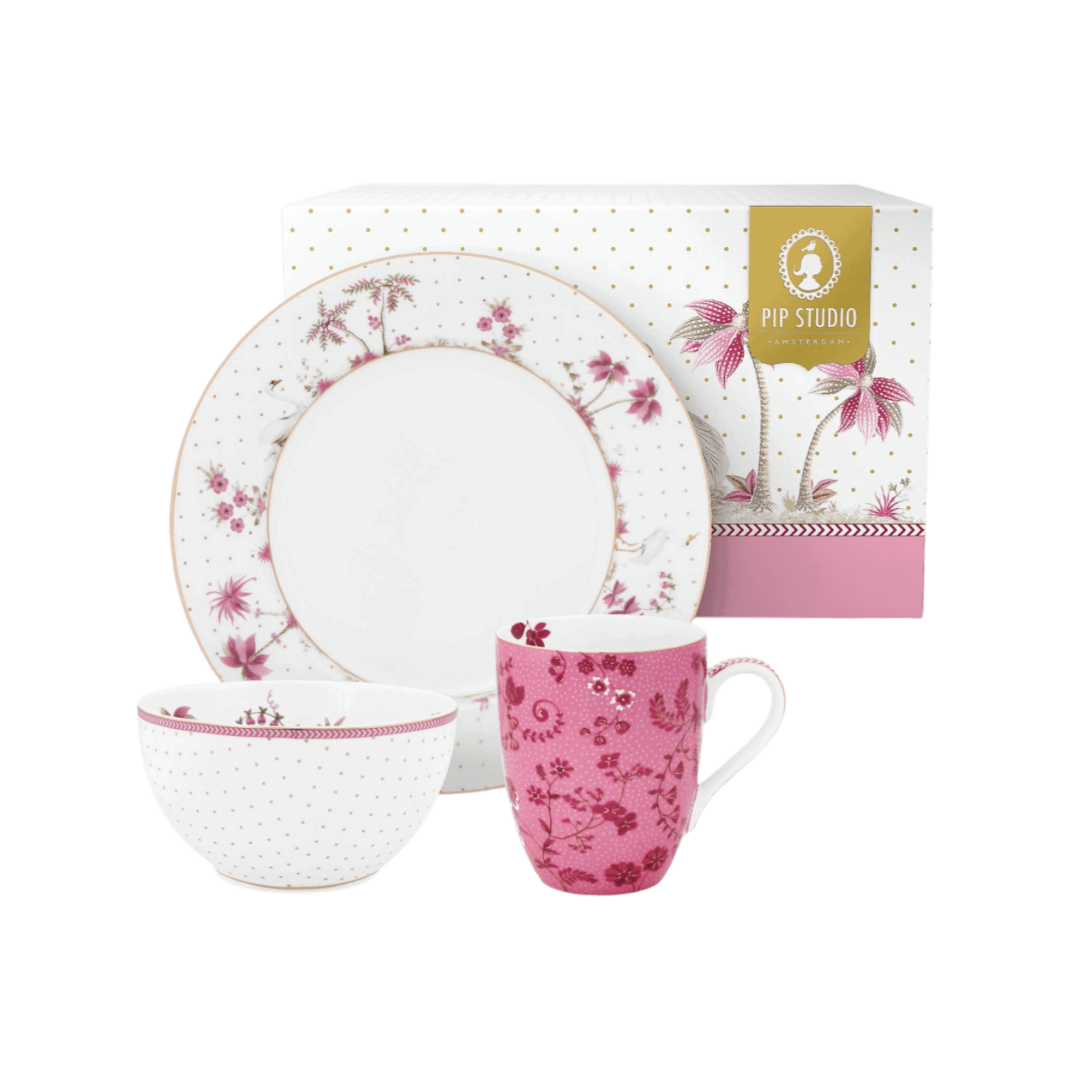 Brokastu komplekts Jolie Pink no Pip studio. Izbaudiet gardas brokastis ar šo brokastu komplektu, kas sastāv no 3 priekšmetiem no Jolie kolekcijas. Komplektā ietilpst brokastu šķīvis, bļoda un liela krūze. Galda piederumi ir rotāti ar smalkiem zelta punktiņiem, elegantiem ziediem, augiem un dzīvniekiem, piešķirot tiem romantisku un sapņainu izskatu.