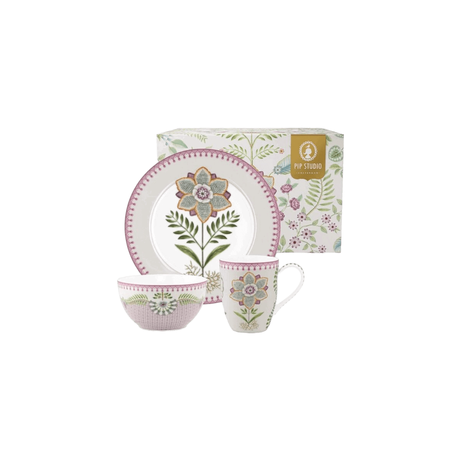 Izbaudiet gardas brokastis ar šo brokastu komplektu. Šis komplekts sastāv no brokastu šķīvja, bļodas un lielas krūzes.