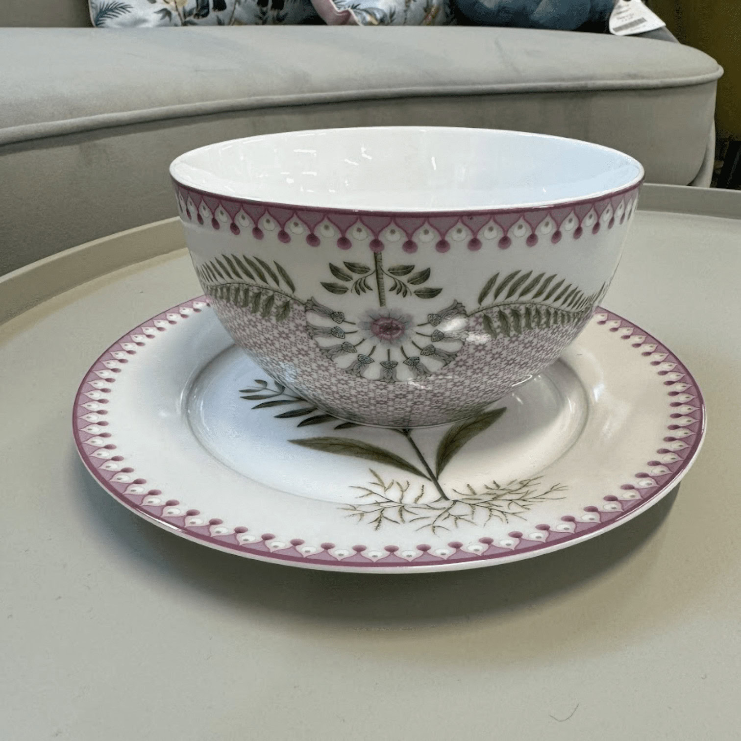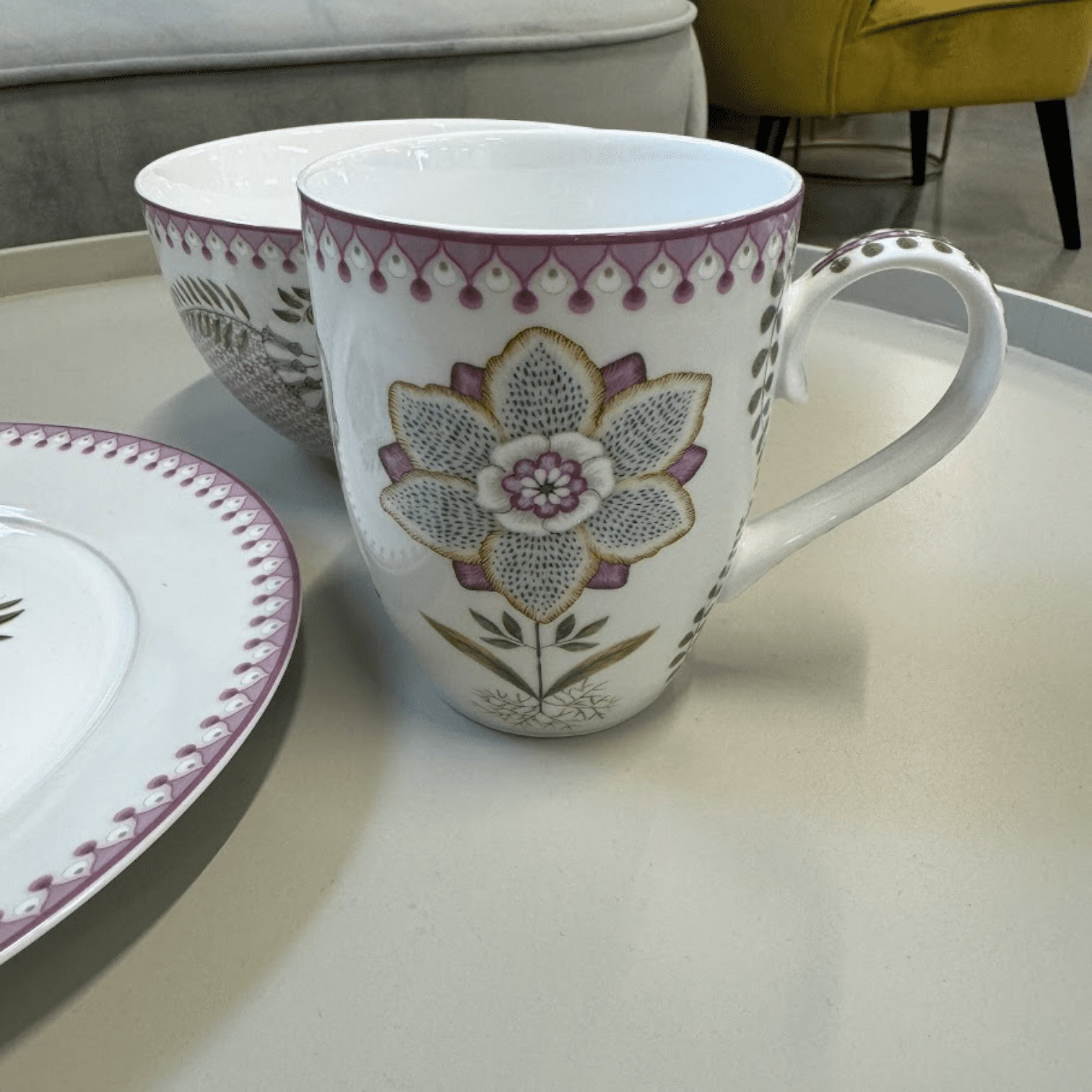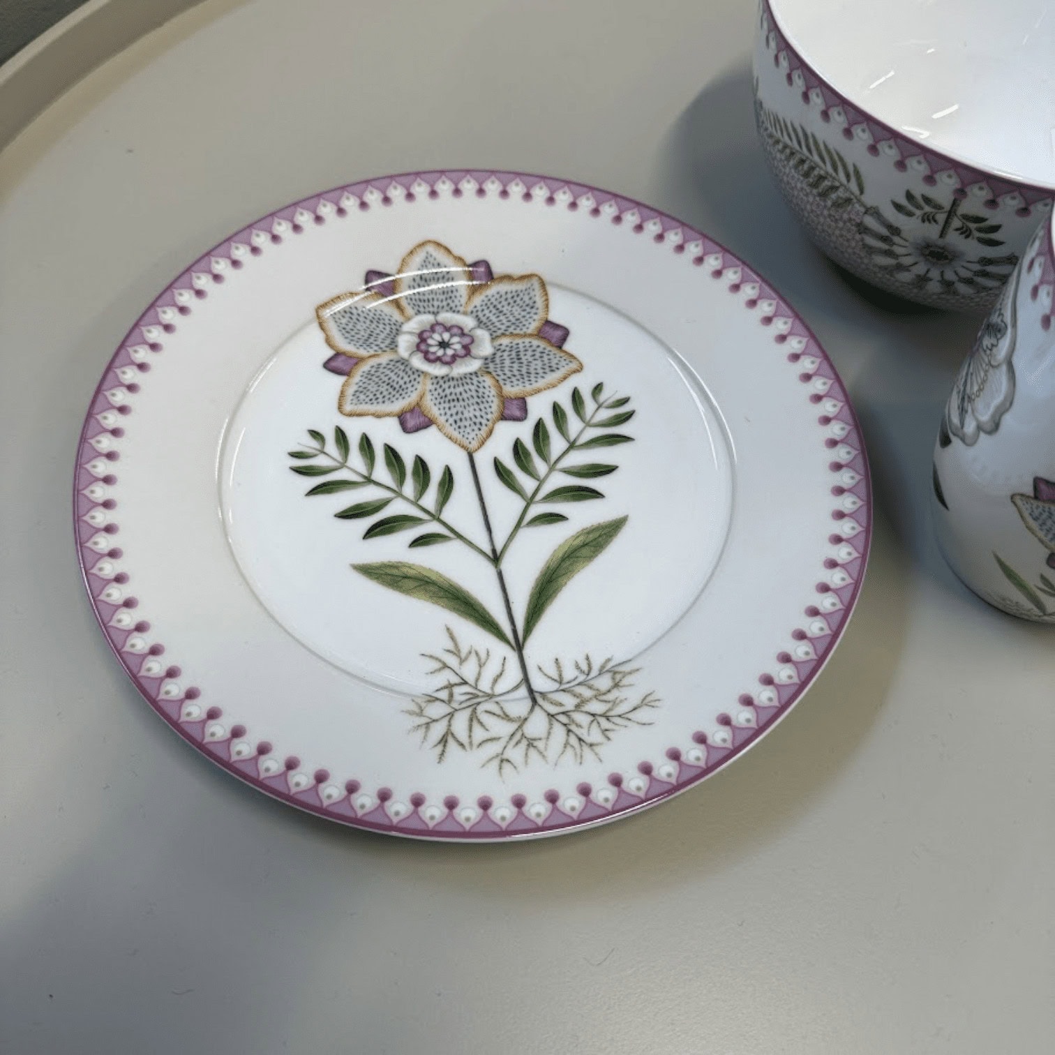 Trauki ir dekorēti ar lielām, tēlainām lilijām, lotosa lapām un pienenēm pasteļtoņos. Ziedi un graciozās papardes ir izvietotas simetriski, piešķirot šiem elegantajiem traukiem mūsdienīgu izskatu.