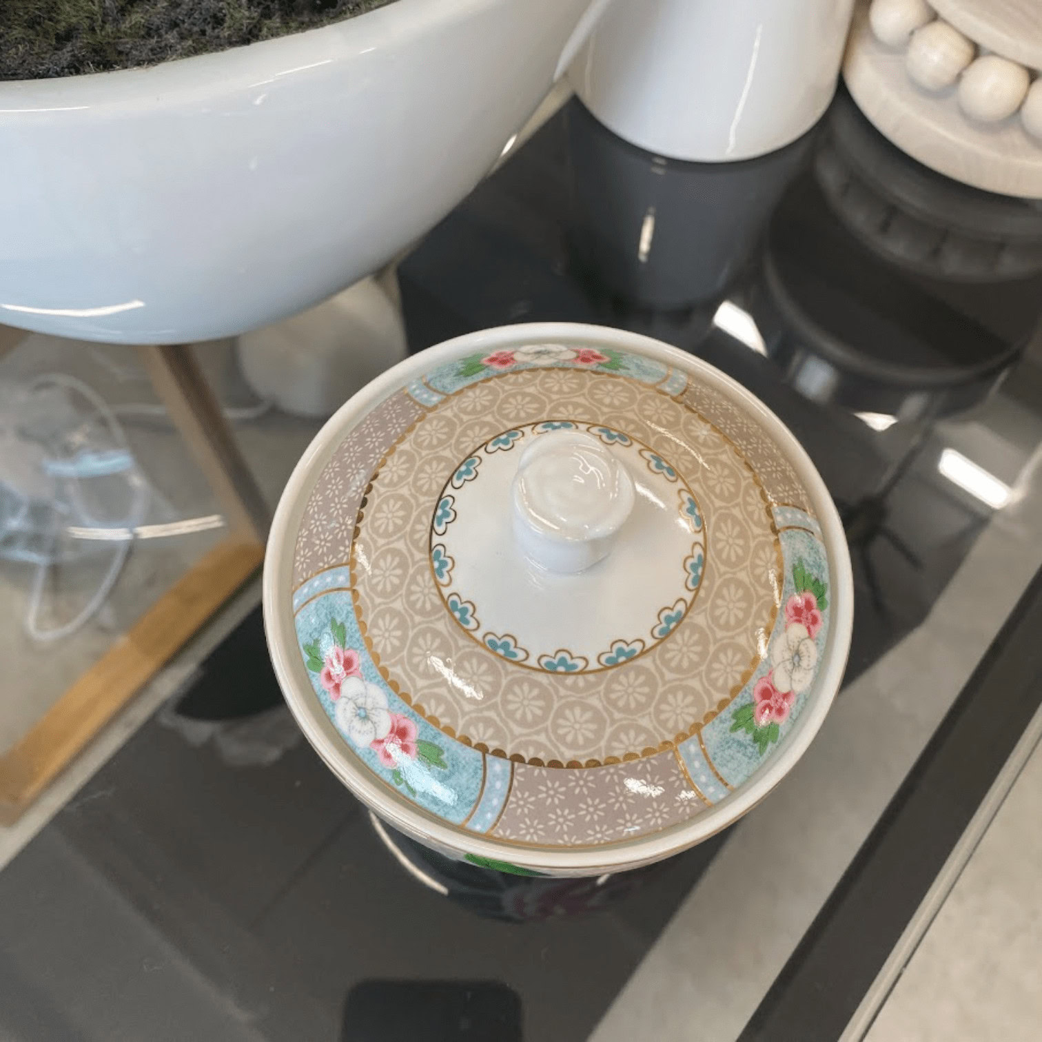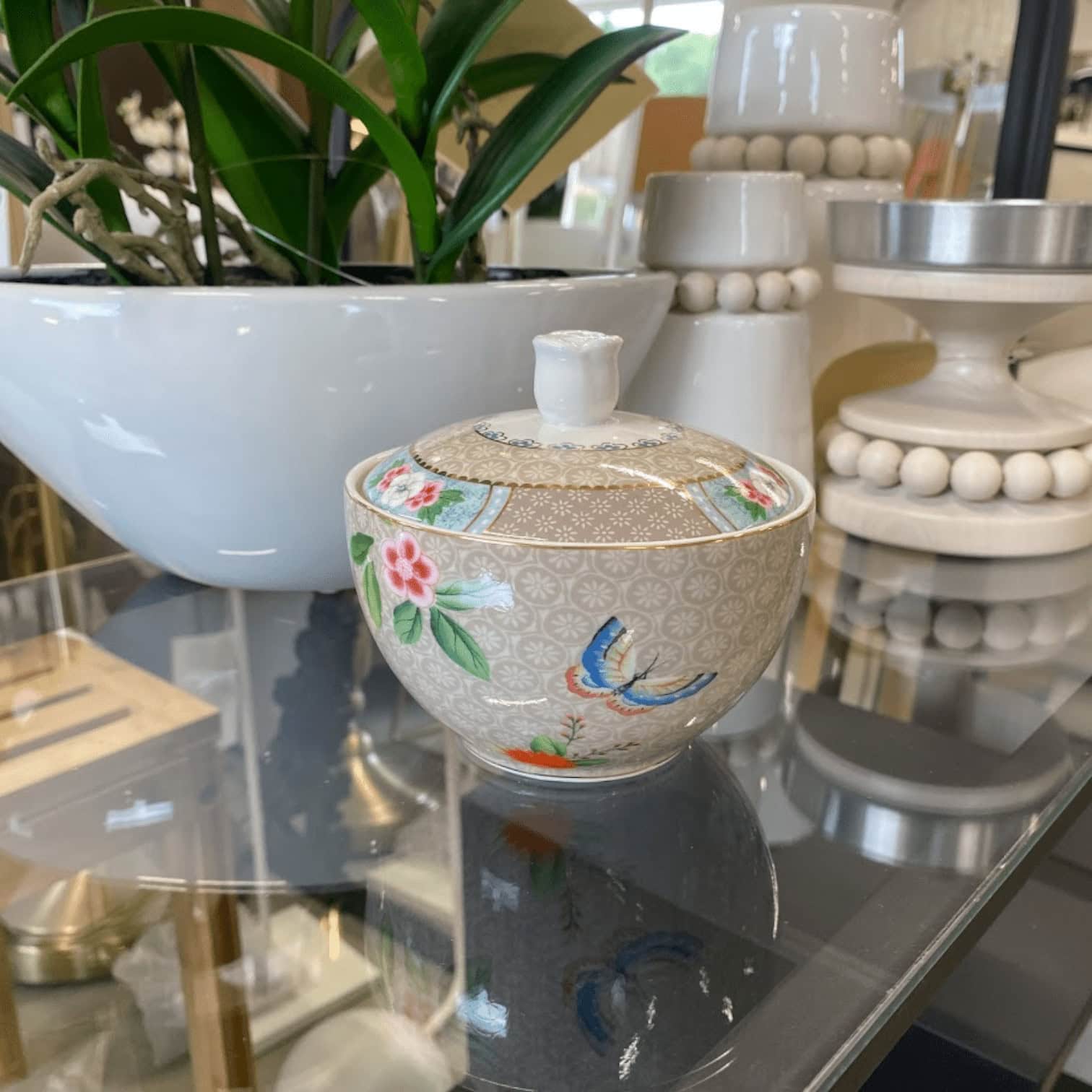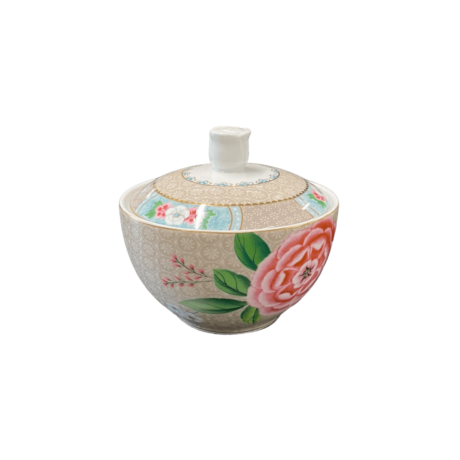 Šo haki krāsas cukura trauku rotā eksotiski ziedi, zelta detaļas un krāsains tauriņš. Fonam ir elegants raksts, un vāka augšdaļu rotā porcelāna roze. Skaisti sader ar citiem kolekcijas Blushing Birds kafijas un tējas komplektiem.