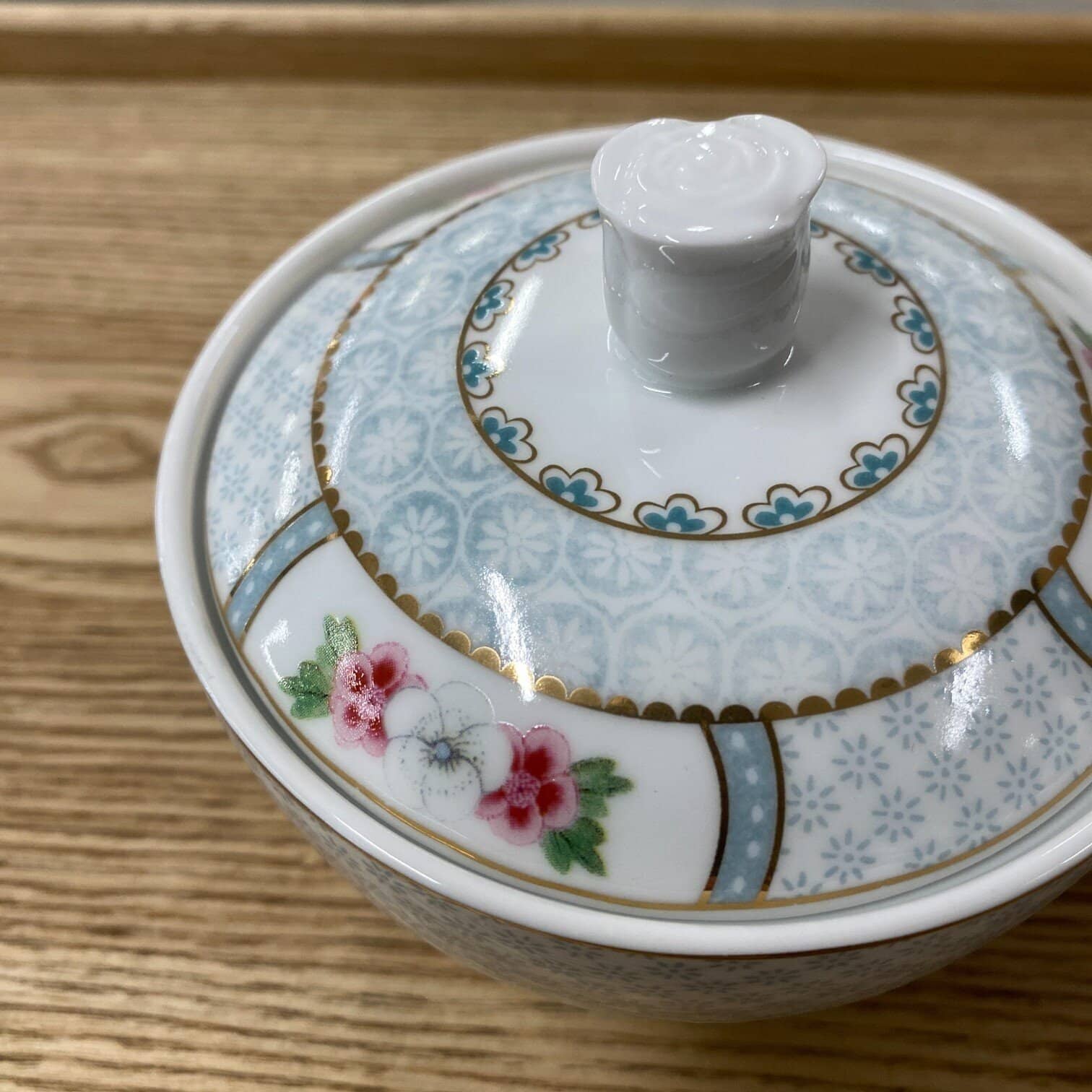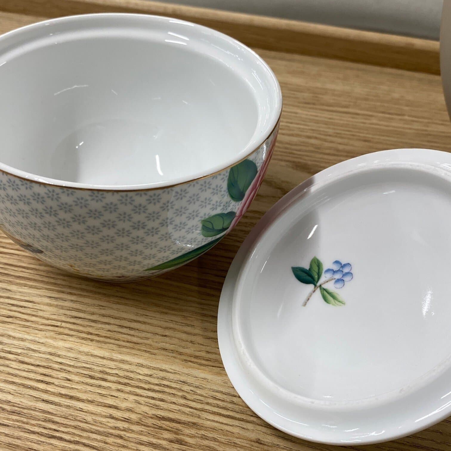 Šo zilo cukurtrauku rotā eksotiski ziedi, zelta detaļas un krāsains tauriņš. Uz fona ir eleganta apdruka, un vāka augšdaļu rotā porcelāna roze. Iekšpuse ir dekorēta ar dizainisku elementu. Lieliski apvienojas ar citiem kafijas un tējas komplektiem no Blushing Birds kolekcijas.