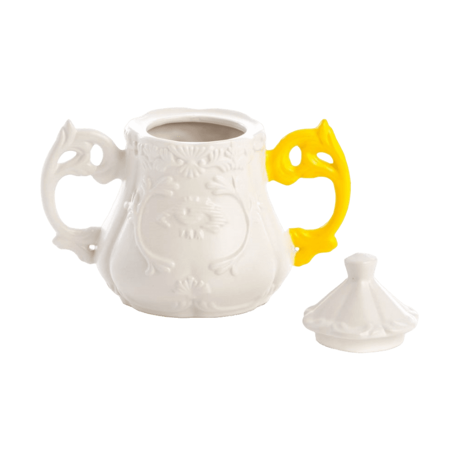 Smalks, necaurspīdīgs porcelāns ar matēti baltu apdari un fluorescējošas krāsas rokturiem.