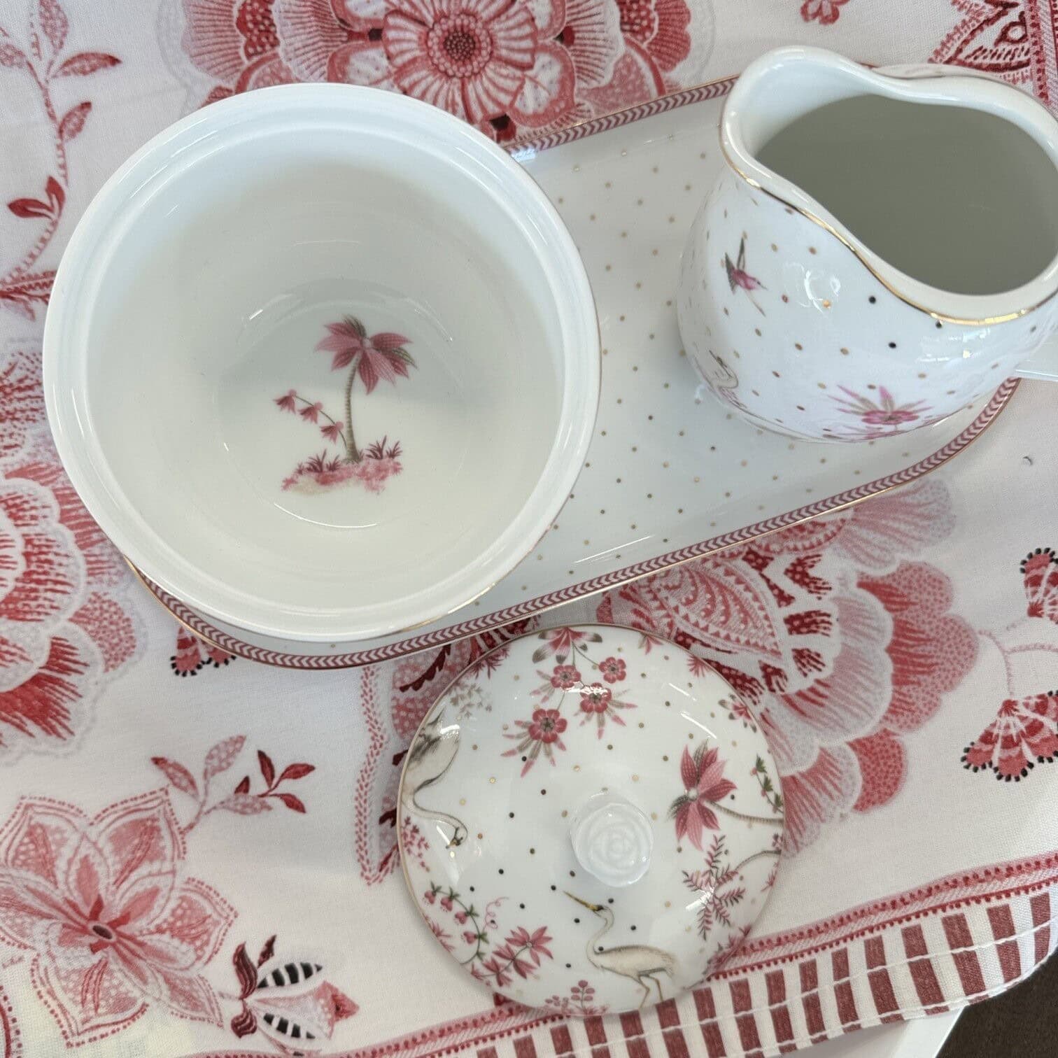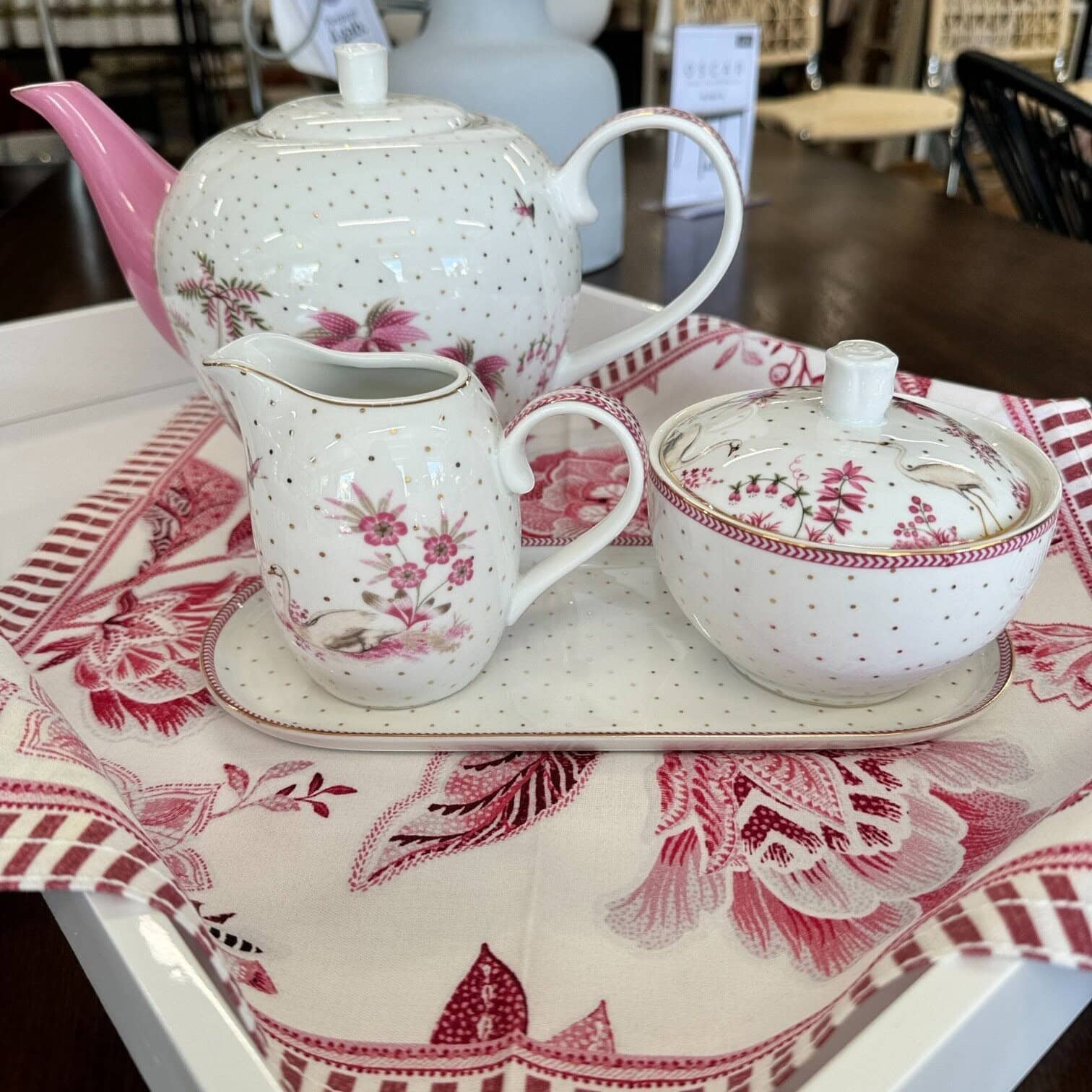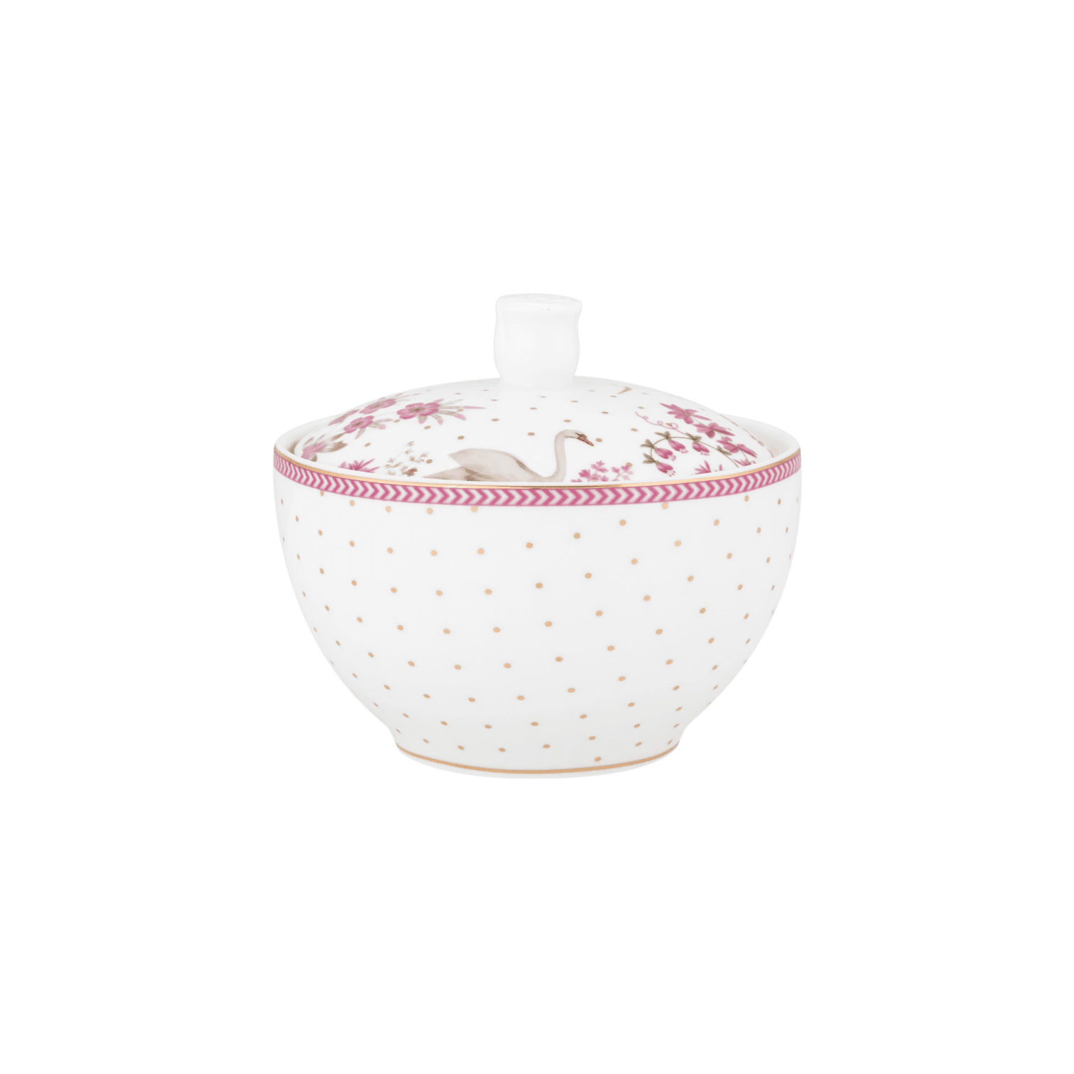 Cukurtrauks Jolie Dots Gold Pink no Pip Stdio. Šī dzīvespriecīgais cukurtrauksa ir lielisks papildinājums kafijas un tējas cienītājiem. Cukurtrauku rotā smalki zelta punktiņi, eleganti ziedi un gulbis. Mala ir pabeigta ar rozā detaļām.