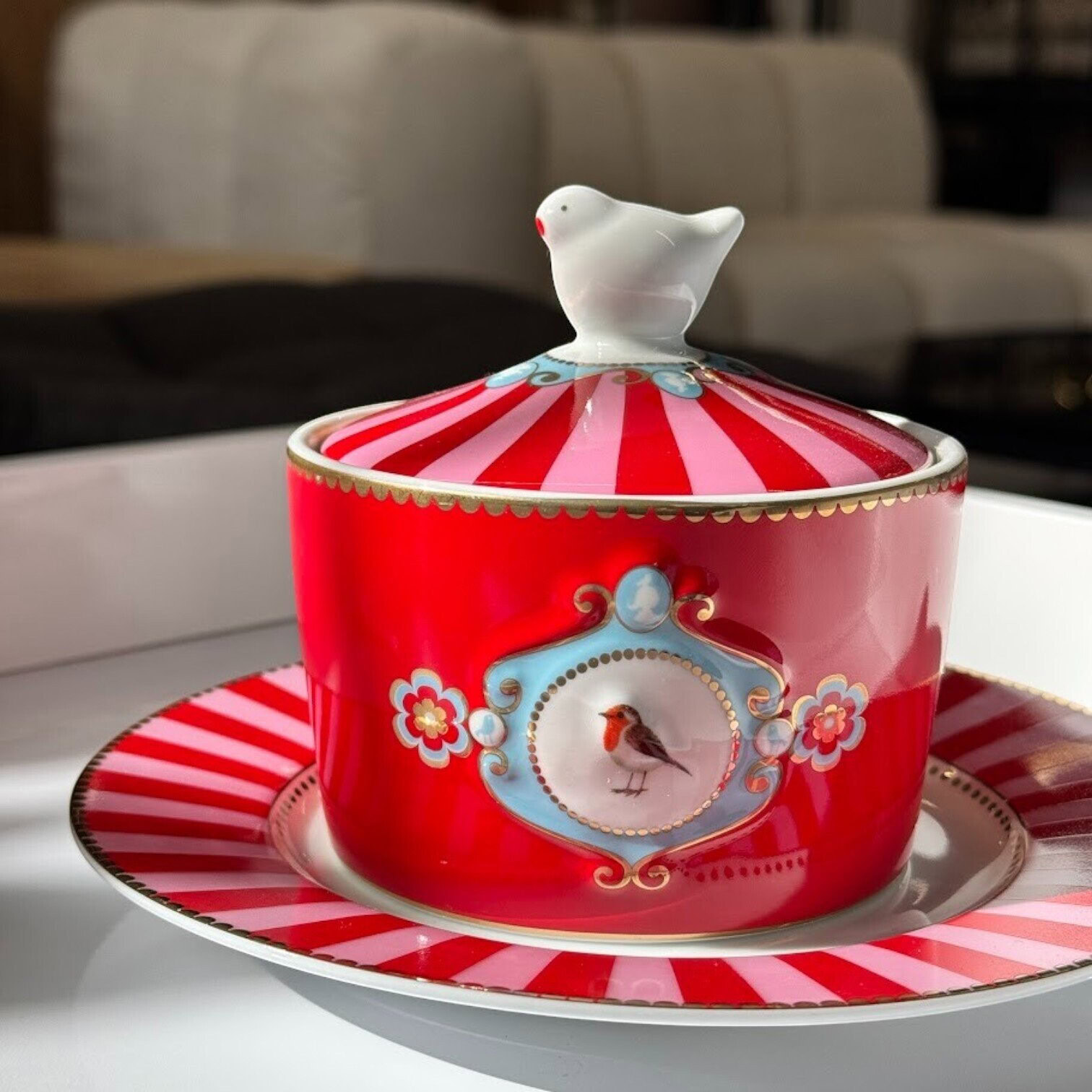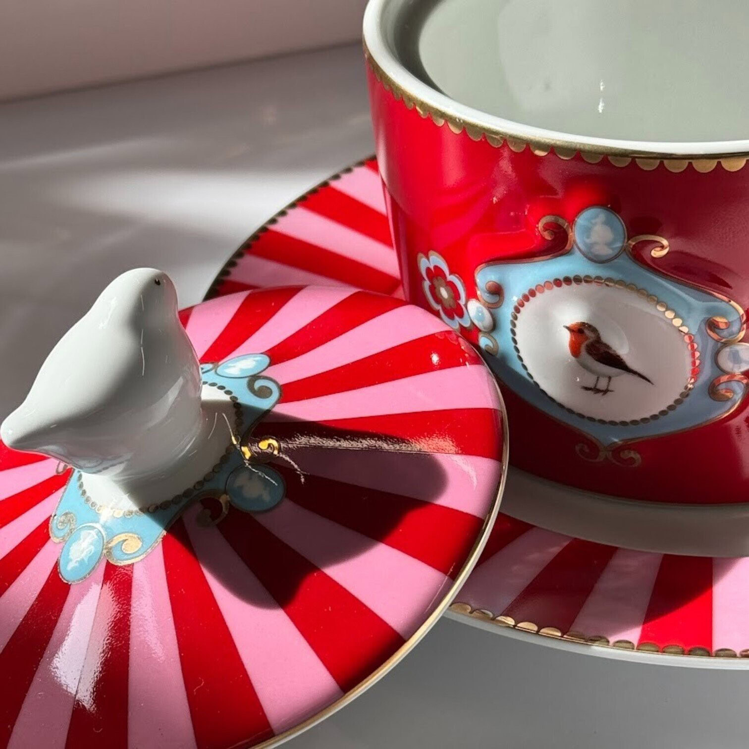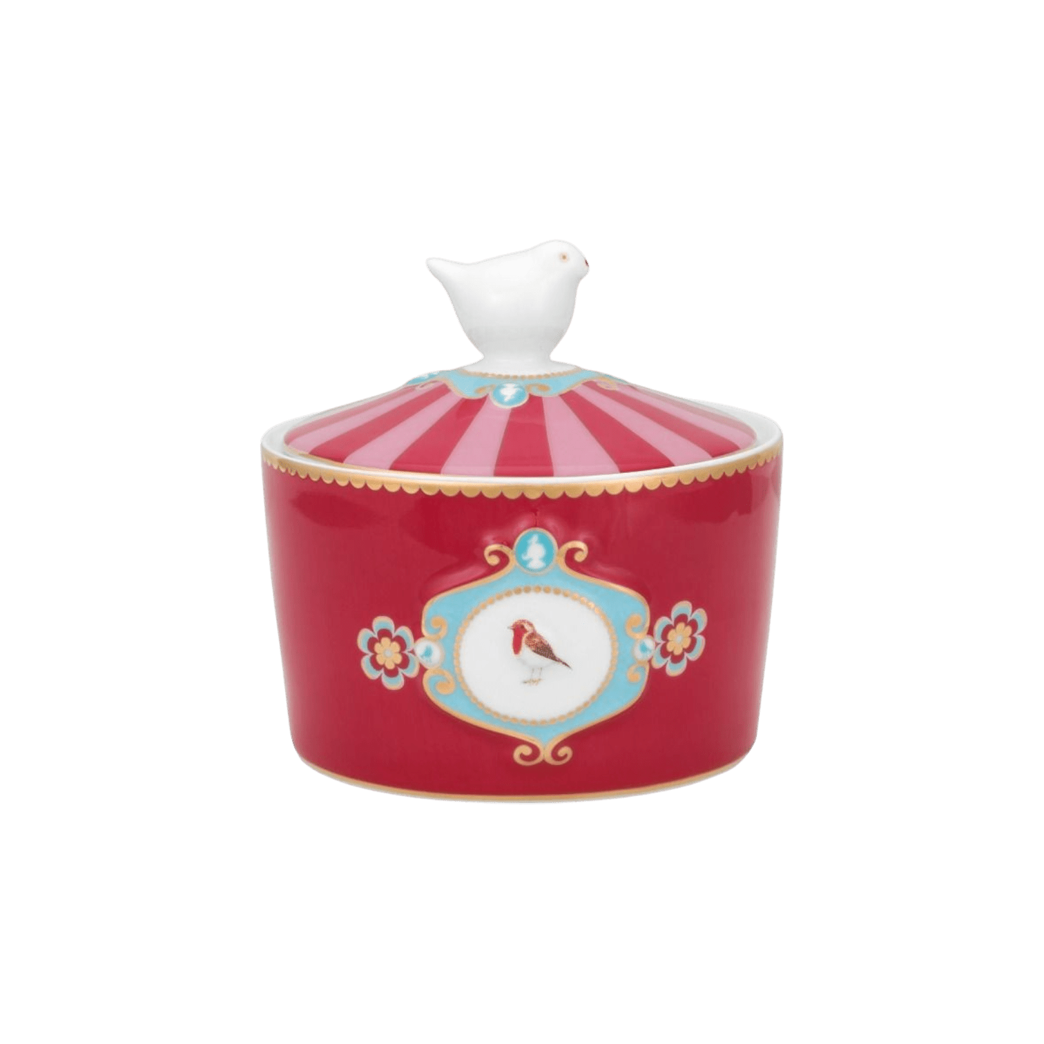 Šis sarkani rozā cukurtrauks ir daļa no Pip izslavētās Love Birds kolekcijas – dizaina, kurā apvienojas romantika, izsmalcinātība un viegls nostalģijas pieskāriens. Centrālo vietu ieņem dekoratīvais medaljons ar sarkankrūtīti, kas iemieso kolekcijas raksturīgo stilu.