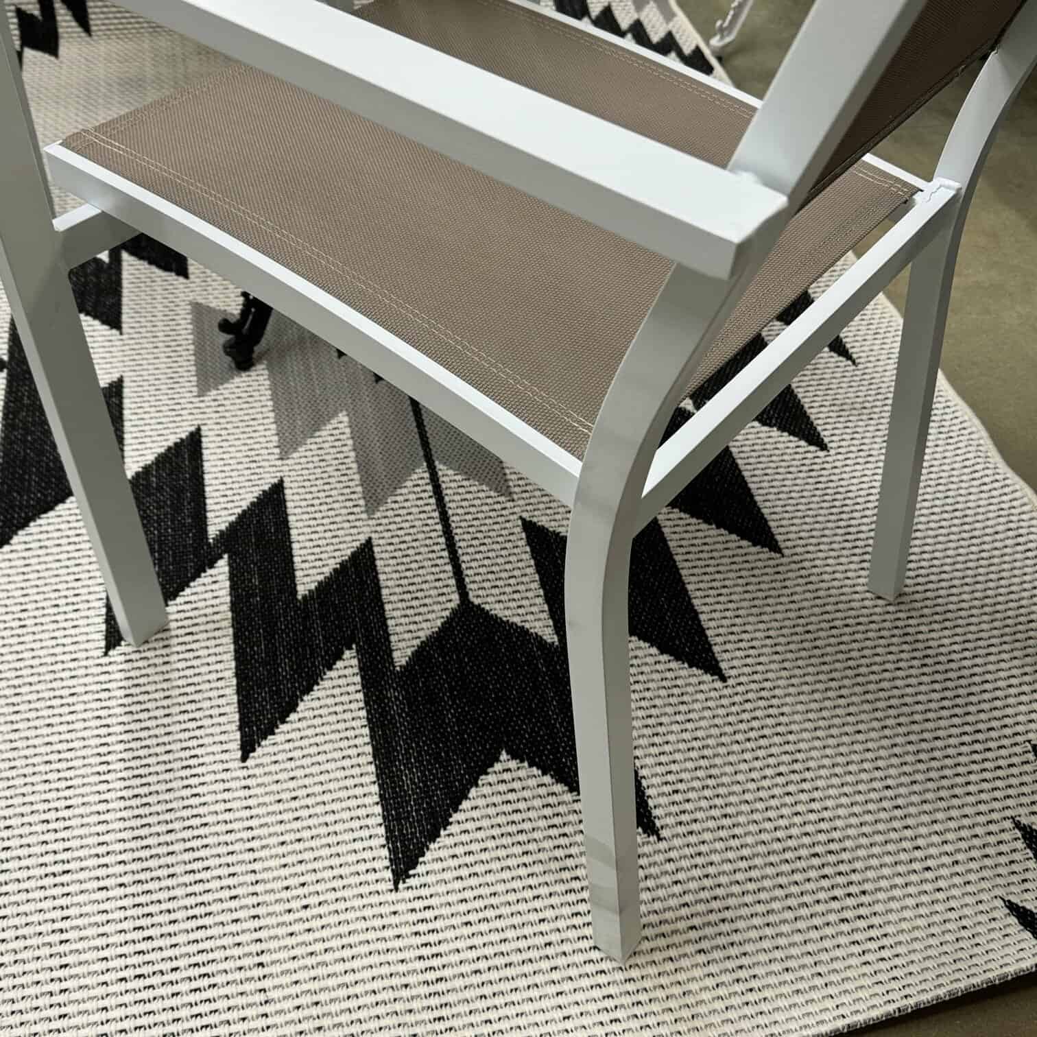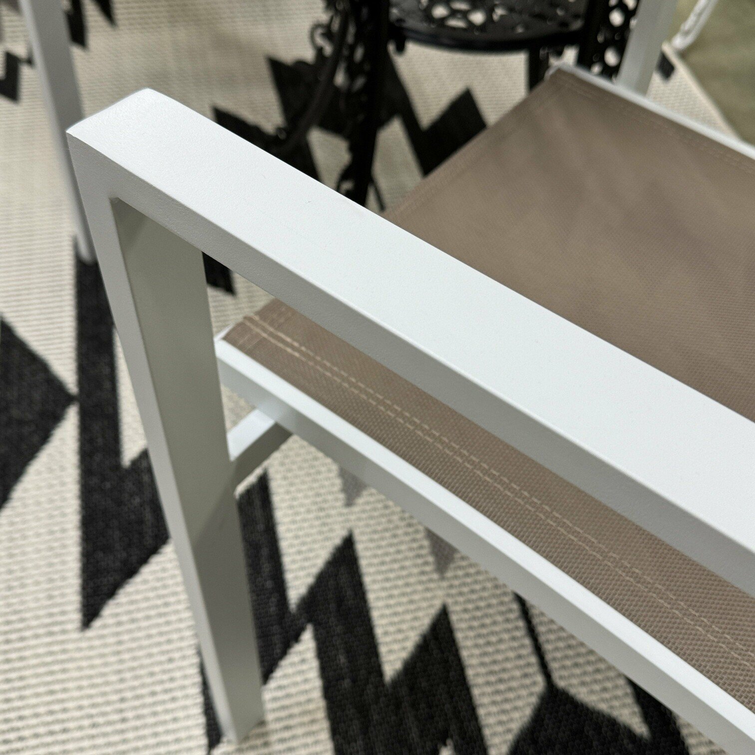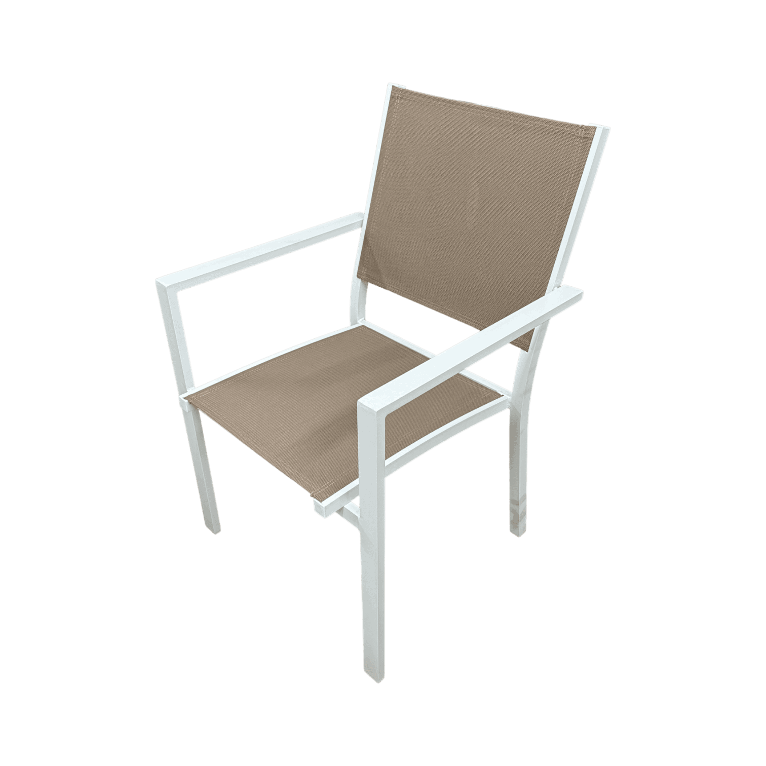 Alumīnija un tekstila krēsls. Lieliski piemērots maltītēm ārtelpās. Īpaši viegli saliekami viens uz otra.