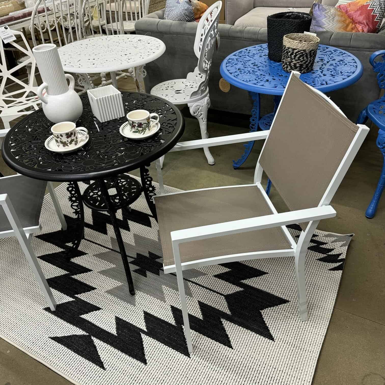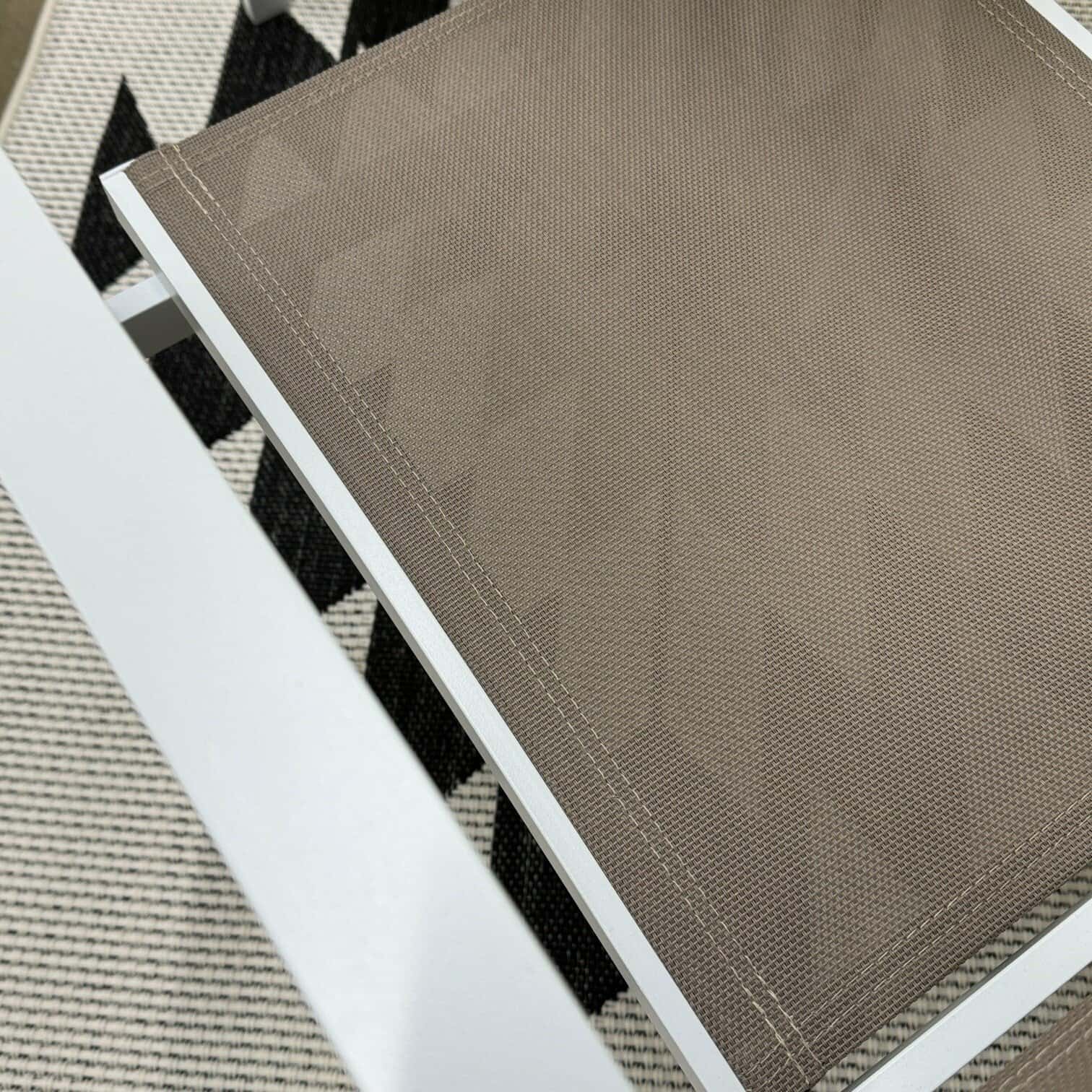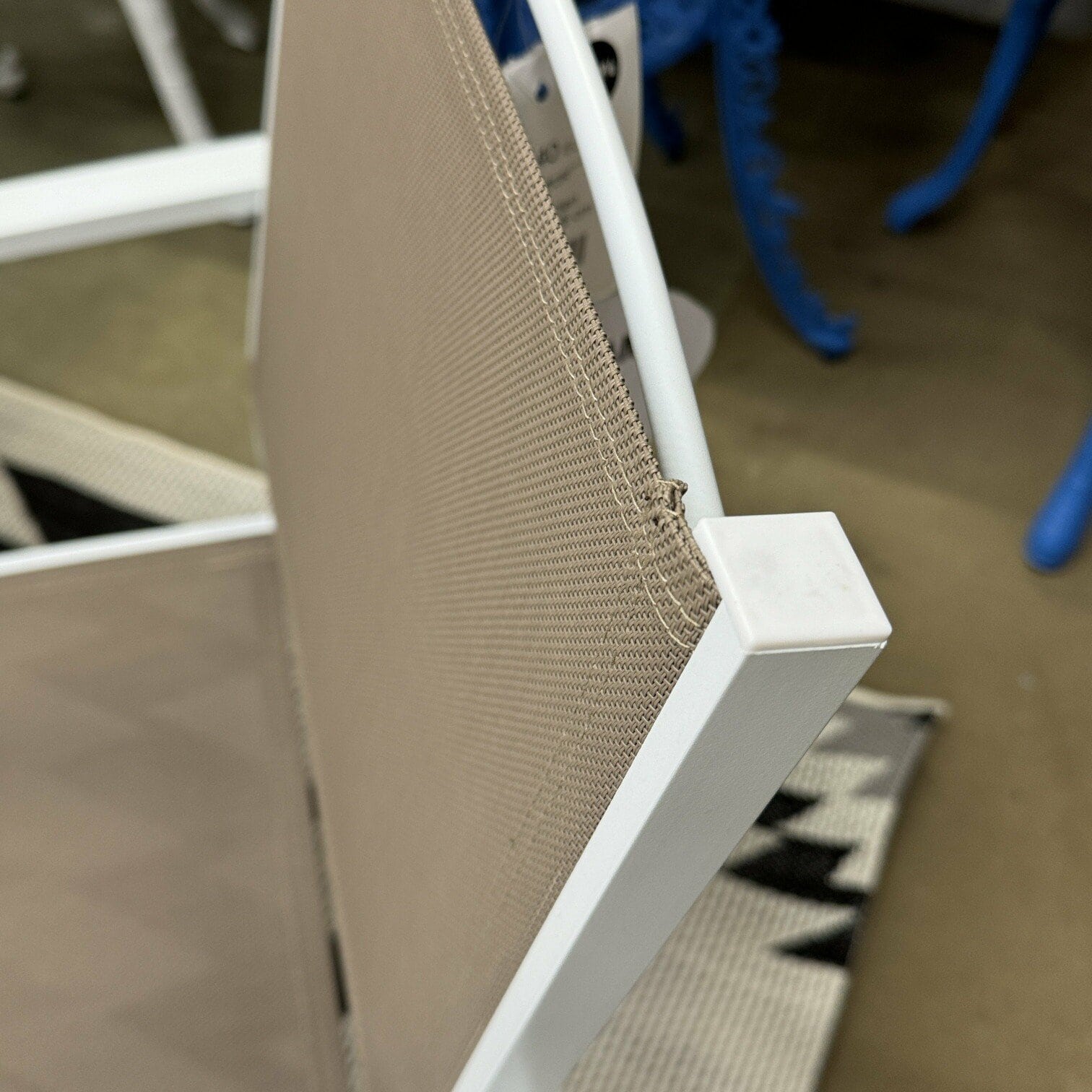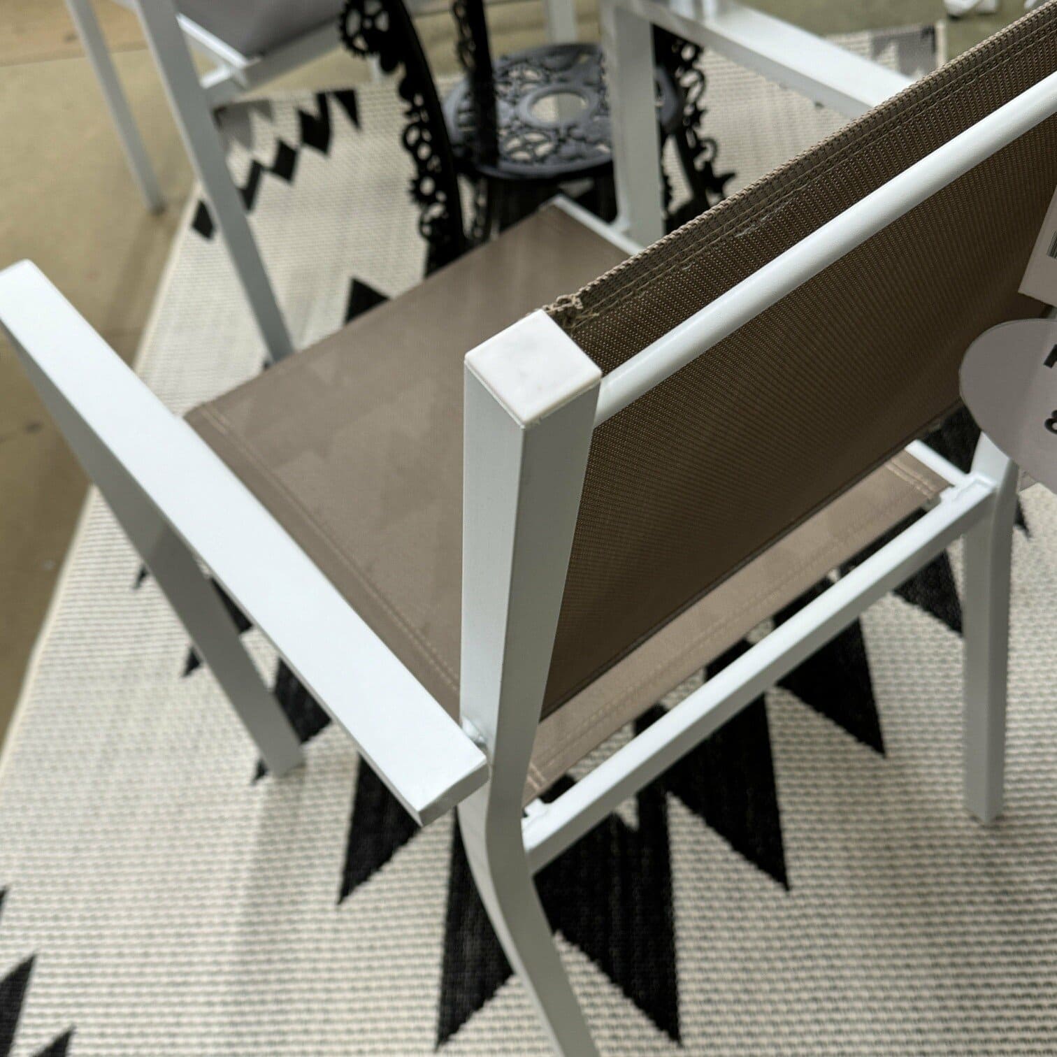 Alumīnija un tekstila krēsls. Lieliski piemērots maltītēm ārtelpās. Īpaši viegli saliekami viens uz otra.
