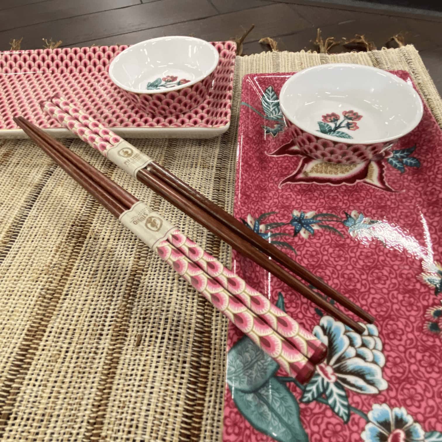 Komplektā ietilpst: 2 bļodiņas, 2 šķīvji, 2 irbulīšu komplekti