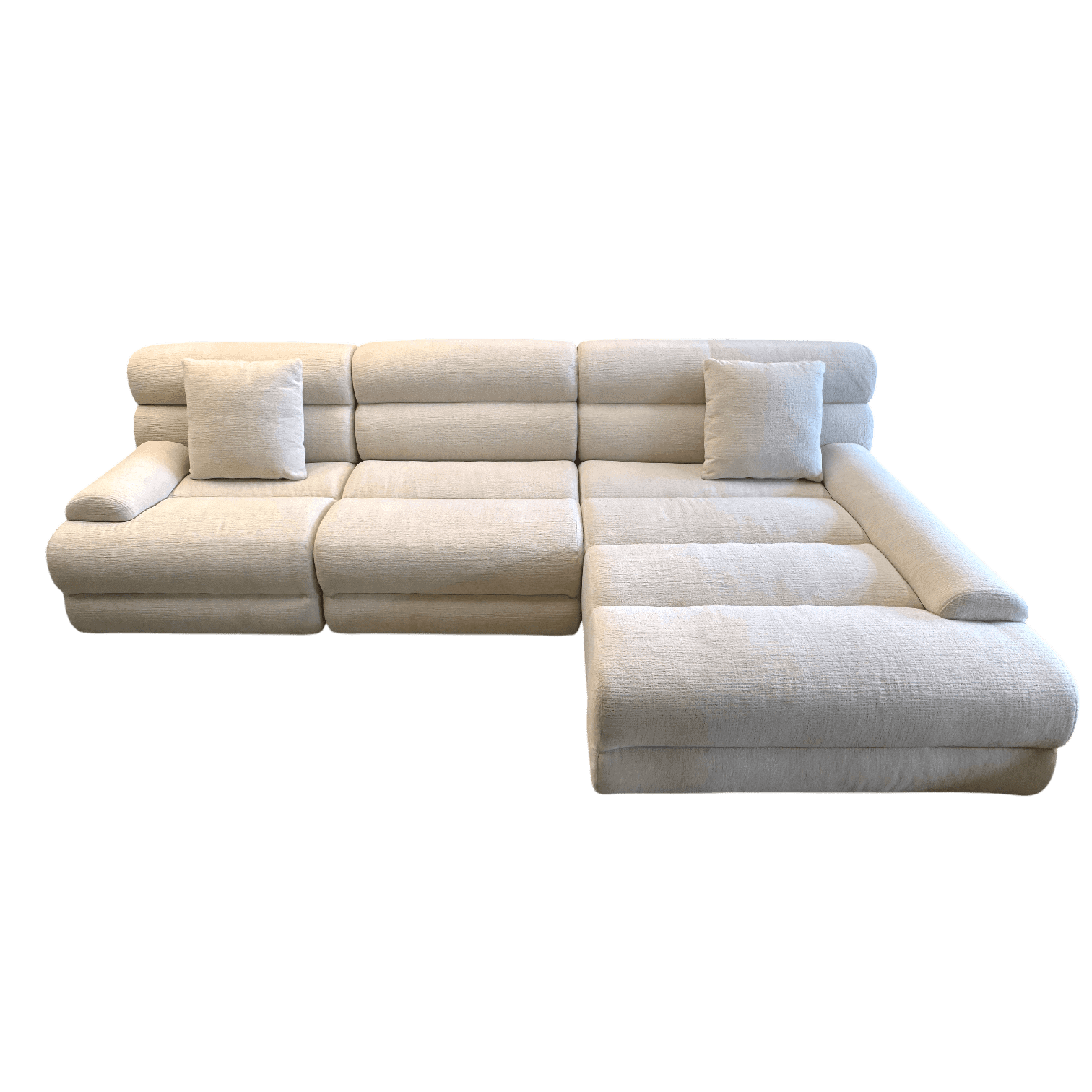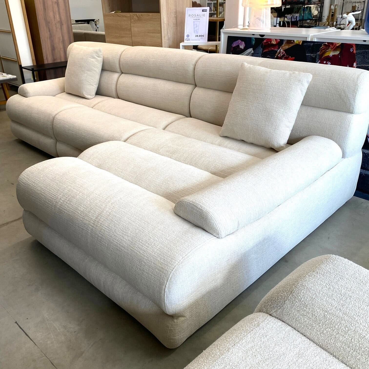 Plašā sēdvieta un ērtais pagarinātais stūra elements nodrošina lielisku vietu atpūtai – gan ikdienas relaksācijai, gan viesu uzņemšanai. Mīkstie atzveltnes spilveni un dekoratīvie sānu spilveni sniedz papildu komfortu, savukārt slaidās melnās kājas piešķir dizainam vieglumu un mūsdienīgu akcentu.