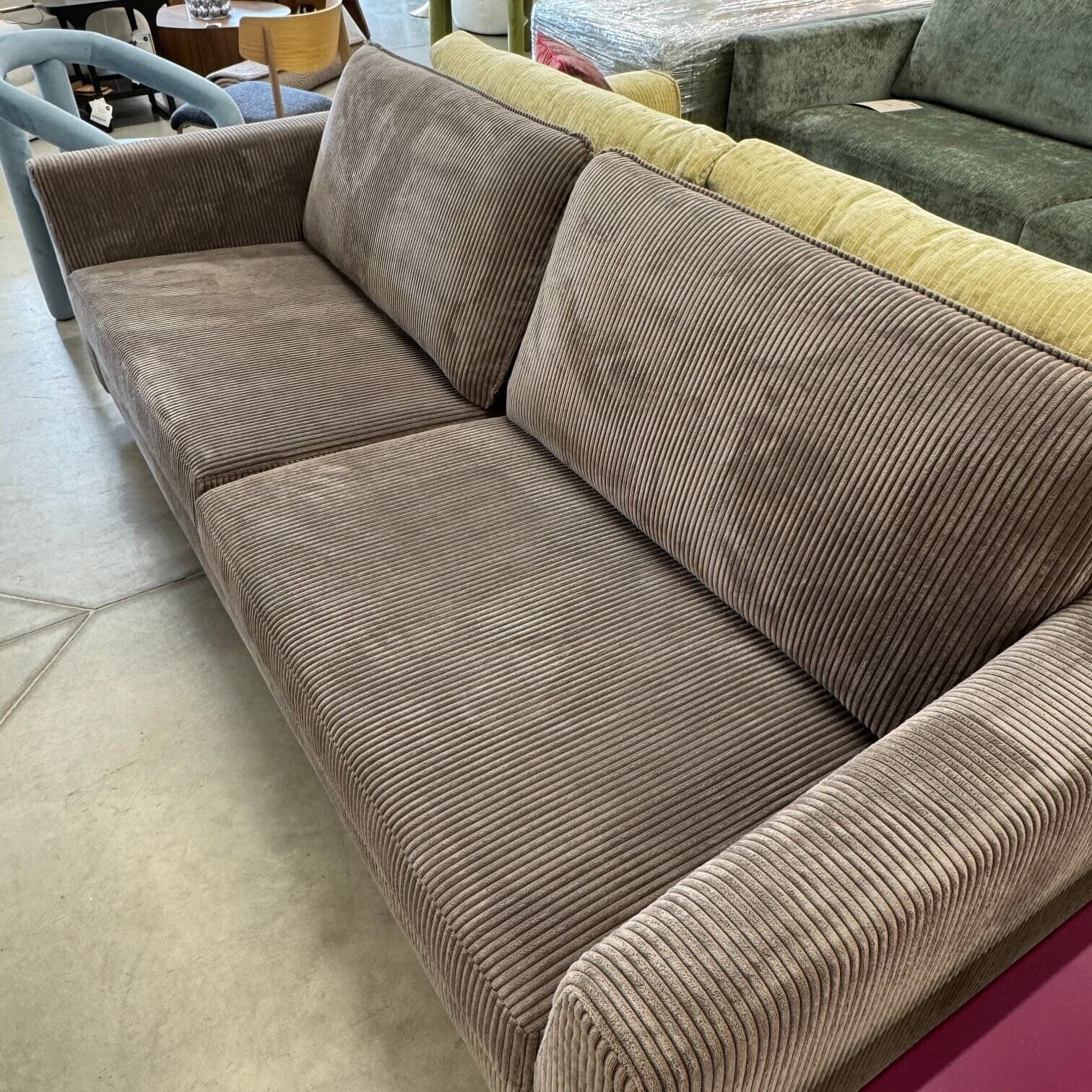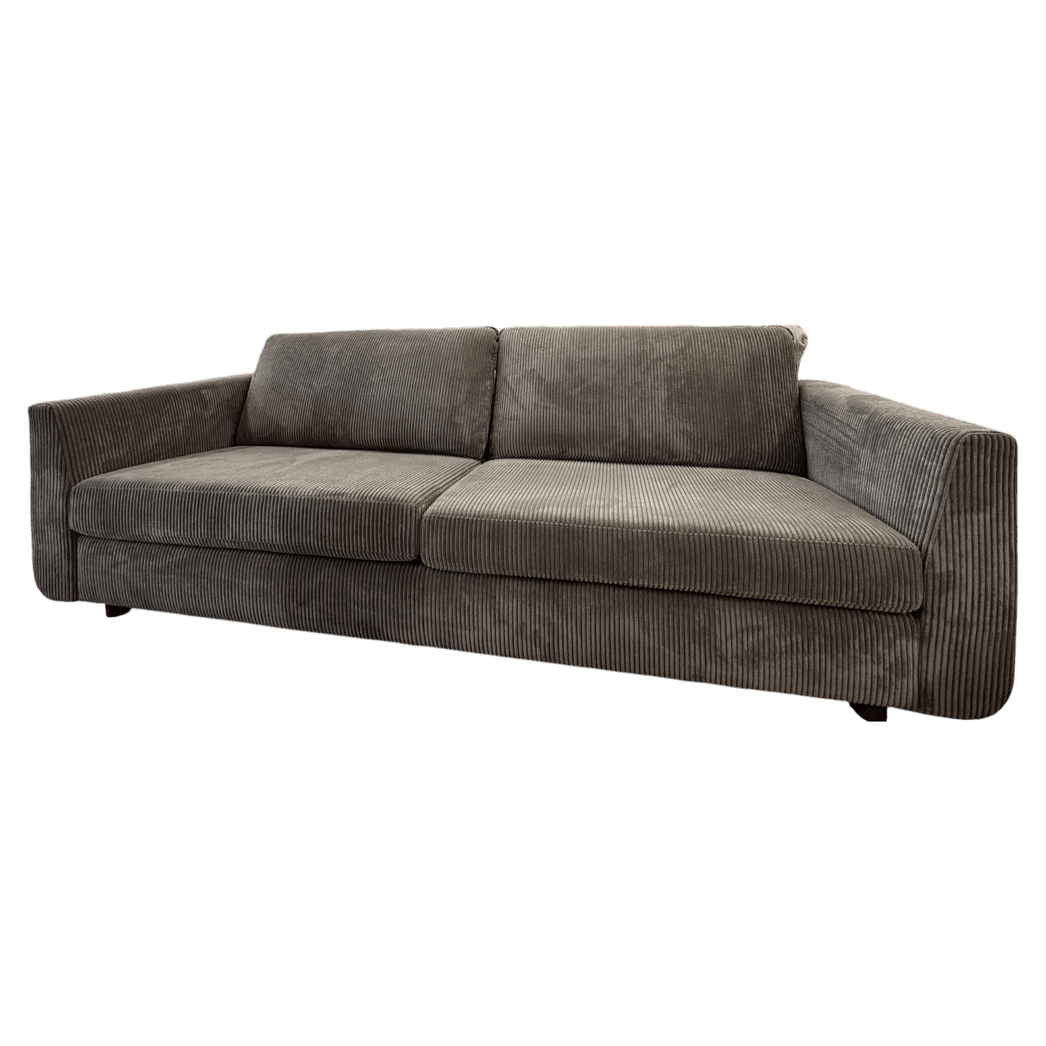 Rievotais (korduroja tipa) audums piešķir dīvānam unikālu vizuālo akcentu un patīkamu taustes sajūtu, savukārt neitrālais tonis ļauj to viegli kombinēt ar dažādiem interjera stiliem – no minimālisma līdz skandināvu vai modernam loftam.