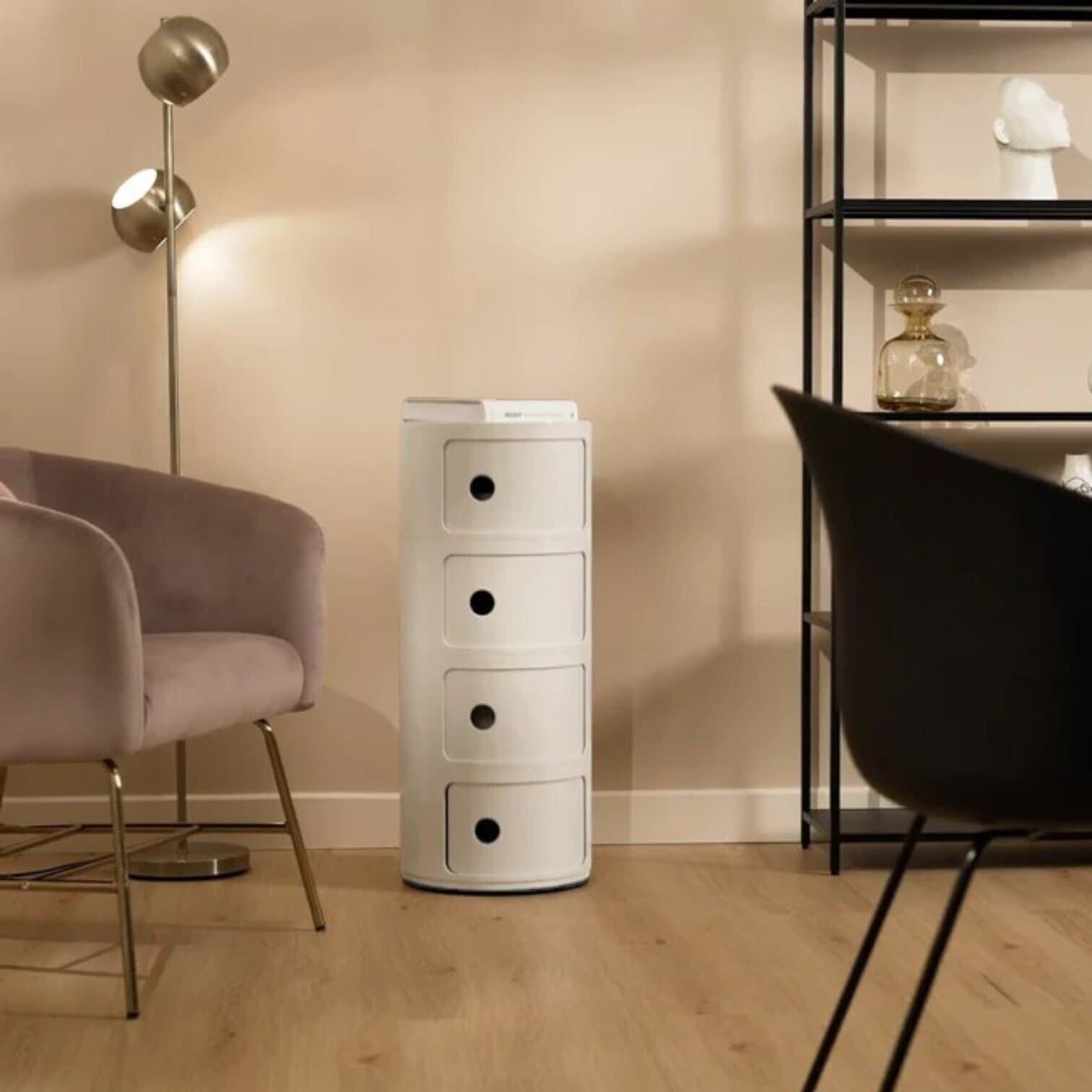 Pateicoties četriem ietilpīgiem nodalījumiem ar bīdāmām durtiņām, konteineris nodrošina ērtu dažādu priekšmetu uzglabāšanu. Tā cilindriskā forma un kompaktais dizains ļauj to izmantot dažādās telpās – kā naktsgaldiņu guļamistabā, nelielu uzglabāšanas skapi viesistabā, vannas istabas organizatoru vai stilīgu akcentu gaitenī.