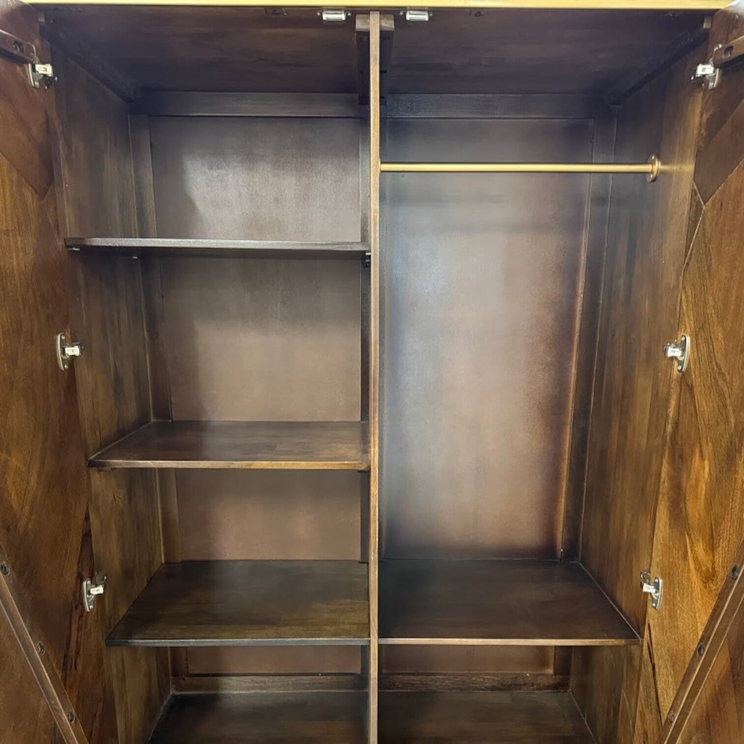 Drēbju skapis Cosmo ienes interjerā burvīgu gadsimta vidus pieskārienu. Pateicoties zelta detaļām un lakotajam mango kokam, šīs drēbju skapis ir klasika ar savu moderno šarmu. Skapis ietver divas durvis, kreisajā pusē ar četriem plauktiem un labajā pusē ar sliedi drēbju izkāršanai.
