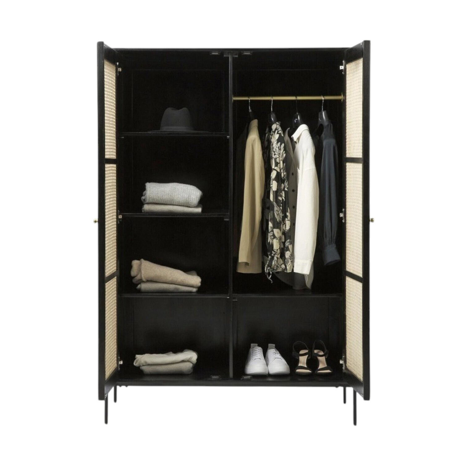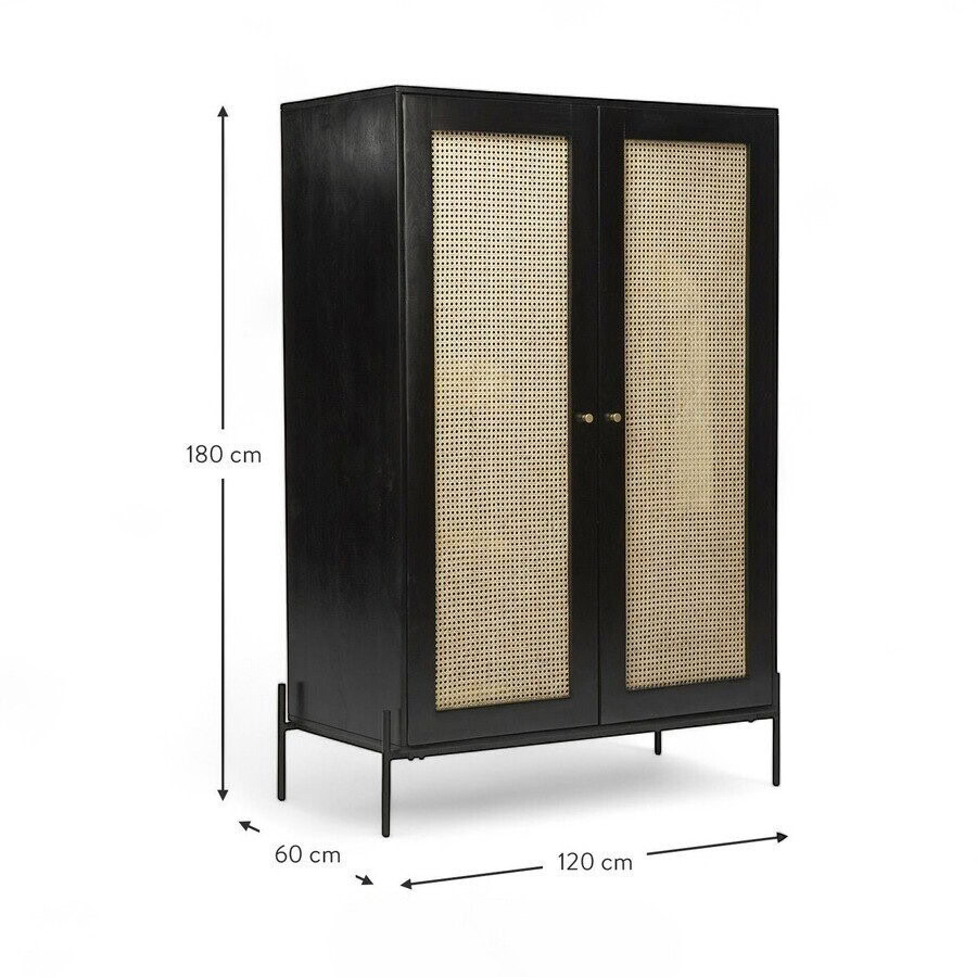 Drēbju skapis Keaton – Pievienojiet savai interjera estētikai eleganci ar melno dizaina drēbju skapi Keaton. Šis skapis ir izcils funkcionalitātes un stila apvienojums, kas piemērots gan modernām, gan industriālām vai boho stila mājām. Izgatavota no kvalitatīviem materiāliem, šis skapis piedāvā plašu uzglabāšanas vietu apģērbam, aksesuāriem vai tekstilizstrādājumiem.