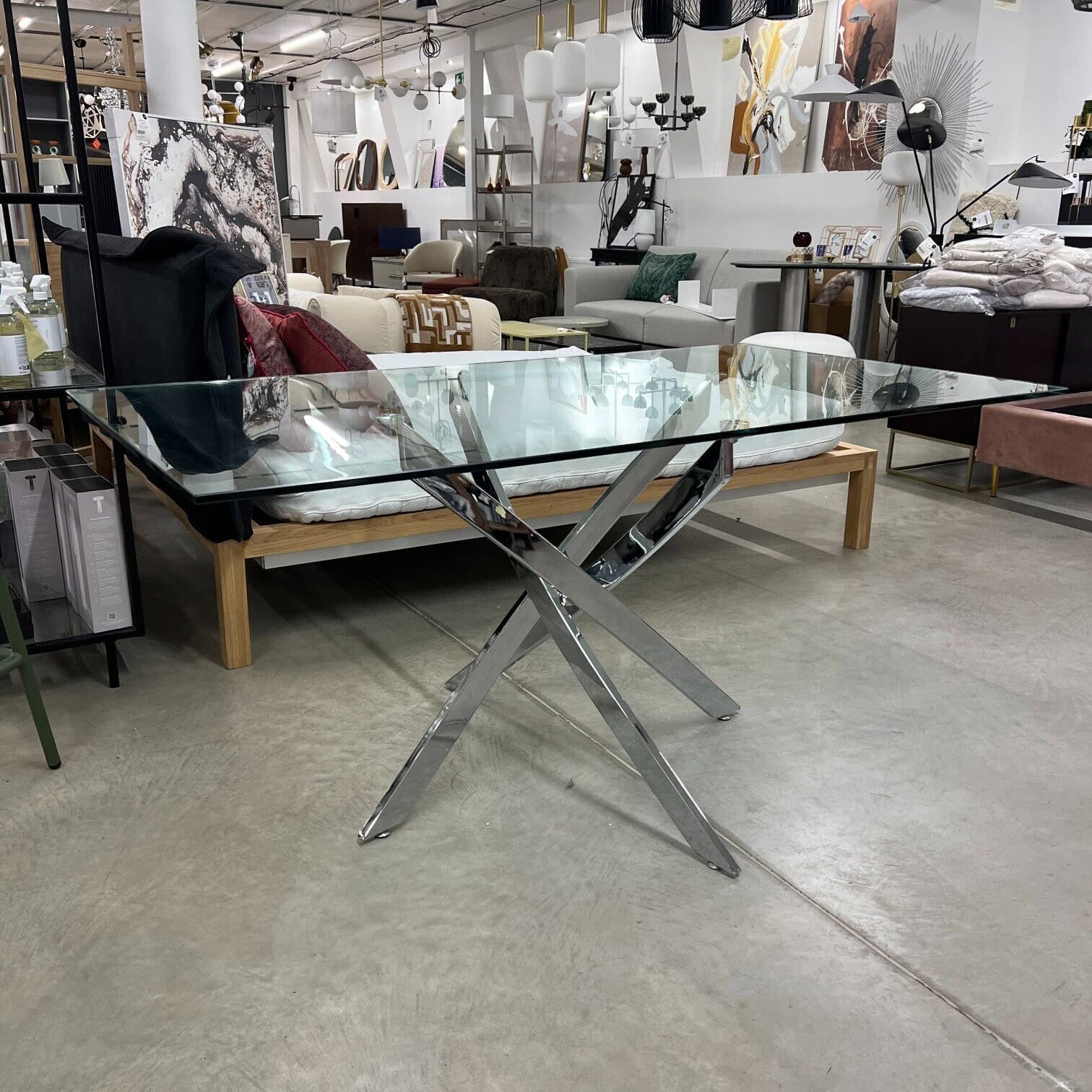 Elegants un mūsdienīgs stikla ēdamgalds ar sudraba krāsas kājām, kas piešķirs interjeram vieglumu un izsmalcinātu akcentu. Caurspīdīgā stikla virsma vizuāli paplašina telpu un rada gaisīgu noskaņu, padarot galdu īpaši piemērotu gan nelielām, gan plašākām ēdamzonām.