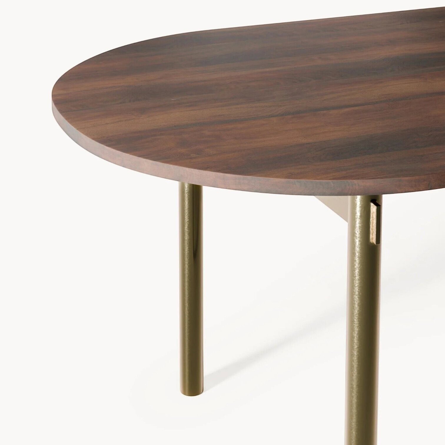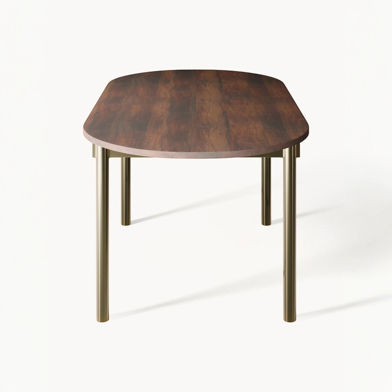 Ēdamgalda dizainā apvienots mūsdienīgs dizains ar kvalitatīviem materiāliem. Galds izceļas ar ovālu virsmu no dabīgā koka imitācijas, kura piešķir siltuma un mājīguma sajūtu jebkurai telpai. Metāla kājas ar zeltainu apdari nodrošina stabilitāti un piešķir galdam mūsdienīgu šarmu.