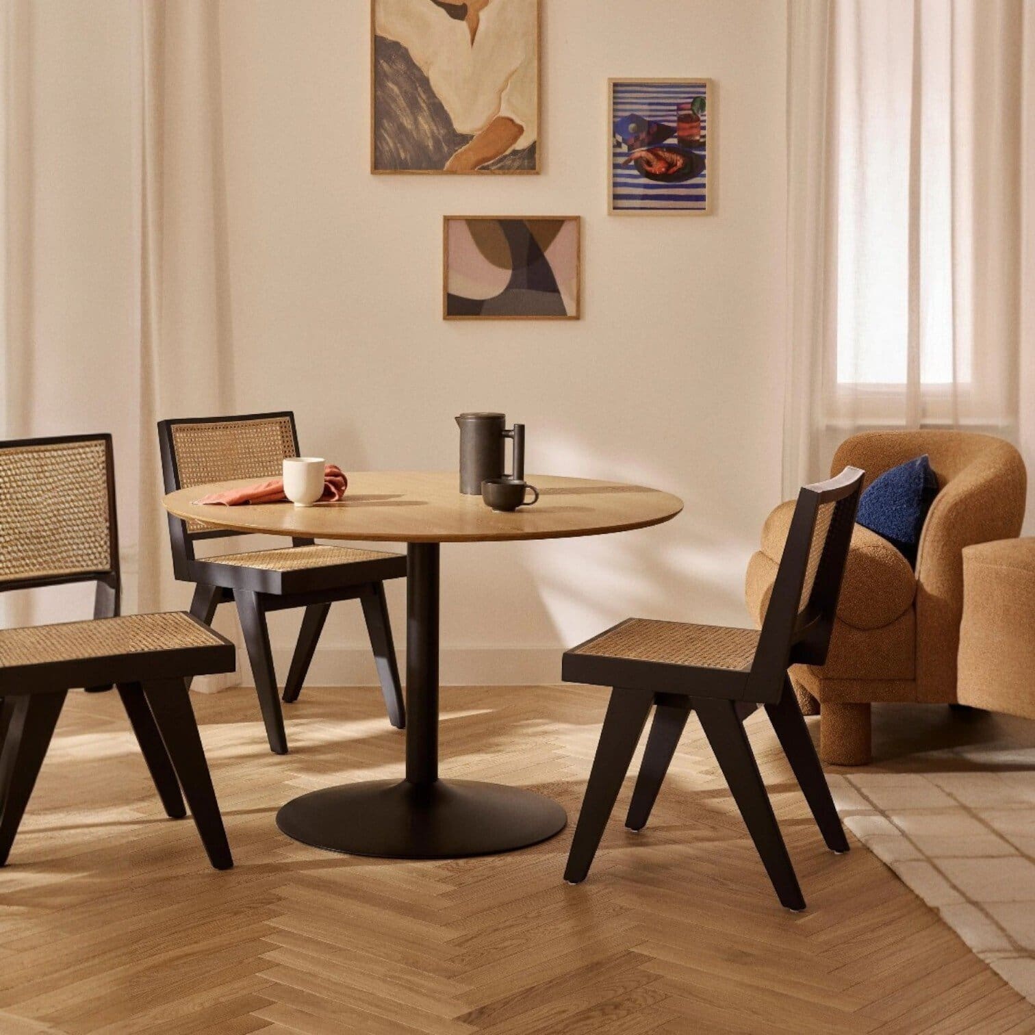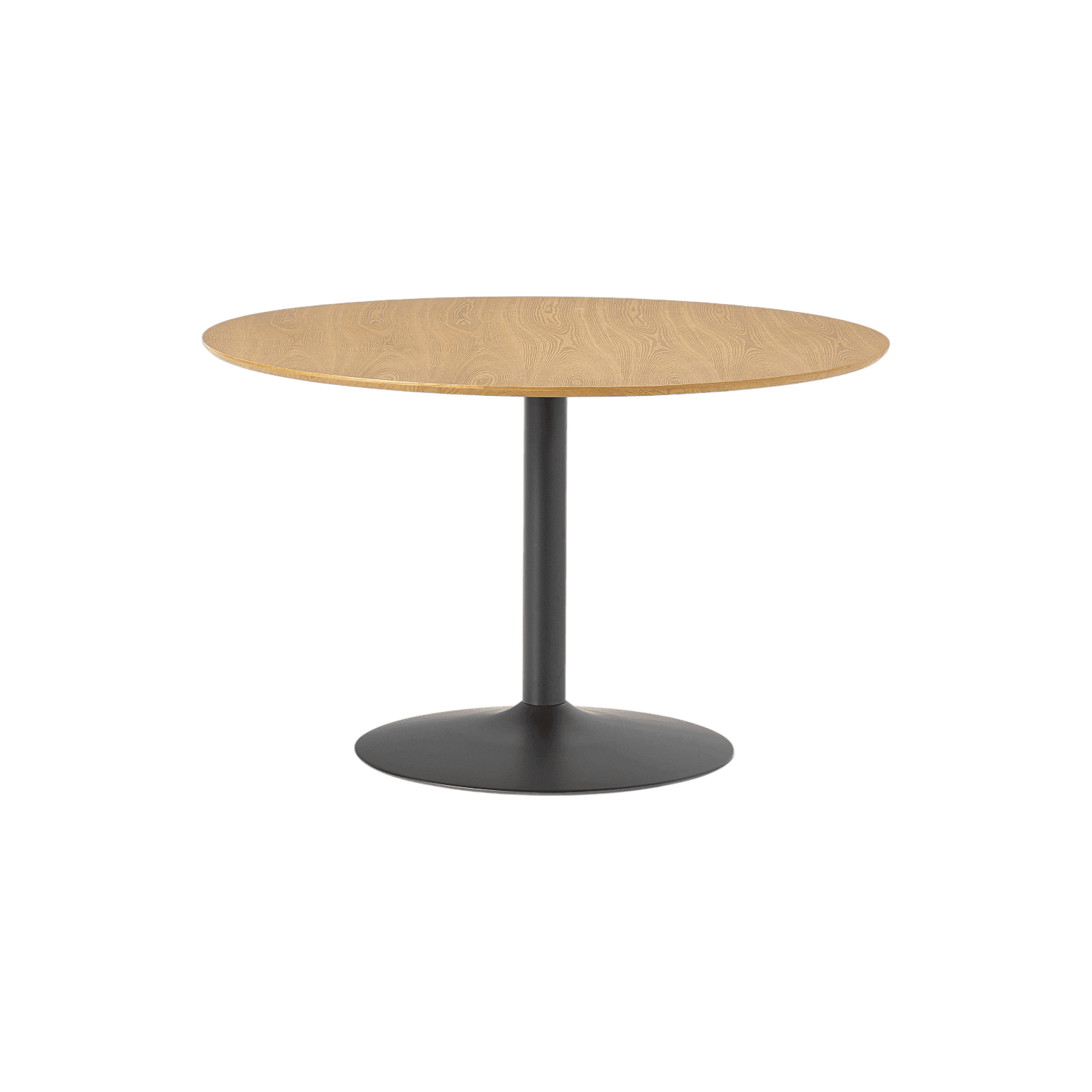 Šis apaļais pusdienu galds ir izsmalcināts modernā dizaina paraugs, kas apvieno dabisku siltumu ar industriālu eleganci. Tā plašā virsma ar izteiksmīgu koka tekstūru gaiši brūnā tonī piešķir telpai mājīgumu un vizuālu akcentu, savukārt plānais virsmas profils saglabā mēbeles moderno un gaisīgo tēlu. Galds ir radīts kā centrālais pulcēšanās punkts, kas pateicoties savai formai veicina brīvu sarunu gaisotni un harmoniski iekļaujas gan minimālisma stilā ieturētās virtuvēs, gan plašās ēdamzonās.