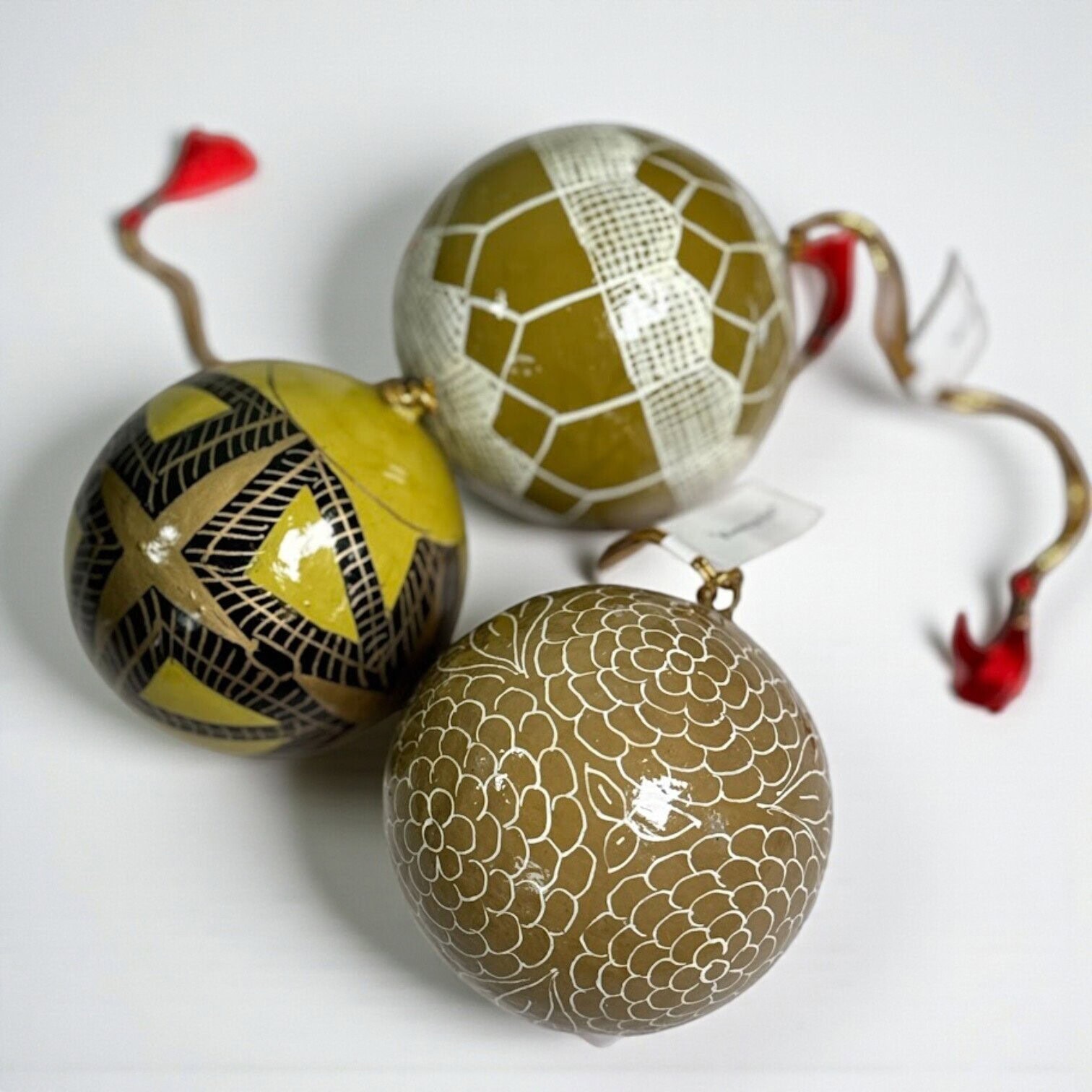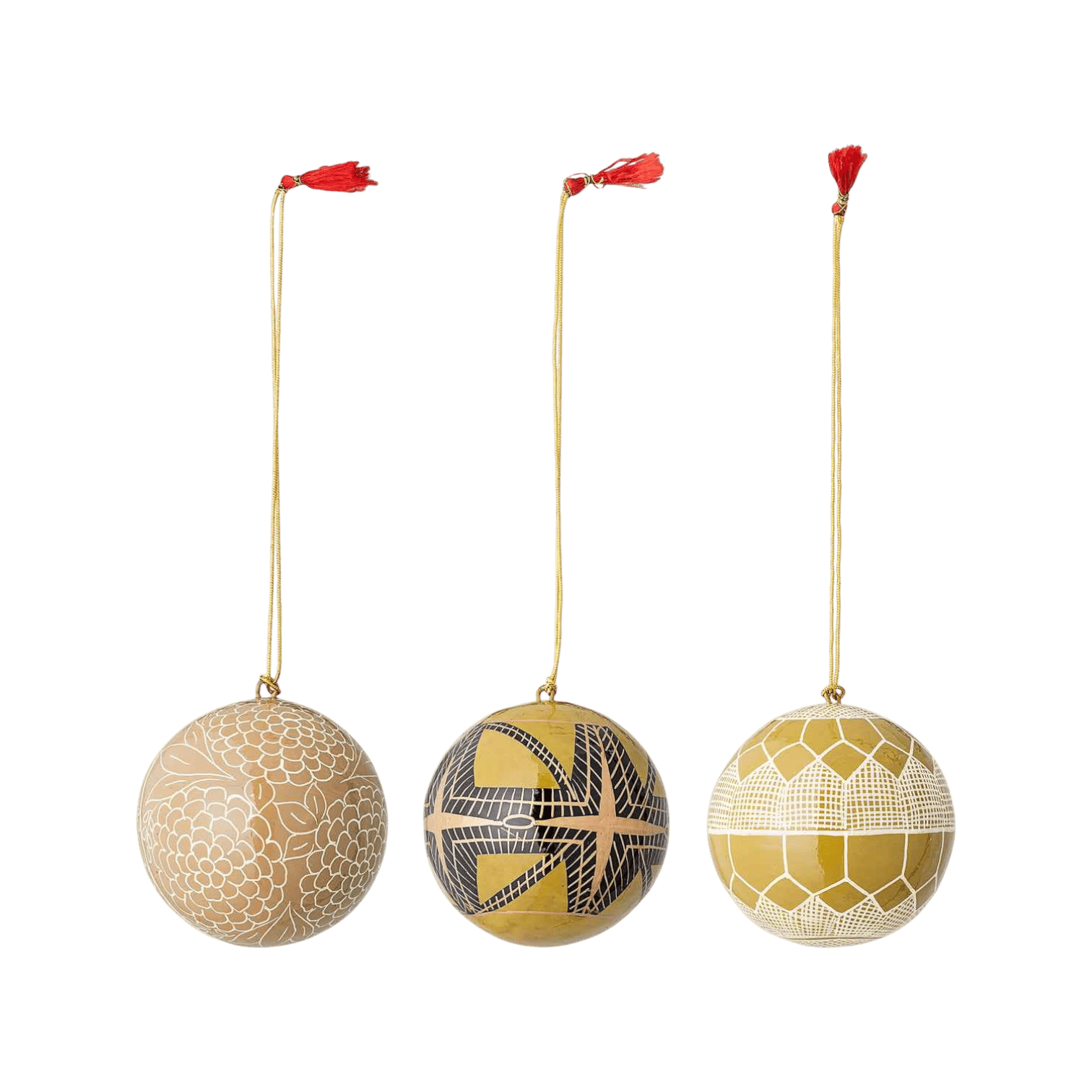 Eglīšu rotājumu komplekts Mia sastāv no trīs unikāliem rotājumiem, kas piešķirs jūsu svētku dekoram siltu un māksliniecisku noskaņu. Katrs rotājums ir izgatavots ar rokām, tam ir individuāls raksts un krāsu salikums — no zeltaini brūniem līdz melni zeltainiem toņiem.