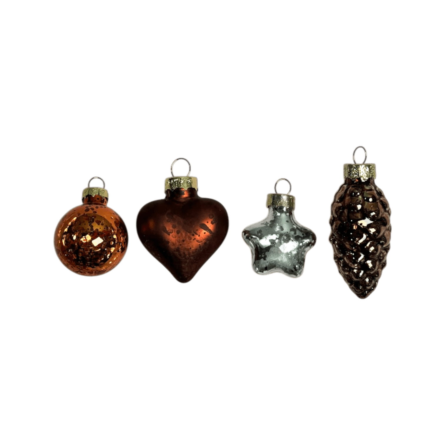 Komplektā atradīsiet dažādas formas — bumbiņas, sirsniņas, čiekuriņus un zvaigznītes, kas piešķir eglītei dinamisku un rotaļīgu izskatu. Katrs rotājums ir izgatavots no kvalitatīva stikla, ar maigu spīdumu vai vieglu metālisku efektu, kas skaisti atstaro gaismu un rada siltu mirdzumu.