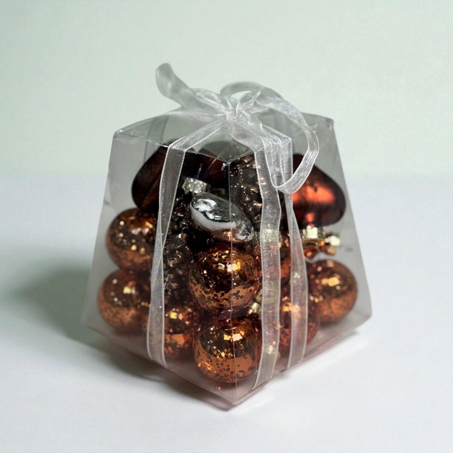 Eglīšu rotājumu komplekts Virginia sastāv no 24 skaistiem stikla rotājumiem siltos, dabas iedvesmotos toņos — oranžā, bronzas un brūnā. Šī krāsu palete rada mājīgu, elegantu un harmonisku noskaņu, kas lieliski papildinās jebkuru Ziemassvētku interjeru.