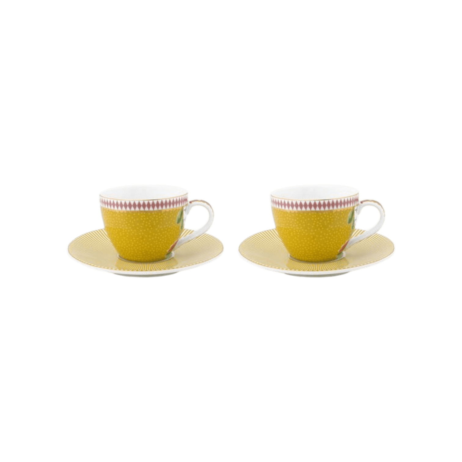 Šis espresso tases un apakštases komplekts ir dekorēts ar dzeltenu dizainu, eksotiskiem ziediem un zelta detaļām. Lieliski sader ar citiem priekšmetiem no La Majorelle kolekcijas.