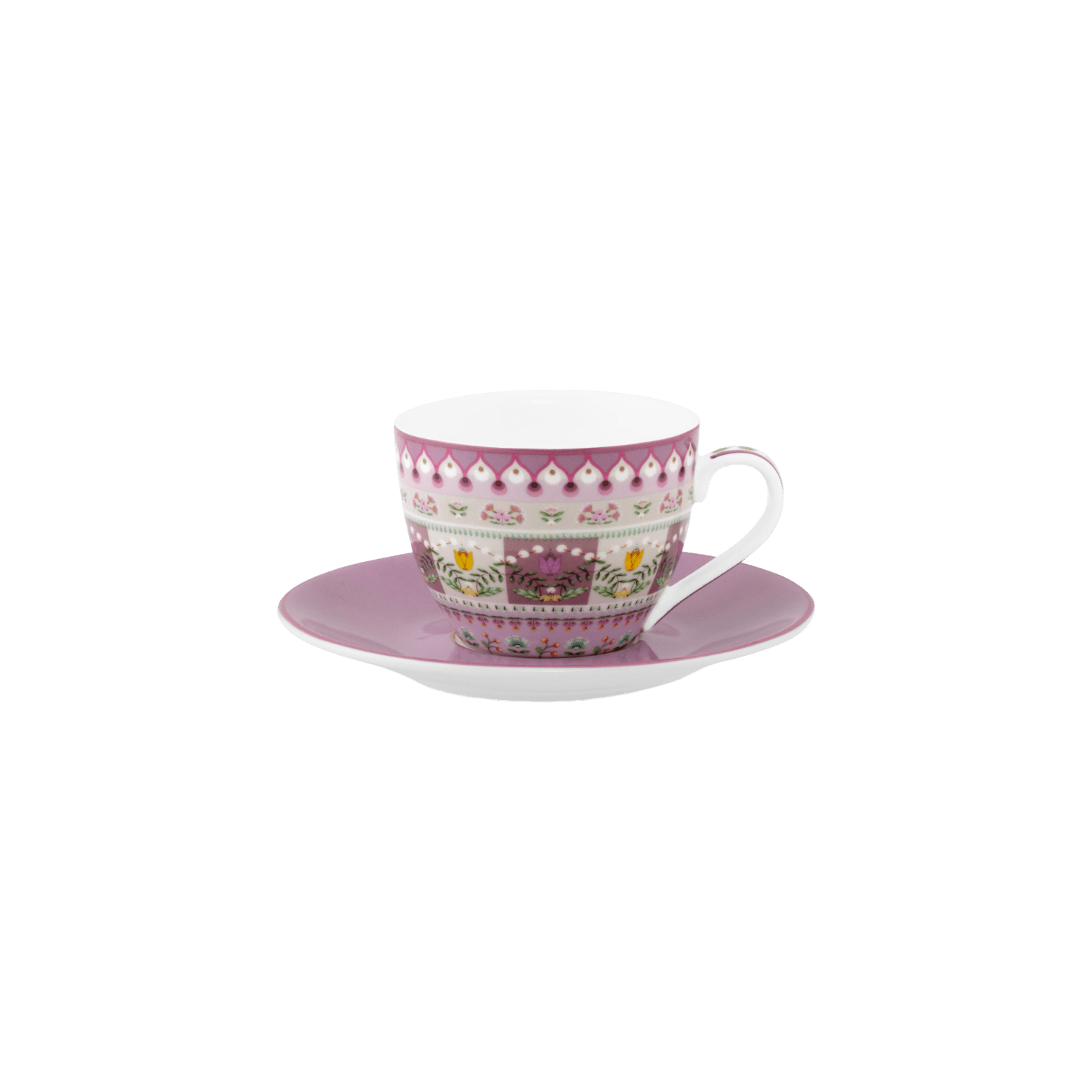Šī espresso tase un apakštase ir daļa no kolekcijas Lily&Lotus. Tasi rotā lotosa lapas un pienenes pasteļtoņos. Ziedi un graciozās papardes ir izvietotas simetriski, piešķirot šai elegantajai tasei mūsdienīgu izskatu. Tasei ir skaista violeta krāsa.