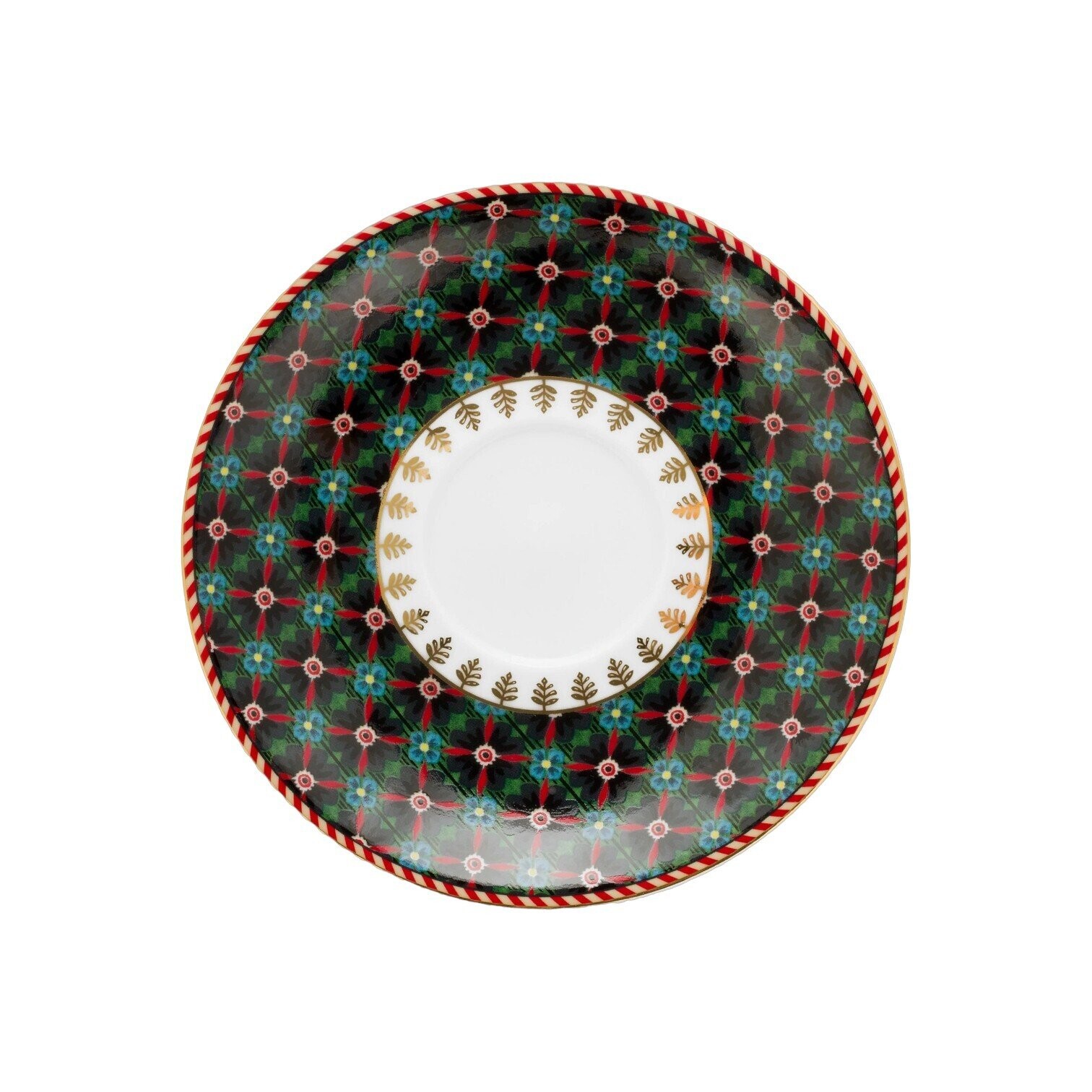 Rūpīgi veidotajā dizainā attēloti dzīvīgi zilie ziedi, kas vijās ar rotaļīgiem ziediem un ogām, radot valdzinošu vizuālo efektu. Katra detaļa ir akcentēta ar smalkām zelta līnijām un raksturīgo sarkani-balto svītru, piešķirot jūsu kafijas mirkļiem īpašu eleganci.