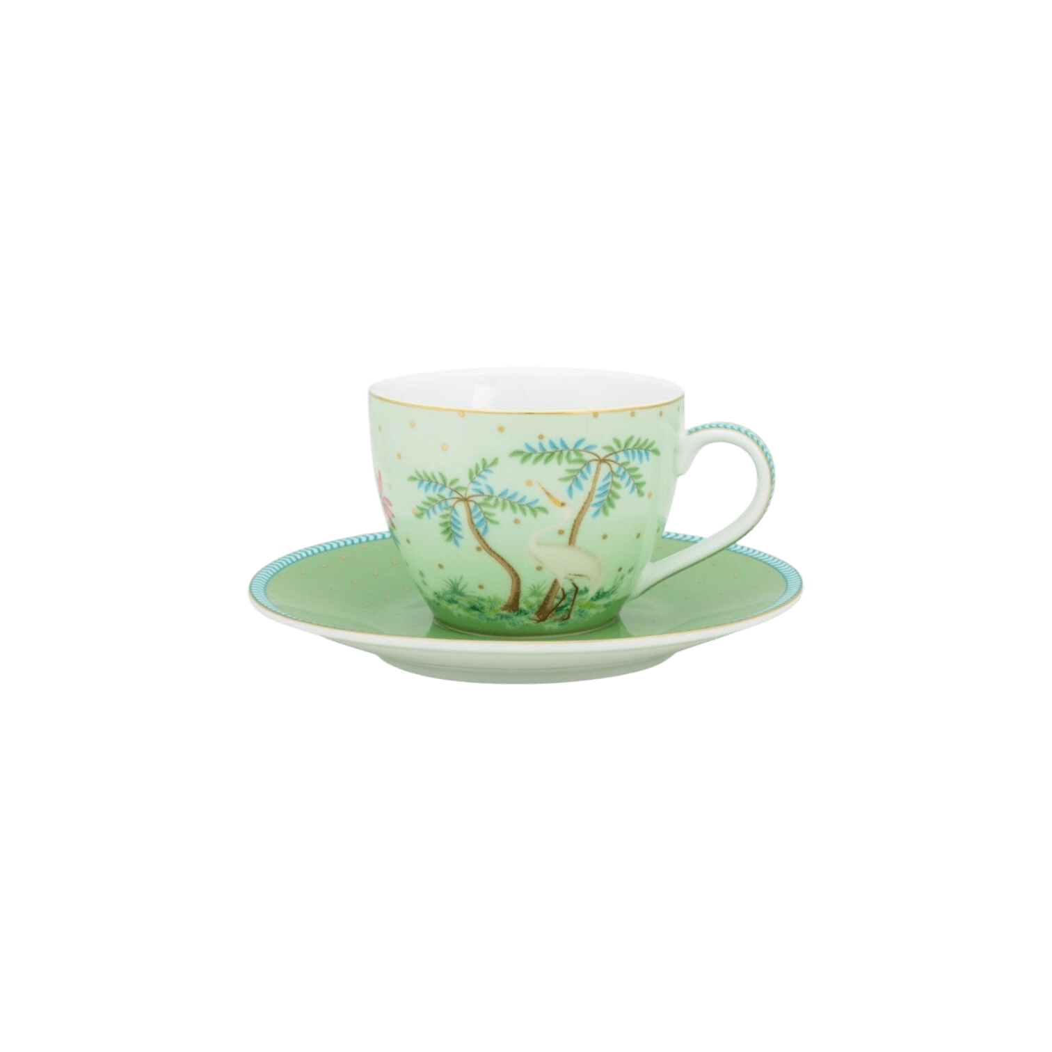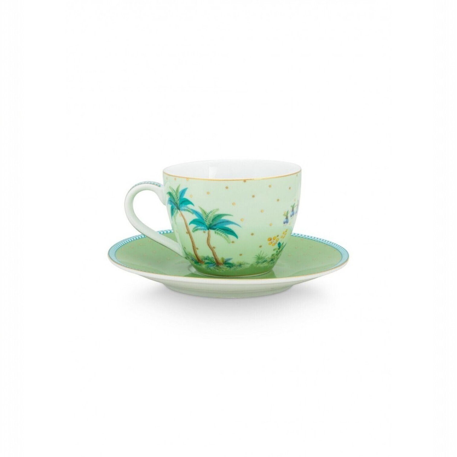 Espresso tasīte Jolie Gold Dots Green aizvedīs jūs uz tropu salām ar savu eksotisko dizainu. Tasītes ir rotātas ar eksotisku rakstu, savukārt apakštasītes – ar zelta punktiņiem un zilām detaļām. Šeit atradīsiet dažādus augus, krāsainus ziedus un unikālas sugas. Šim komplektam ir ideāls izmērs gardai kafijas tasītei.