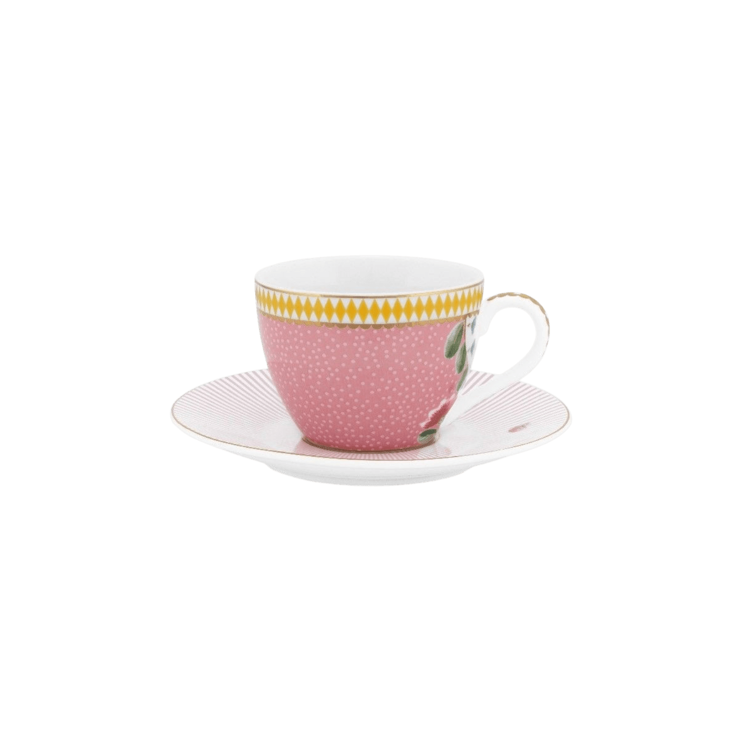 Šī espresso krūzīte un apakštase ir rotāta ar rozā dizainu, eksotiskiem ziediem un zelta detaļām. Lieliski sader ar citiem priekšmetiem no La Majorelle kolekcijas