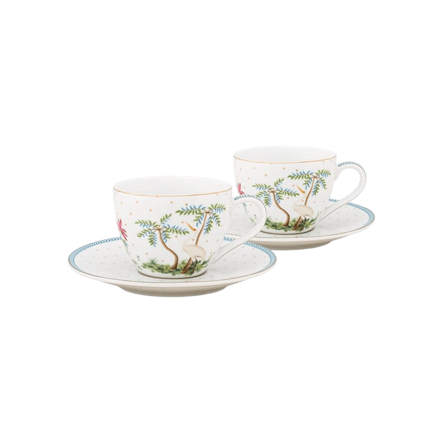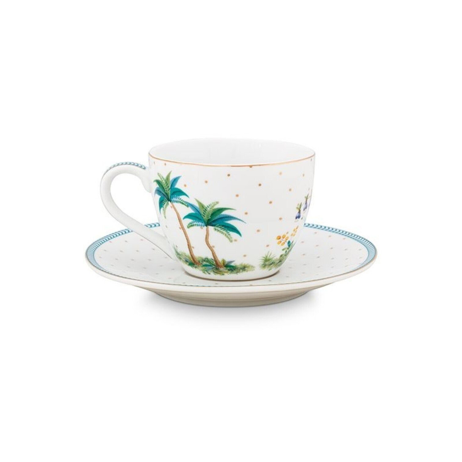 Šis baltās krāsas espresso tasītes un apakštasītes komplekts aizvedīs jūs tropiskā ceļojumā ar savu eksotisko dizainu. Tasītes rotā zelta punktiņi un zilas detaļas, savukārt apakštasītes ir dekorētas ar tropiskiem motīviem. Tajās atradīsiet dažādus augus, krāsainus ziedus un dažādas eksotiskas sugas. Šis komplekts ir ideālā izmērā nelielai kafijas tasei.