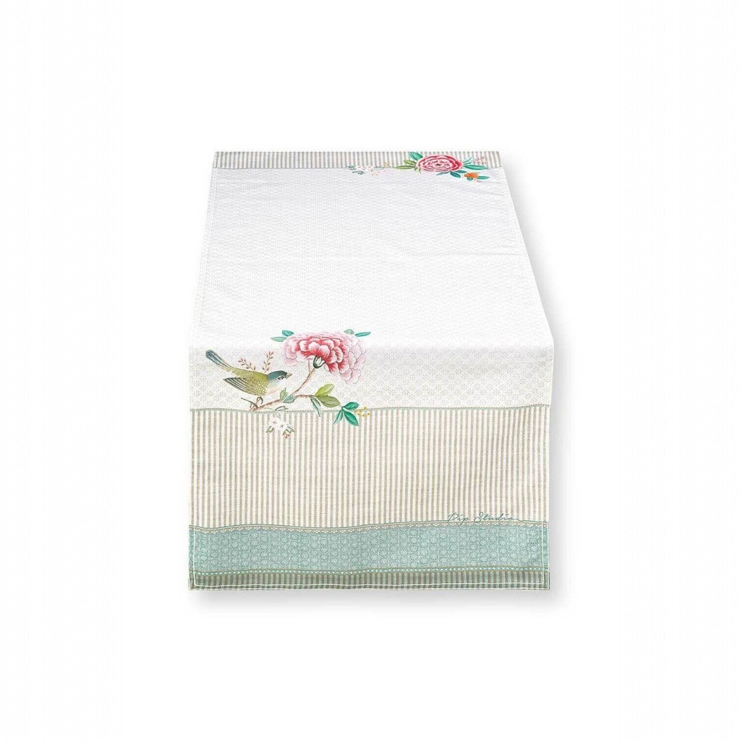 Šis unikālais haki krāsas galda celiņš piešķir galdam papildu mājīgumu. Galda celiņš ir bagātīgi dekorēts ar dažādiem rakstiem un ietver eksotiskus ziedus no kolekcijas “Blushing Birds”.
