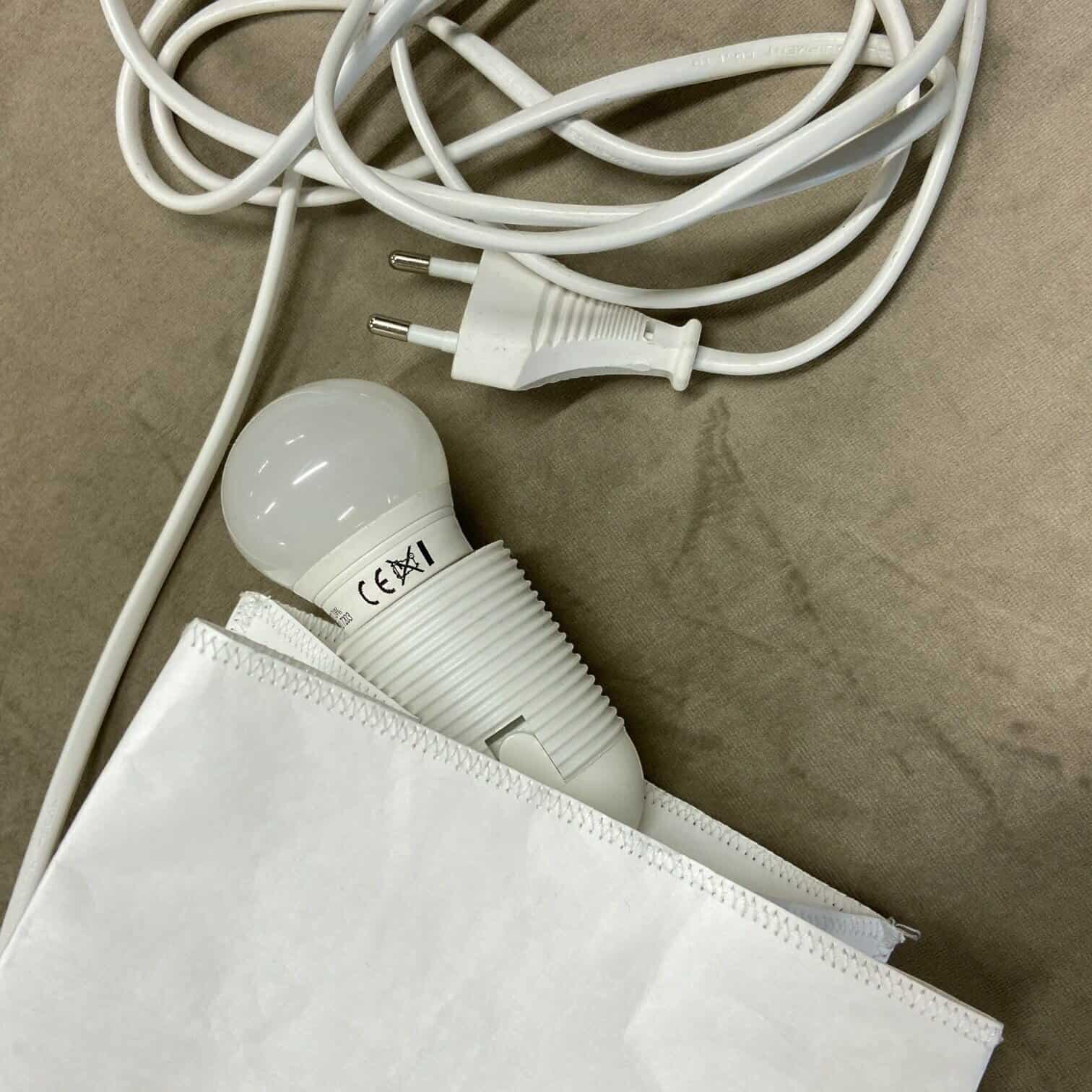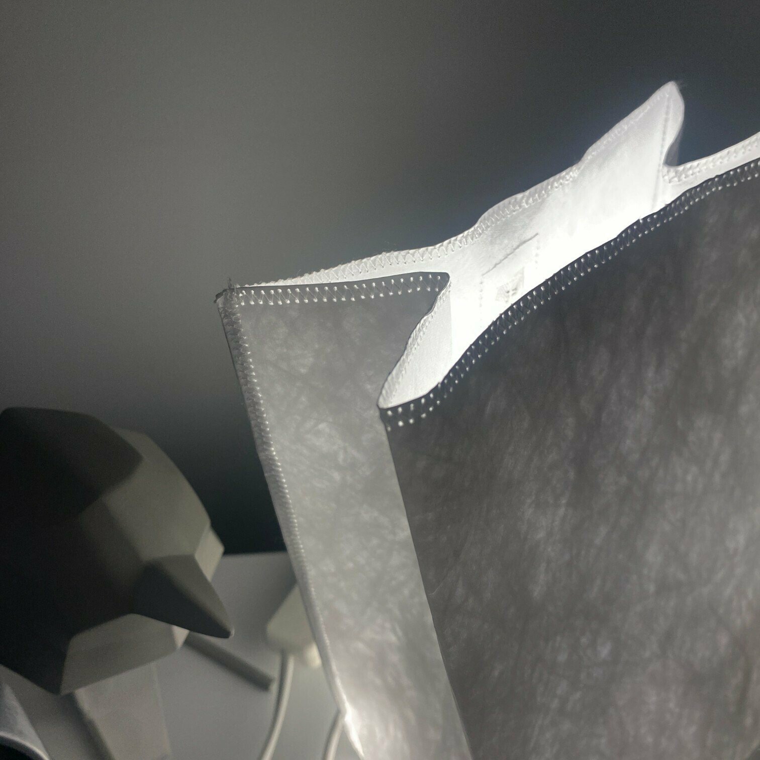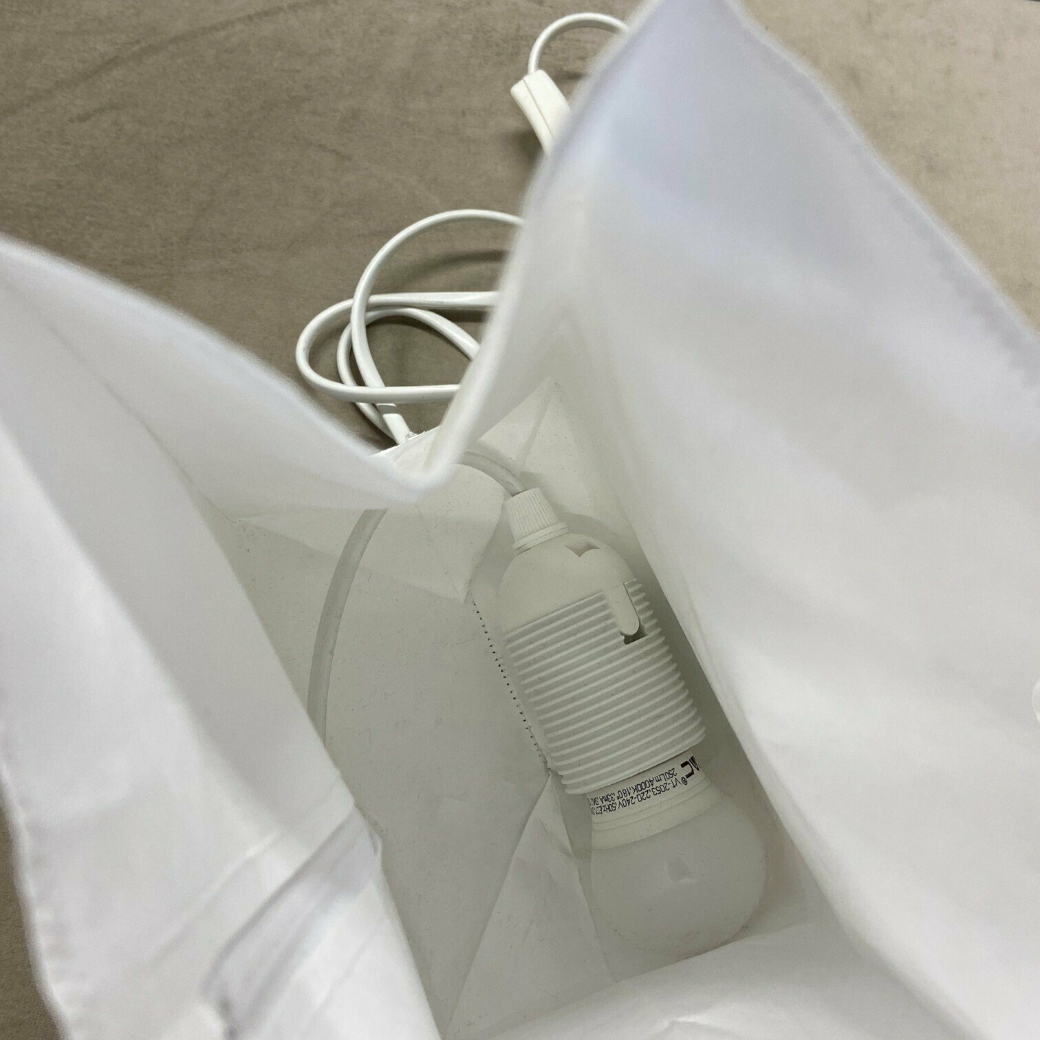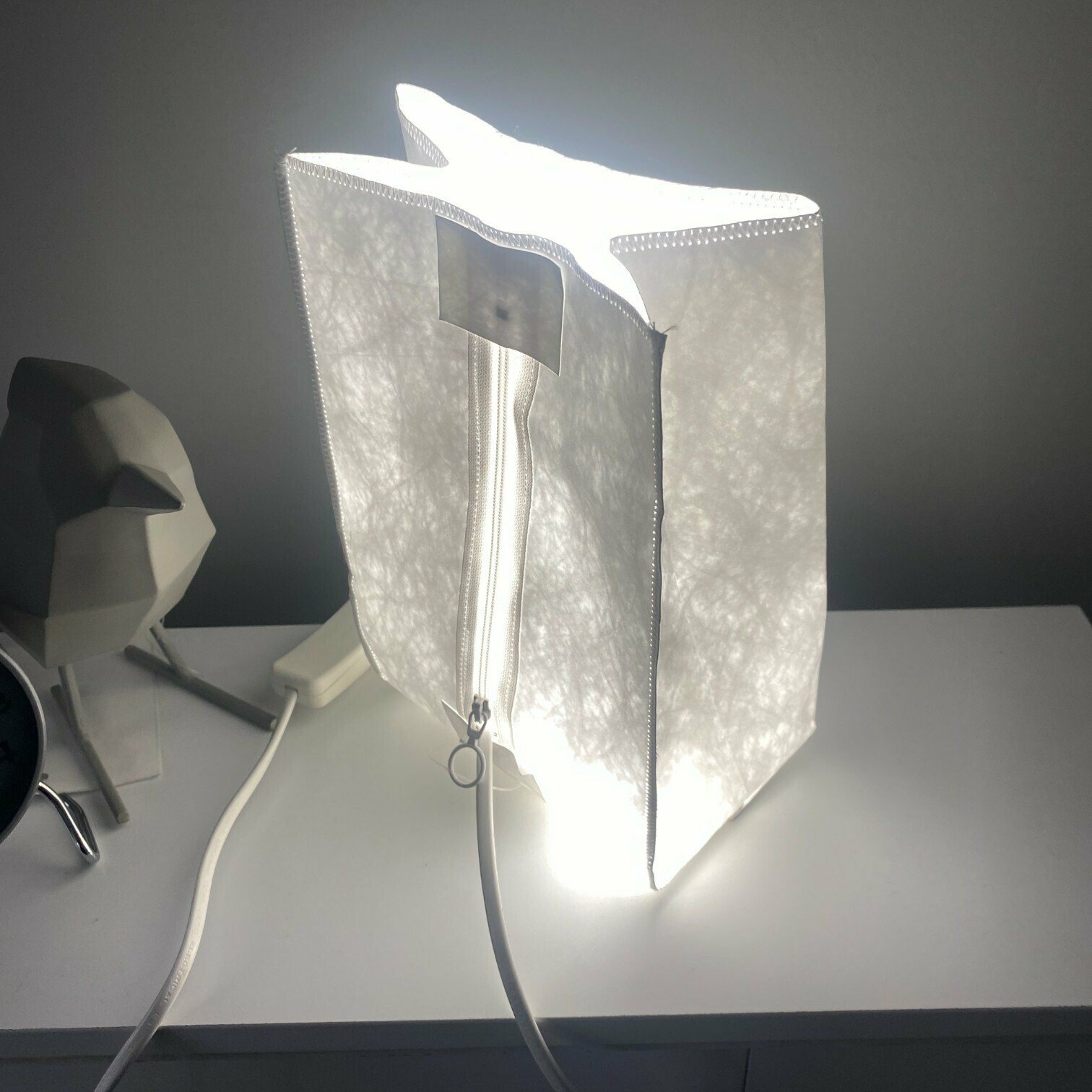 Papīra maiss kā galda lampa. Sniedz neparastu papildinājumu interjeram. Dienas gaismā tas izskatās kā balts dāvanu maiss, bet vakarā no tā izstarojas gaisma, kas ir pieklusināta un sniedz noskaņu.