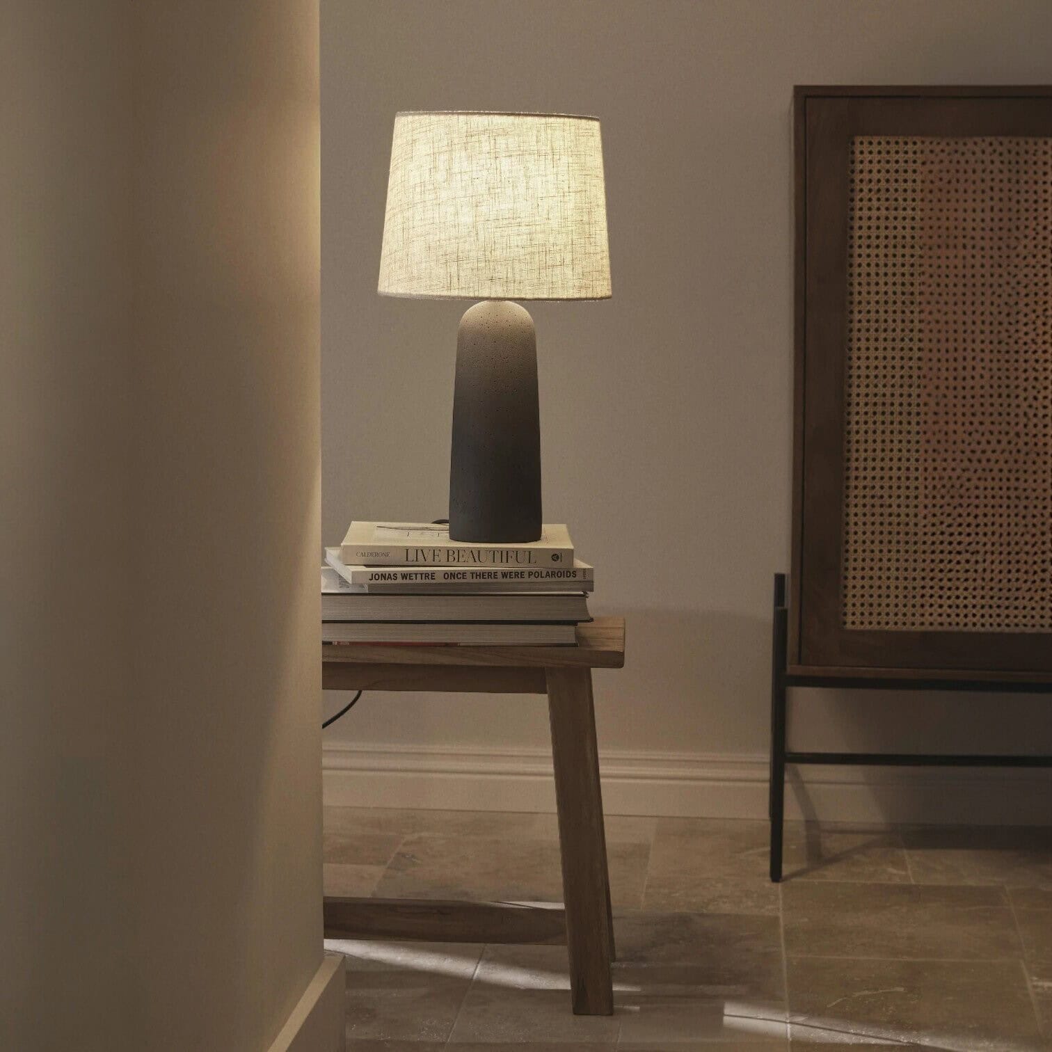 Galda lampa Kaya ar masīvu betona pamatni apvieno industriālu raksturu un mūsdienīgu eleganci. Tās stabilā forma un materiālu kontrasts piešķir interjeram izteiksmīgu akcentu, vienlaikus saglabājot tīru un lakonisku dizainu.