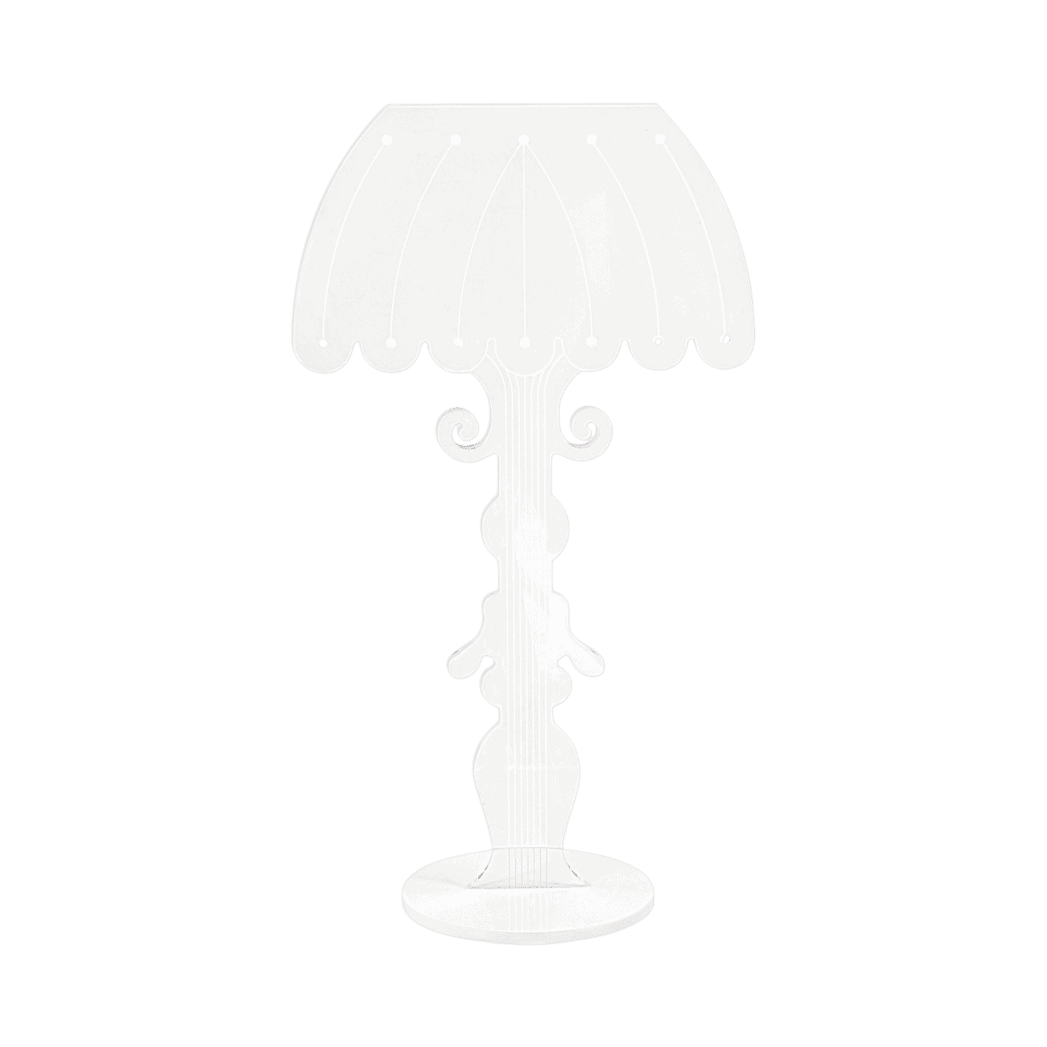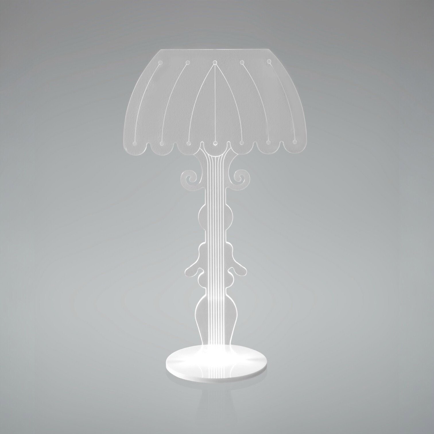 Galda lampa Madame ar plūdenām, renesanses stilā ieturētām līnijām, izgatavota no 100% jauna PMMA pleksiglasa polimēra. Lampa aprīkota ar LED apgaismojumu, kas, pateicoties akrila kristāla īpašībām, vienmērīgi izkliedē gaismu un izceļ izsmalcināto formas siluetu.