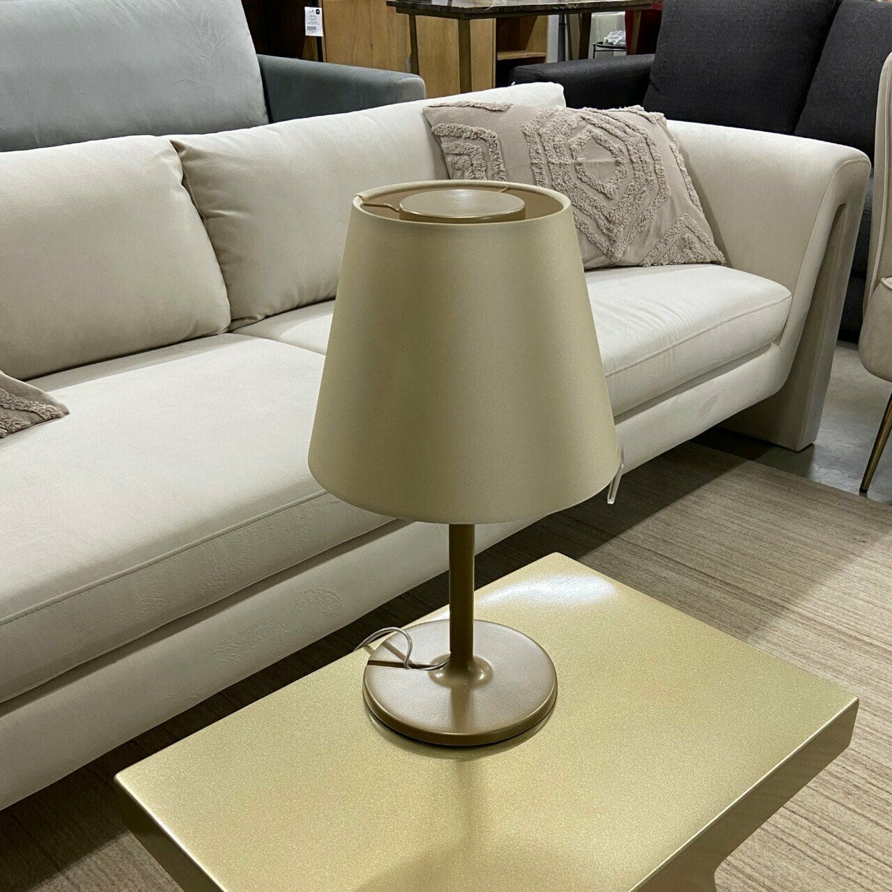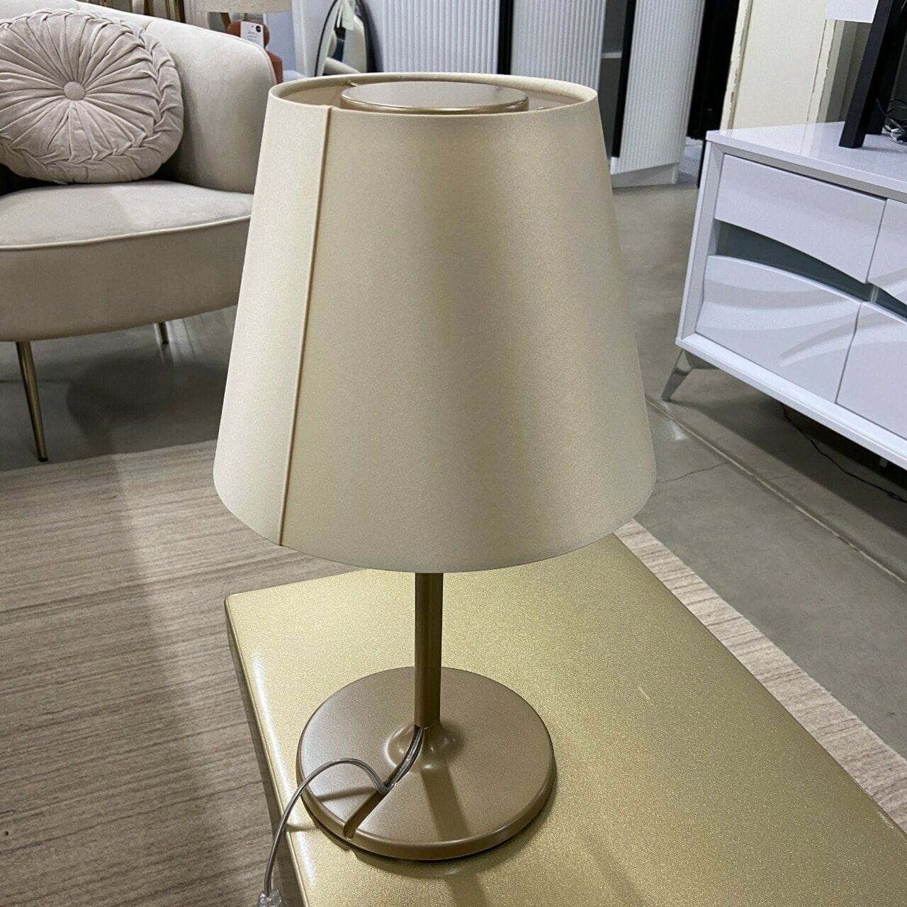Melampo Notte izceļas arī ar izmantotajiem materiāliem. Konstrukcija izgatavota no alumīnija, bet pamatne no lakota metāla. Abažūrs ir pārklāts ar bronzas zīda satīnu, kas, ieslēdzot lampu, kļūst netieši balts.