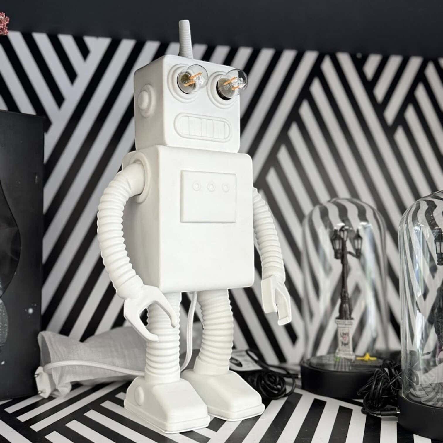 Galda lampa Robot ir rotaļīgs un oriģināls dizaina akcents, kas piešķir jebkurai telpai unikālu raksturu. Veidots kā stilizēts retro robotizēts tēls ar izteiksmīgām detaļām, šī lampa apvieno rotaļīgu estētiku ar funkcionālu apgaismojumu. Robota “acis” ir spuldzes, kas nodrošina patīkamu gaismu un vienlaikus kļūst par dekoratīvu uzmanības piesaistītāju.