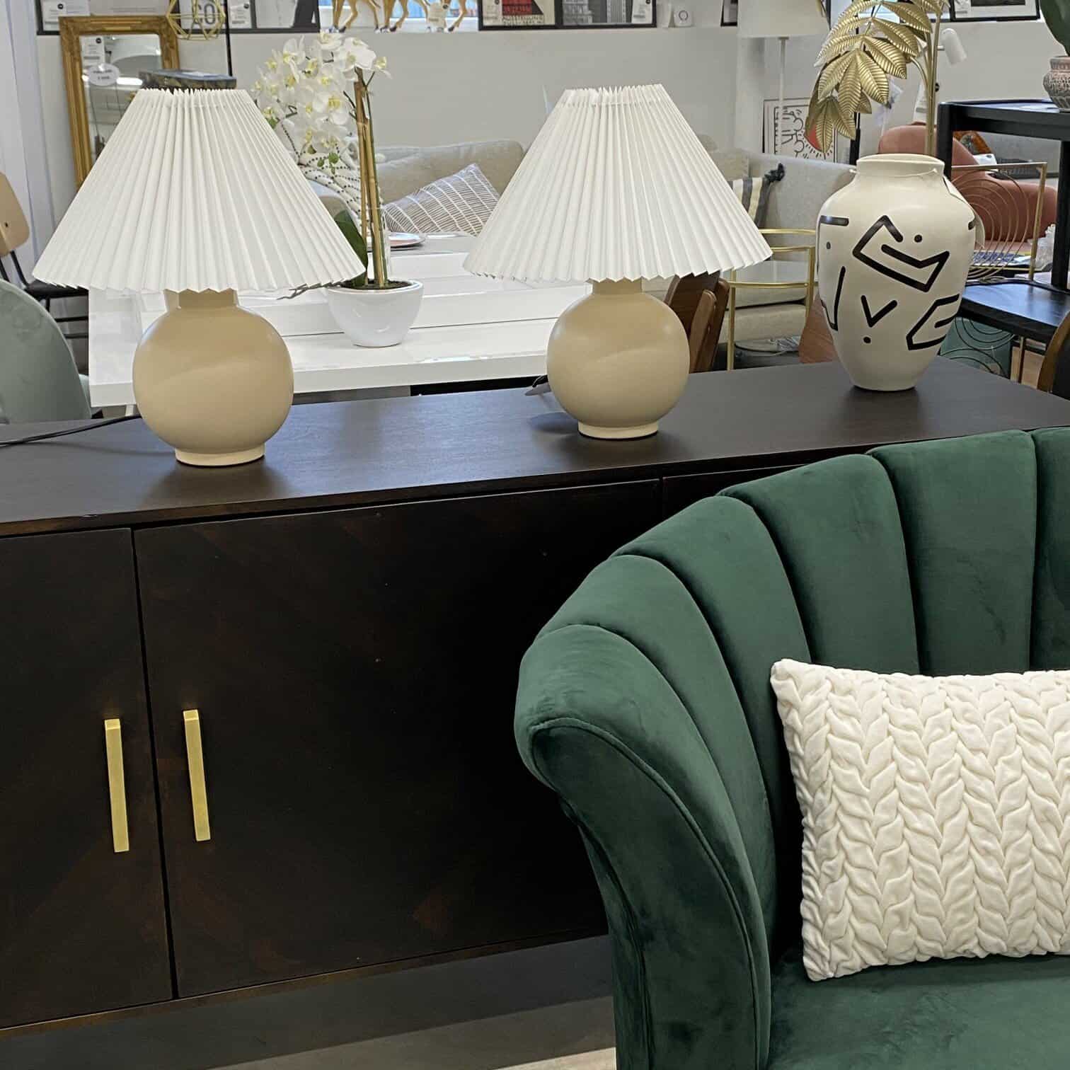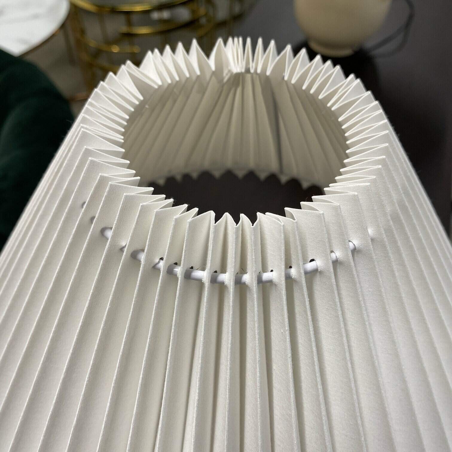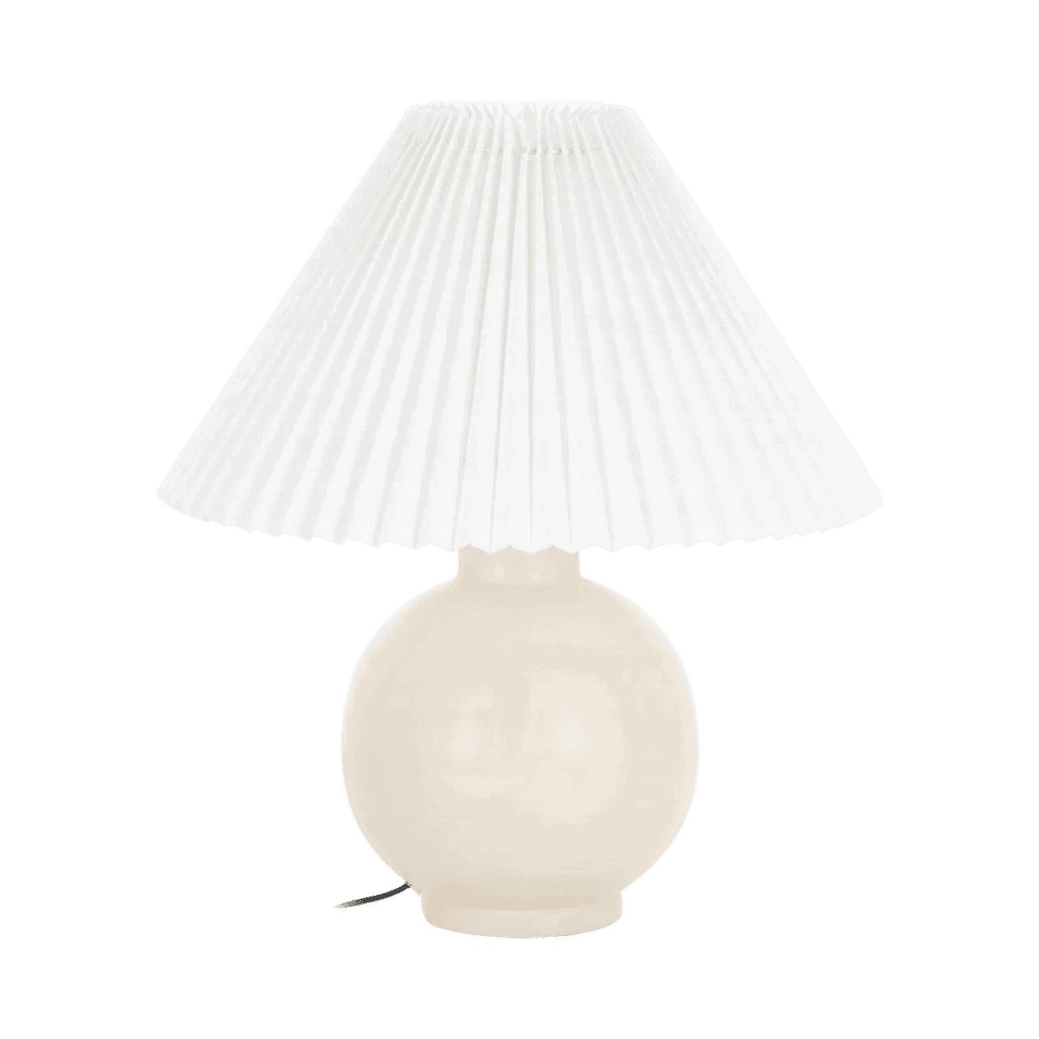 Galda lampa bēšā krāsā no keramikas, ar rievotu auduma abažūru