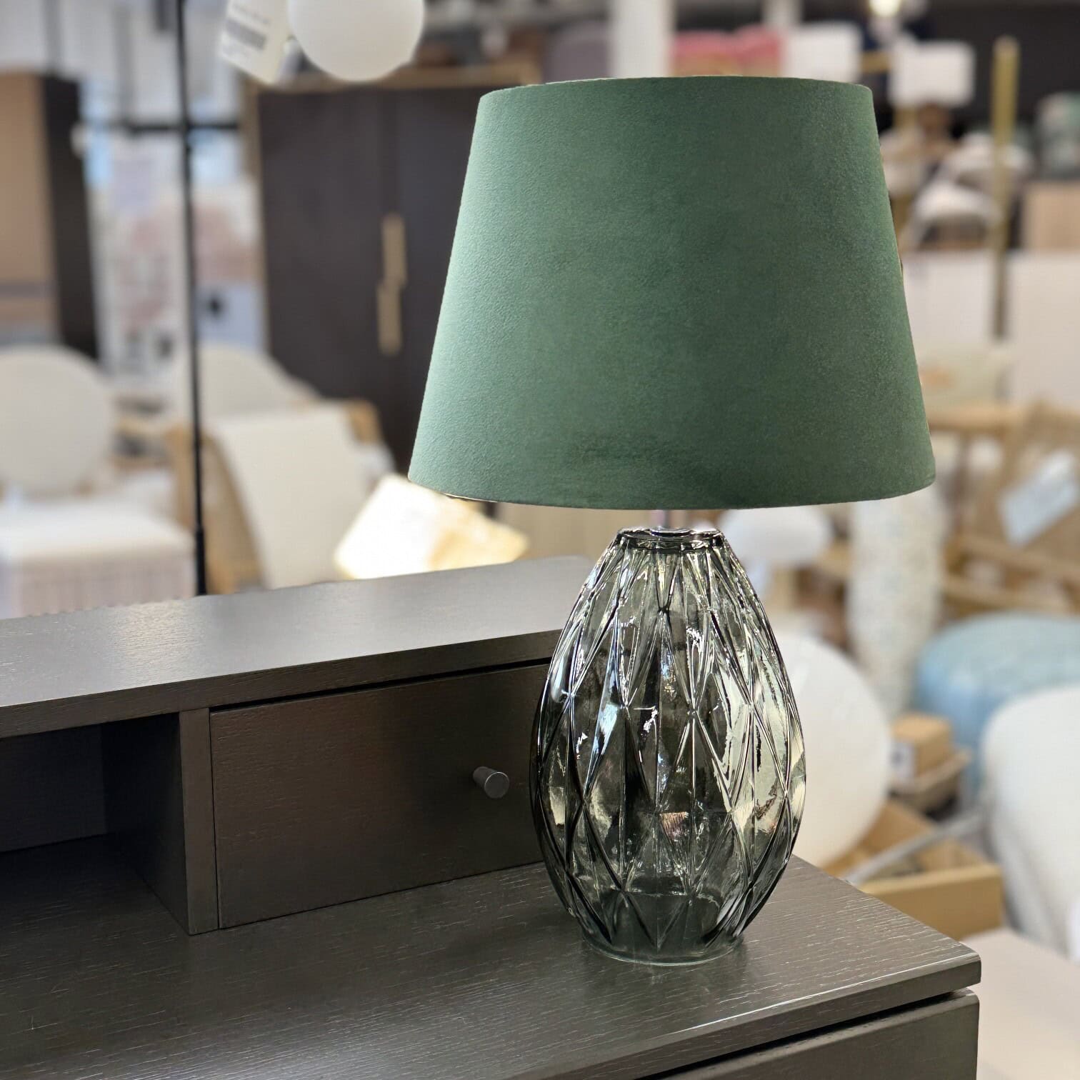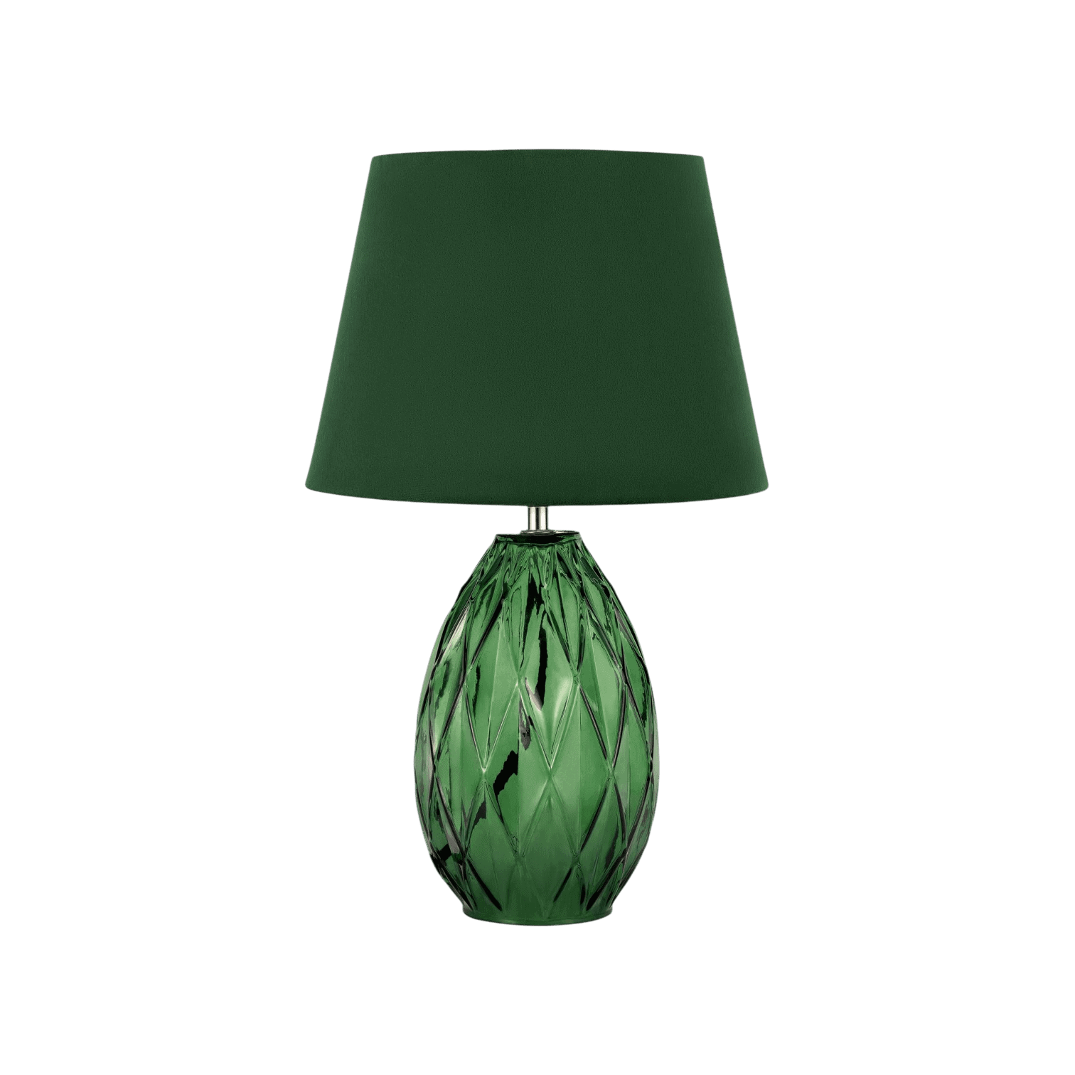 Lampas pamatne ir veidota no augstvērtīga, smaragdzaļa stikla ar reljefu rakstu, kas rada skaistas gaismas spēles. To papildina grezns, mīksts samta auduma kupols piesātināti zaļā tonī.