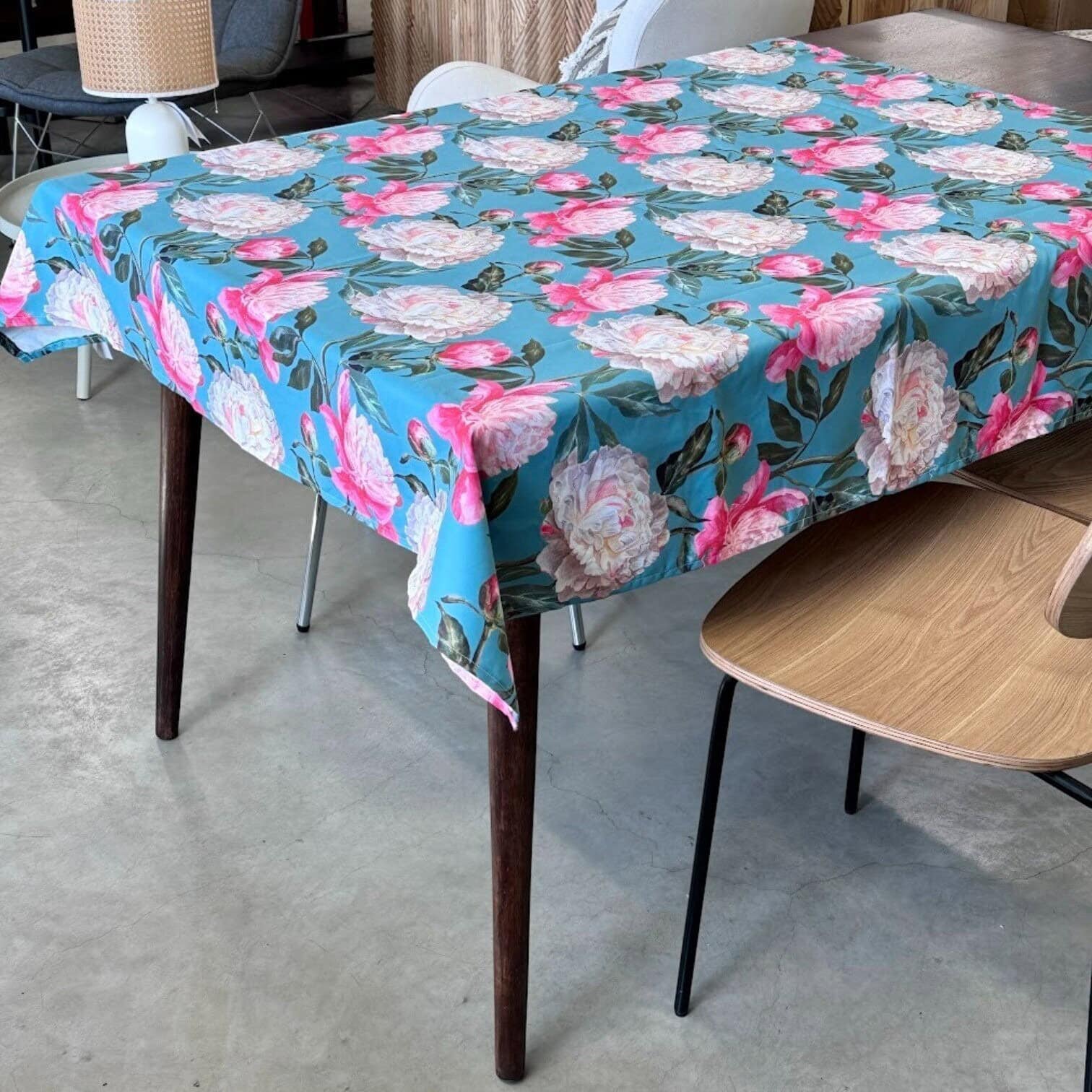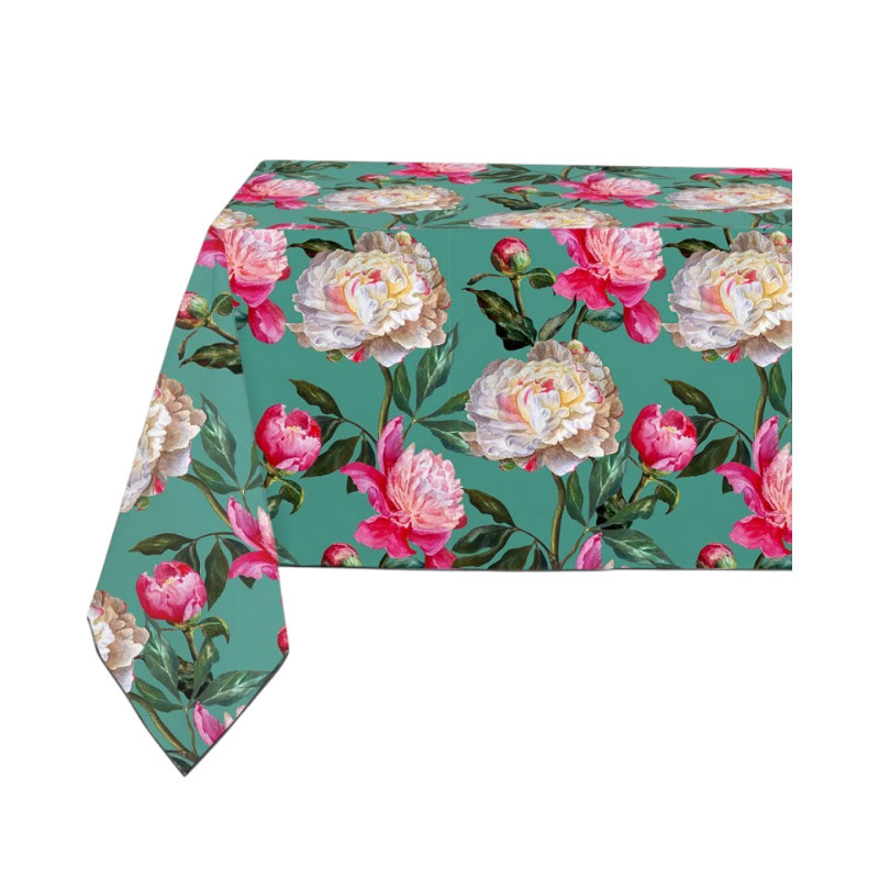 Pievienojiet savam interjeram krāsu un eleganci ar šo skaisto galdautu ar izsmalcinātu peoniju rakstu uz zaļa fona. Izgatavots Spānijā no augstas kvalitātes auduma, tas ir ne tikai estētisks, bet arī praktisks.