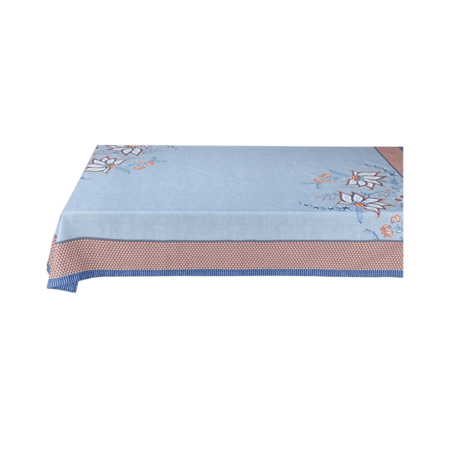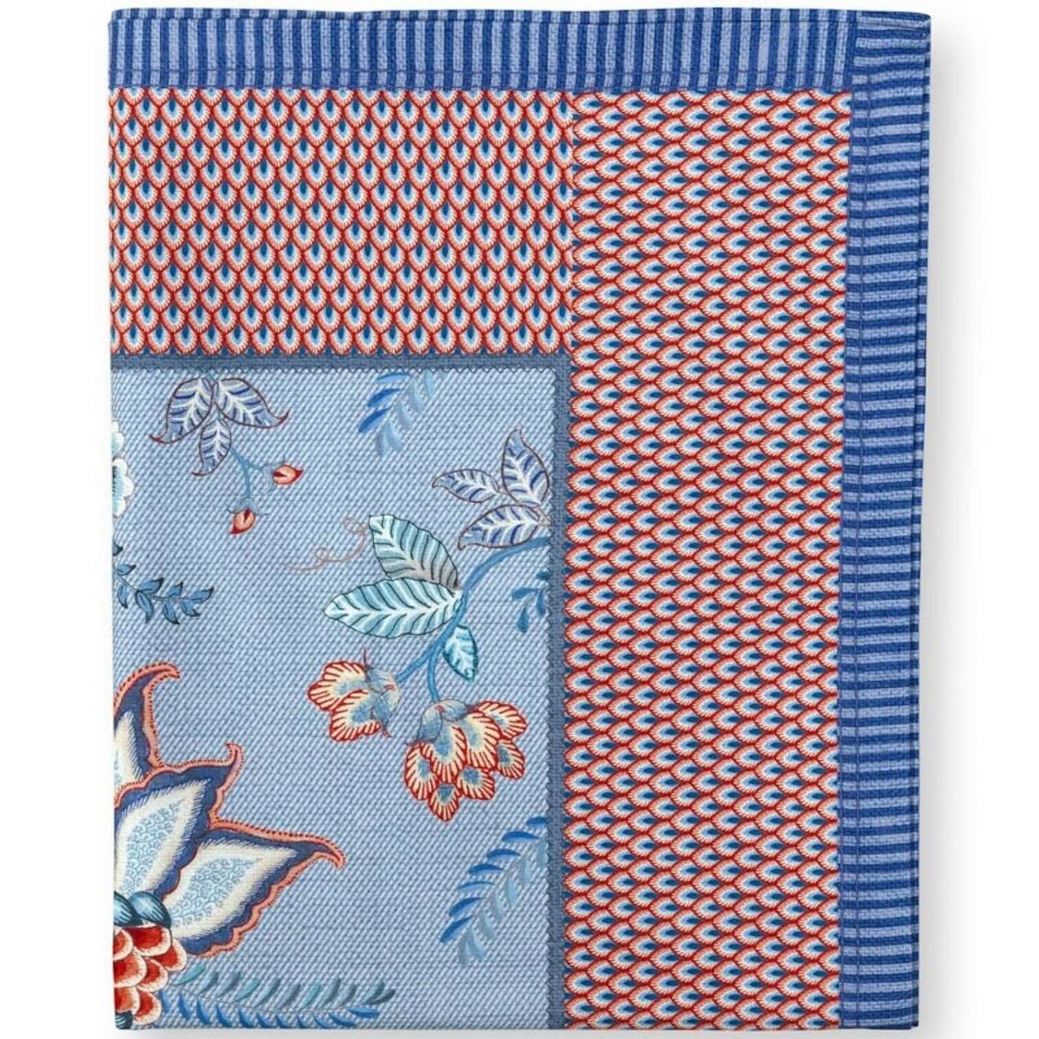 Galda audumam ir zils fons, un tas ir rotāts ar eleganto Flower Festival dizainu. Šis bagātīgais ziedu raksts ietver dažādas izsmalcinātas sarkanās un rozā čincas puķes ar gaiši zilām un zaļām lapām. Rūpīgi izkārtotie ziedu zari ar grezni dekorētiem ziediem un lapām piešķir dizainam īpaši greznu izskatu un sajūtu.