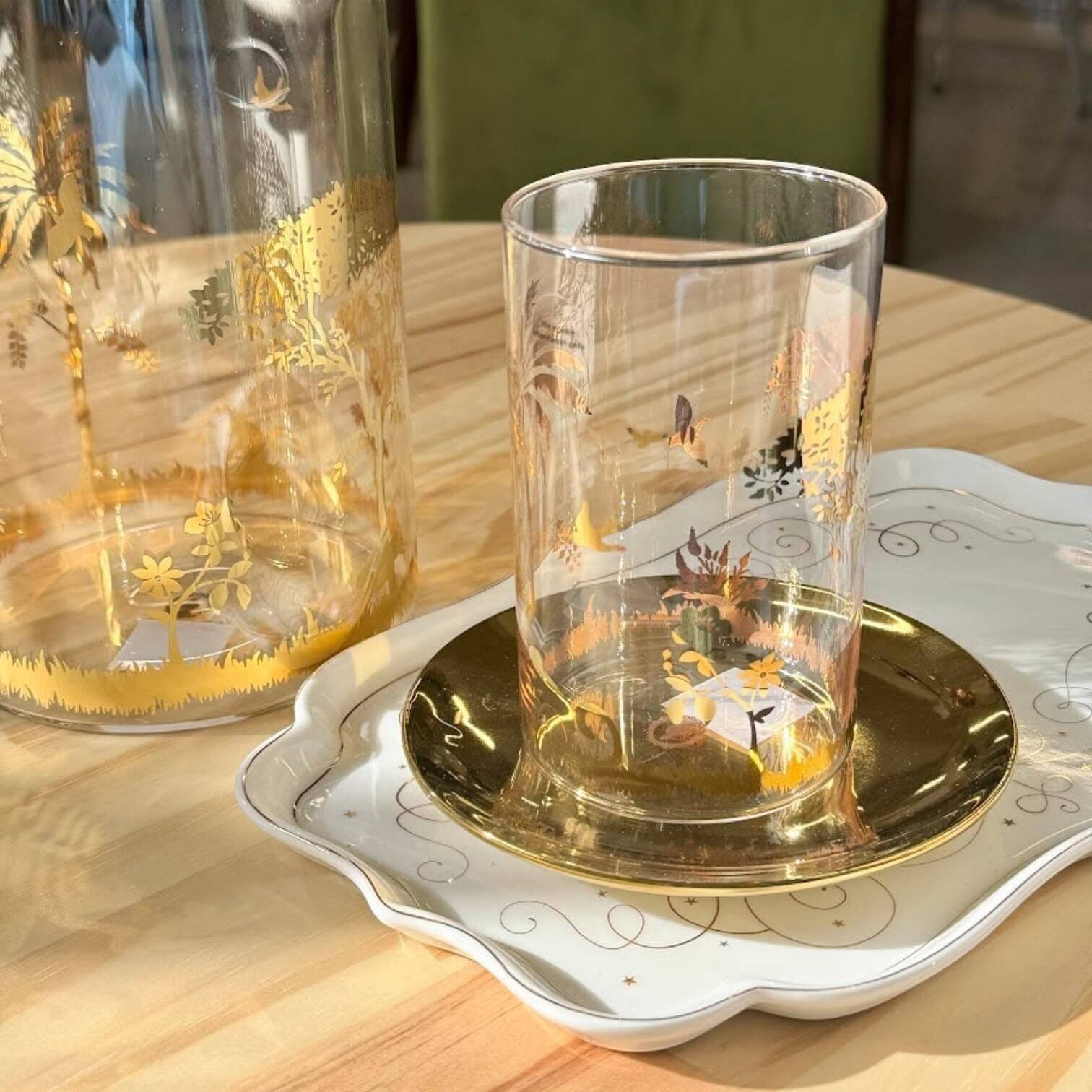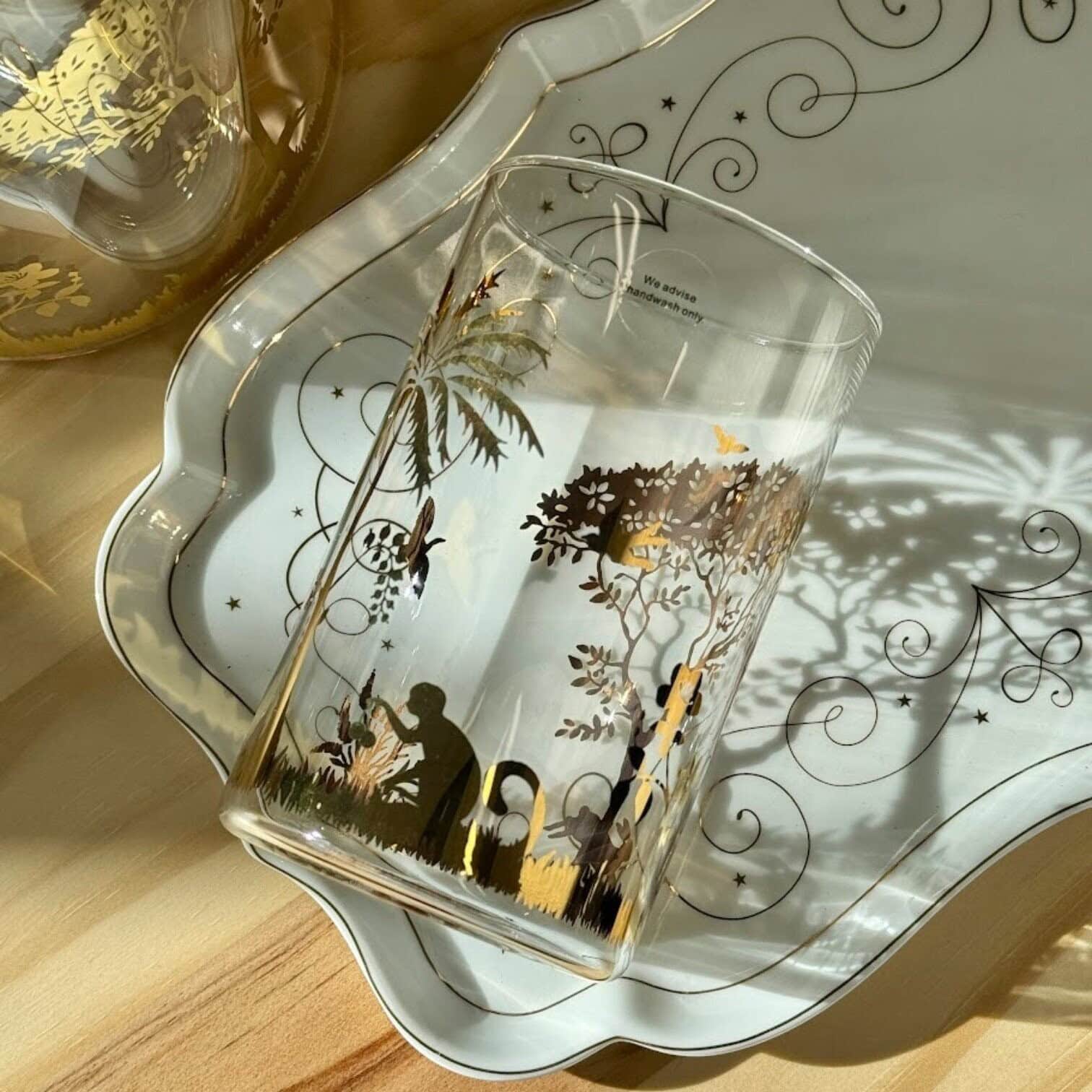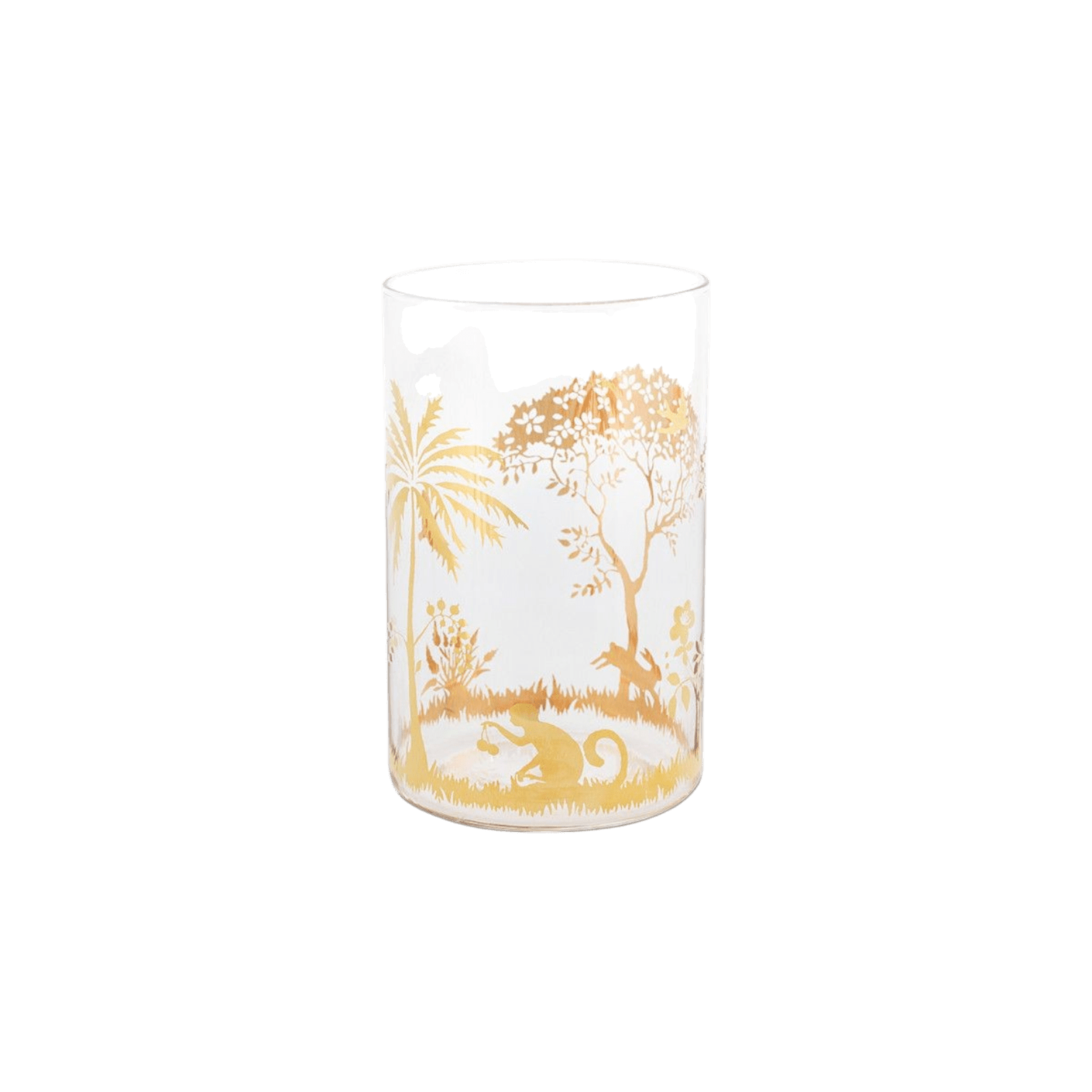 Glāze La Majorelle Gold – dabas iedvesmota elegance. Šī 360 ml ūdens glāze no La Majorelle kolekcijas apvieno izsmalcinātību un eksotisku šarmu. To rotā smalki zelta ziedi, dzīvnieki un skaisti koku motīvi, piešķirot katram malkam īpašu noskaņu.
