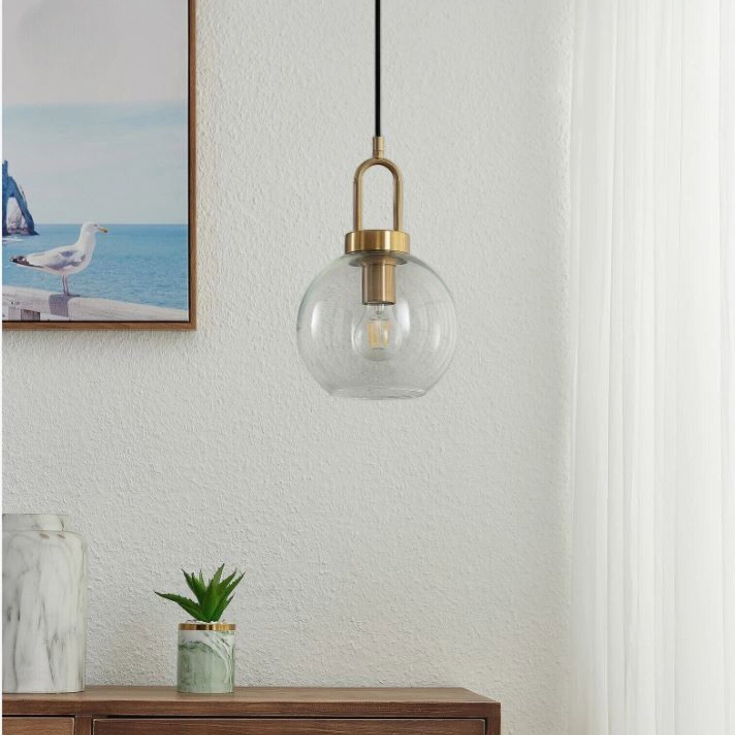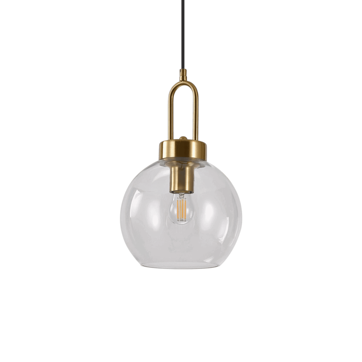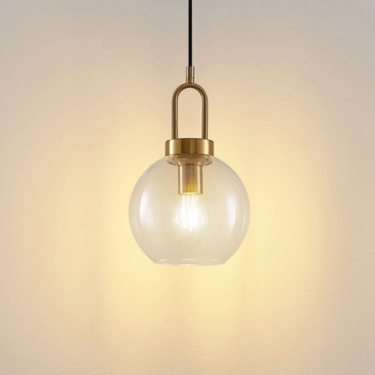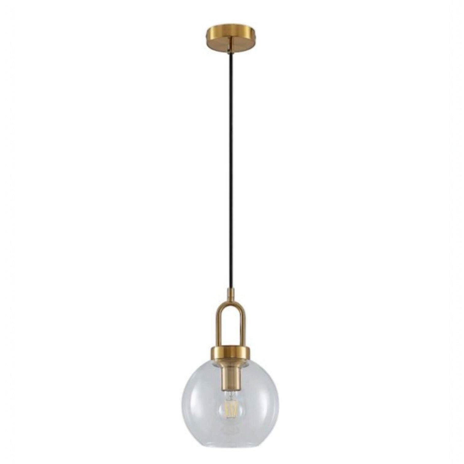 Eleganta un mūsdienīga griestu lampa, kas lieliski papildinās gan klasisku, gan modernu interjeru. Lampa izceļas ar minimālistisku dizainu- smalka melna vada kombinācija ar zeltīta metāla akcentiem piešķir telpai izsmalcinātību, savukārt caurspīdīgais stikla kupols ļauj gaismai brīvi izplatīties, radot patīkamu un mājīgu atmosfēru.