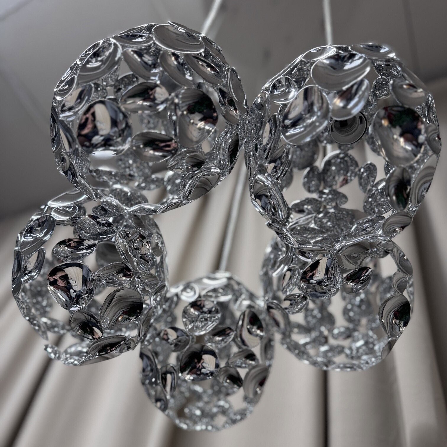 Griestu lampa Ada apvieno modernu eleganci ar vieglu, gaisīgu dizainu. Baltā metāla griestu pamatne rada tīru un harmonisku pamatu, kas ļauj mirdzošajiem kupoliem kļūt par galveno interjera akcentu. Pieci hromēta metāla kupoli ar kristālam līdzīgu faktūru skaisti lauž gaismu, piešķirot telpai izsmalcinātu spīdumu un dzīvīgumu.